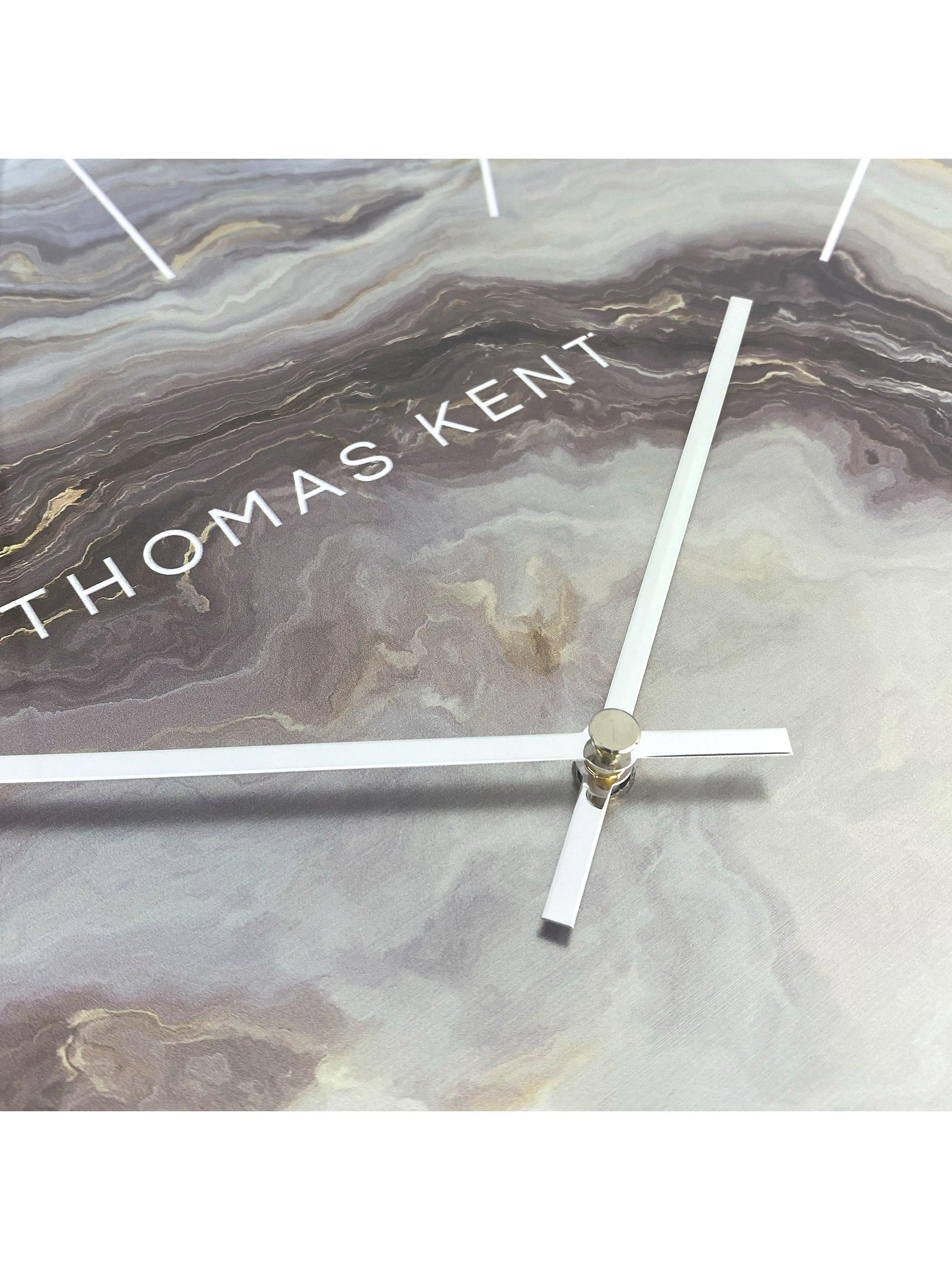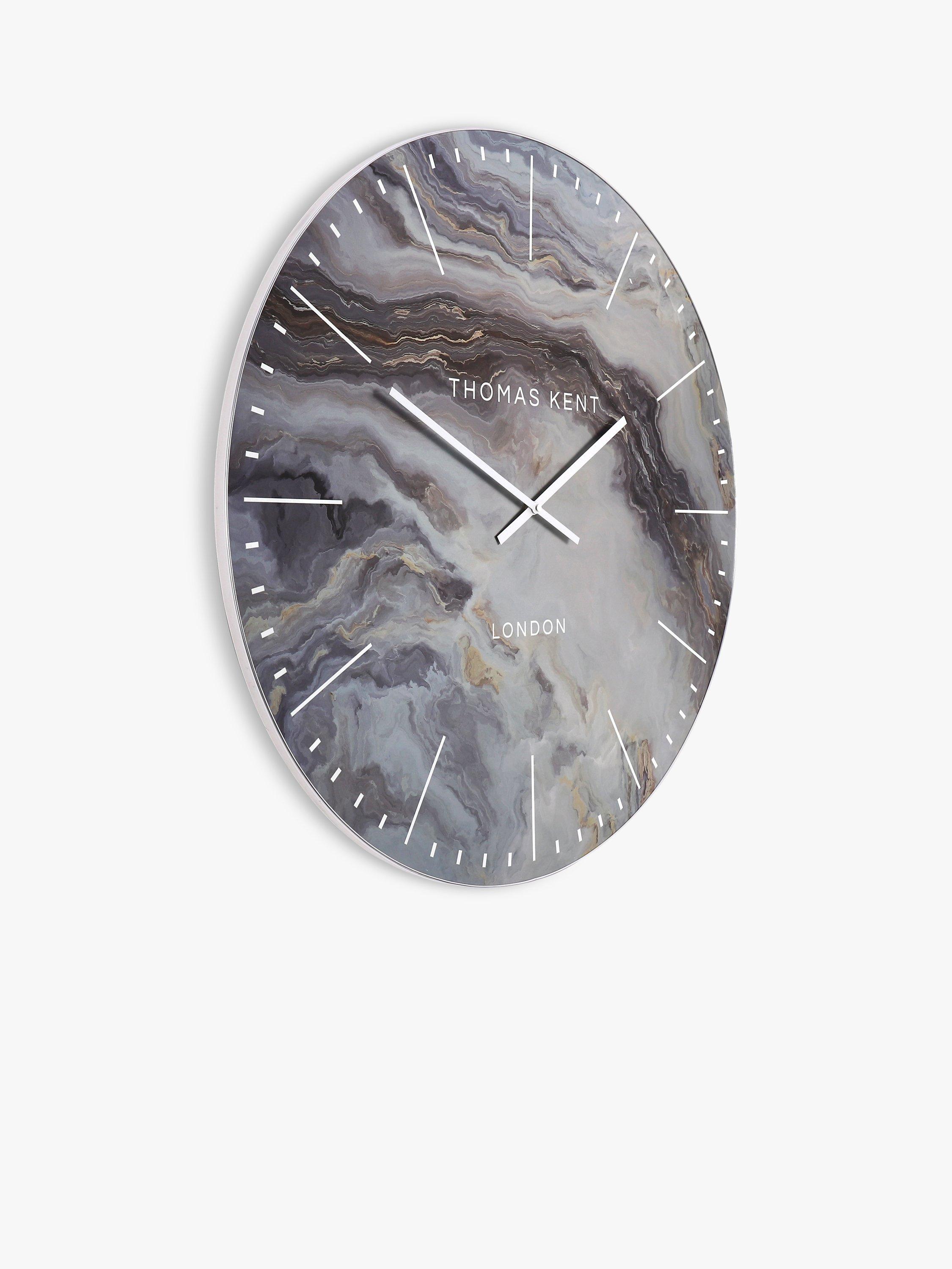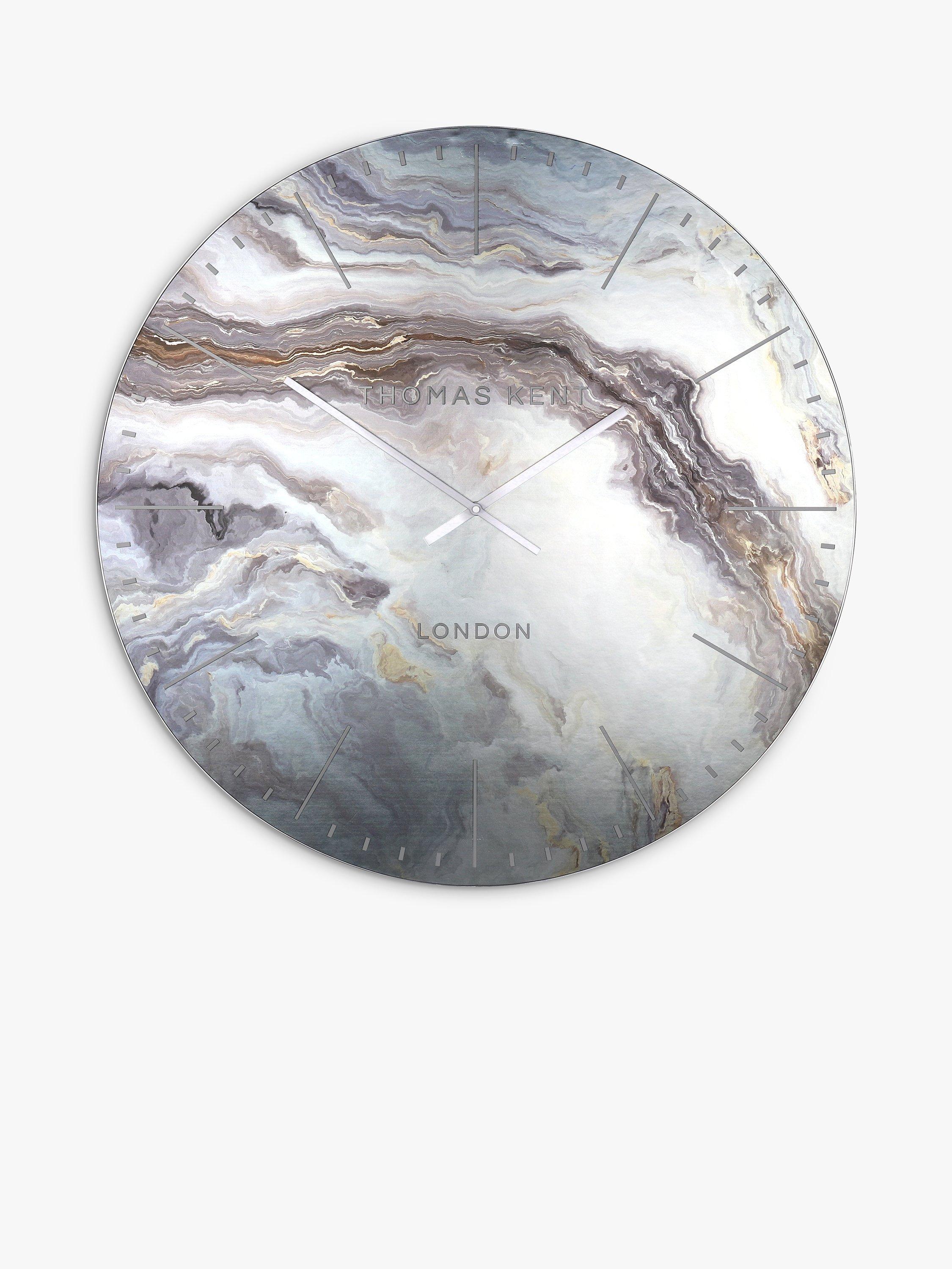 A contemporary Oyster wall clock from Thomas Kent with an abstract mineral-like clock face and contrasting hour markers, metallic rim and hands.