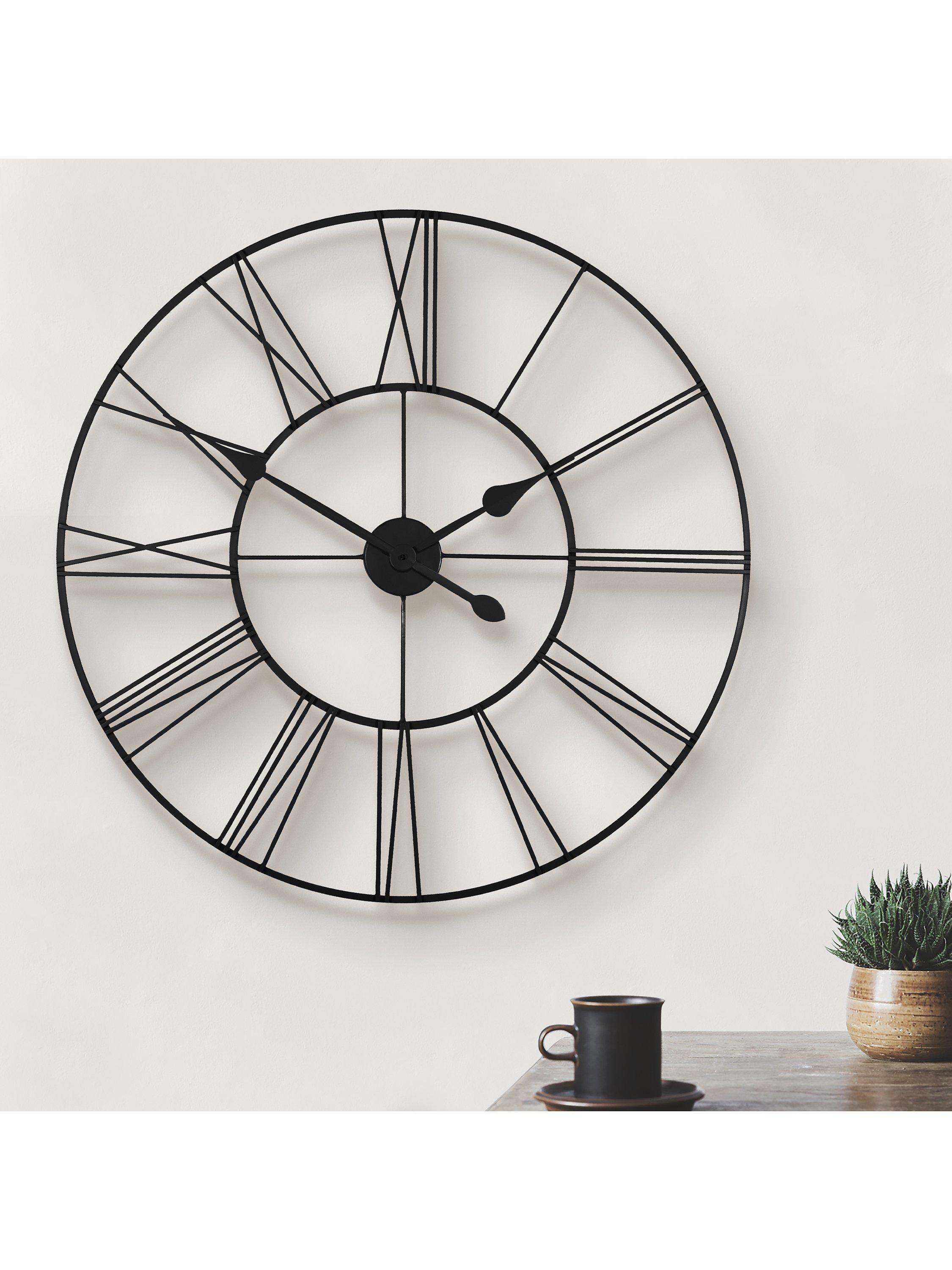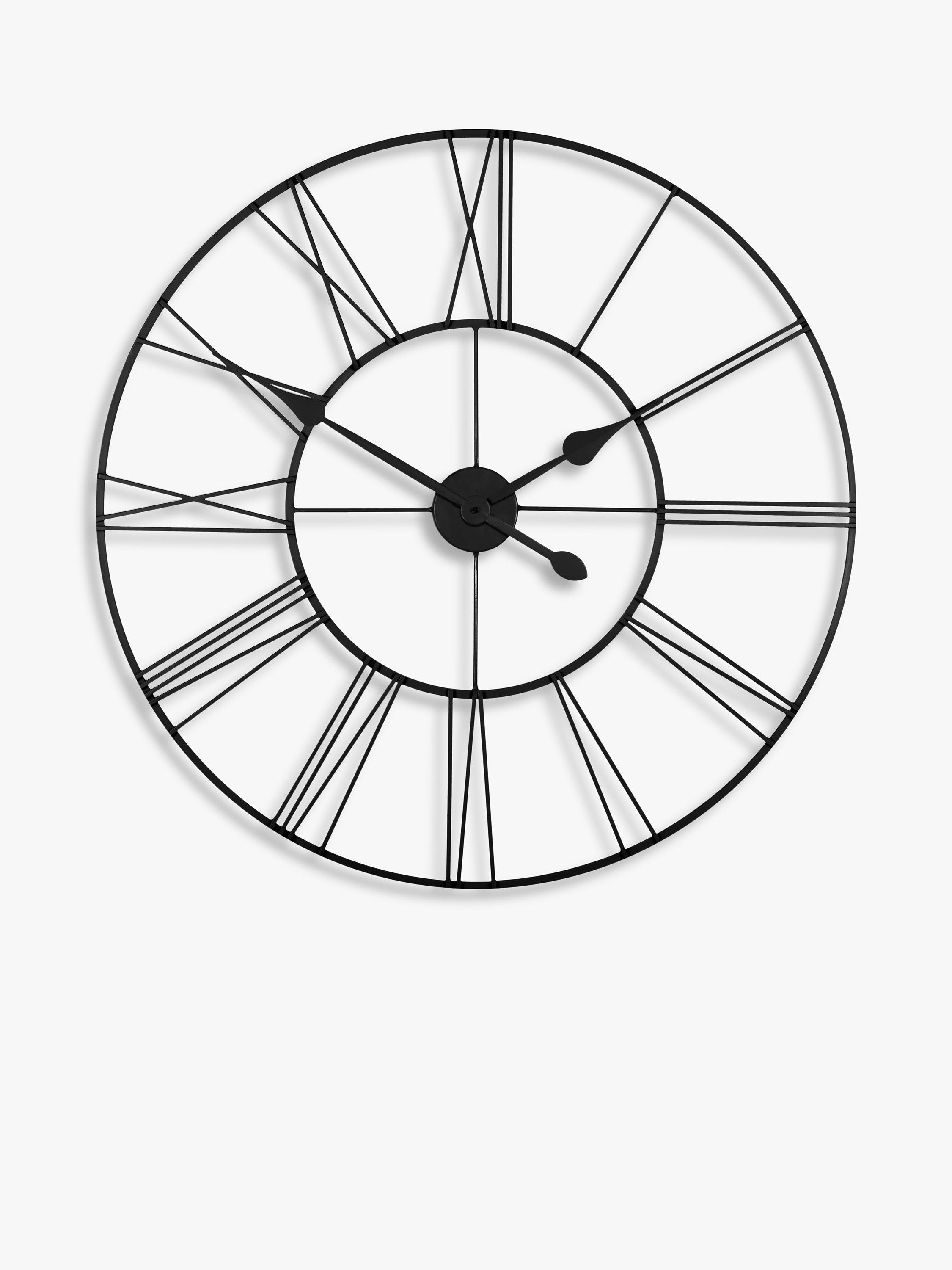 This waterproof wall clock is suitable for indoor and sheltered outdoor use. It has a removable weather-resistant cover for the mechanism on the back of the clock, concealing a high-torque movement to withstand high winds. The skeleton design with Roman numerals allows brick work or wall decor to show through the iron frame.