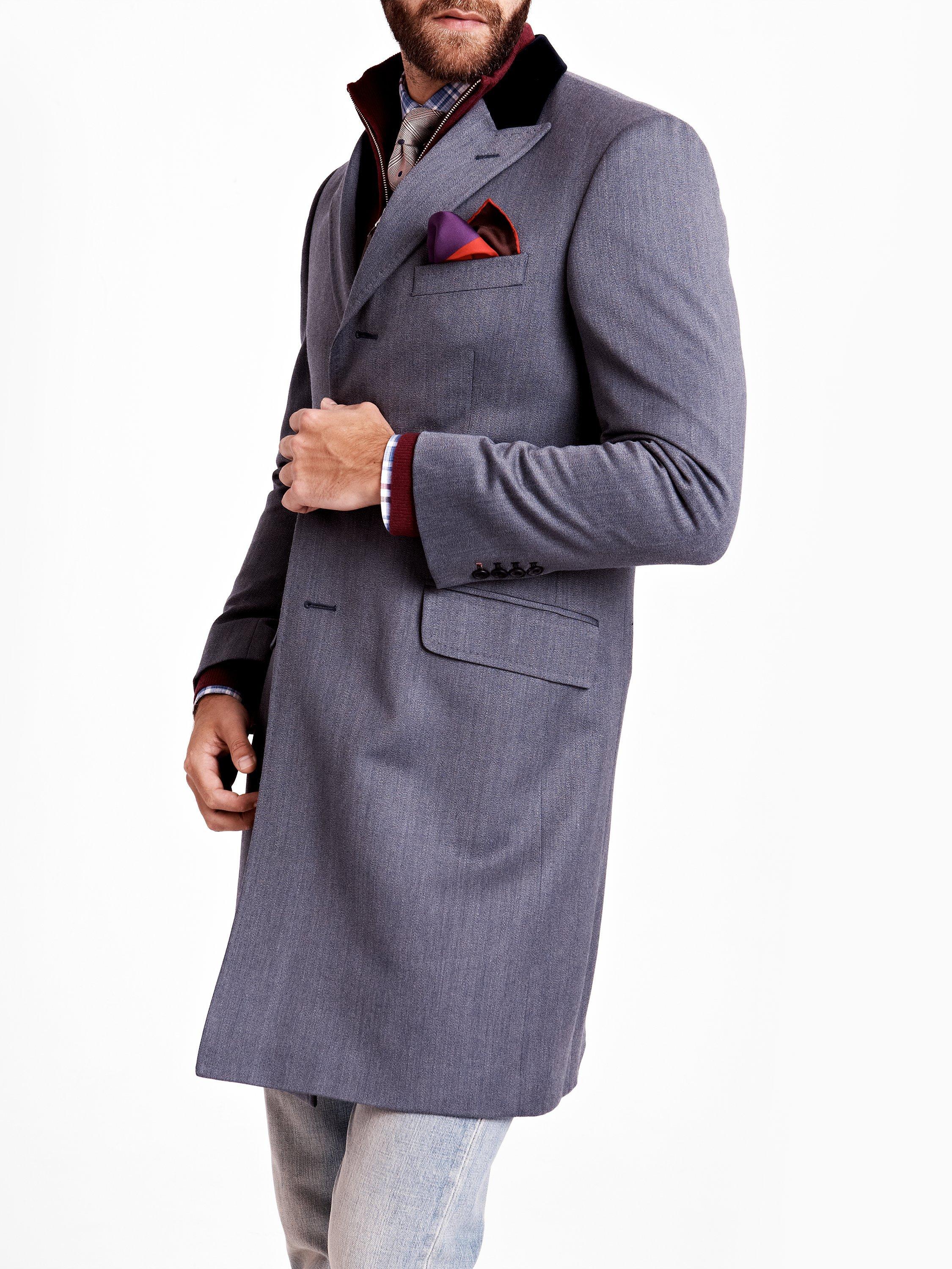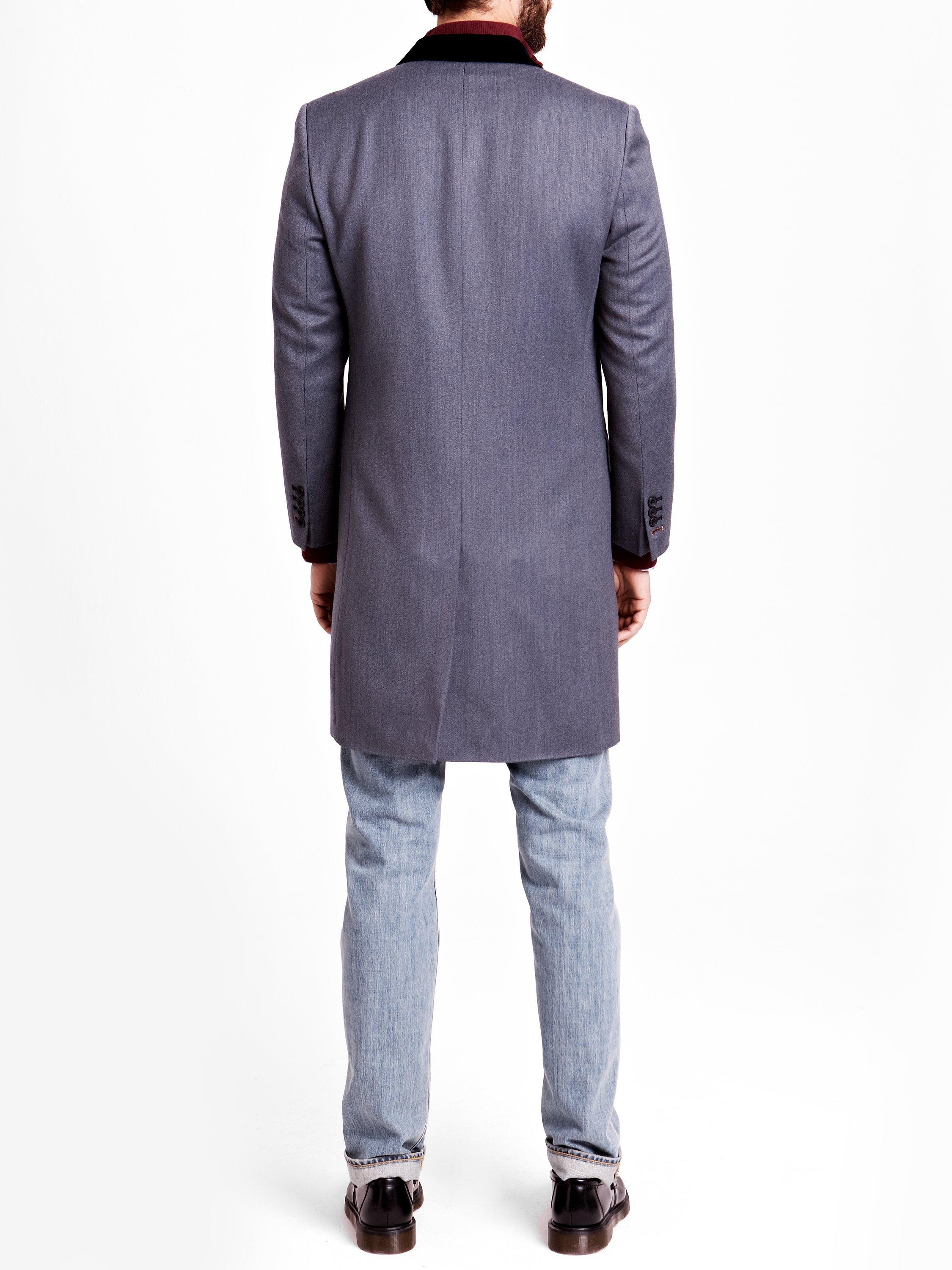 The coat comes to the knee, sports a toning velvet collar, working cuffs and and a melton insert underneath the collar.