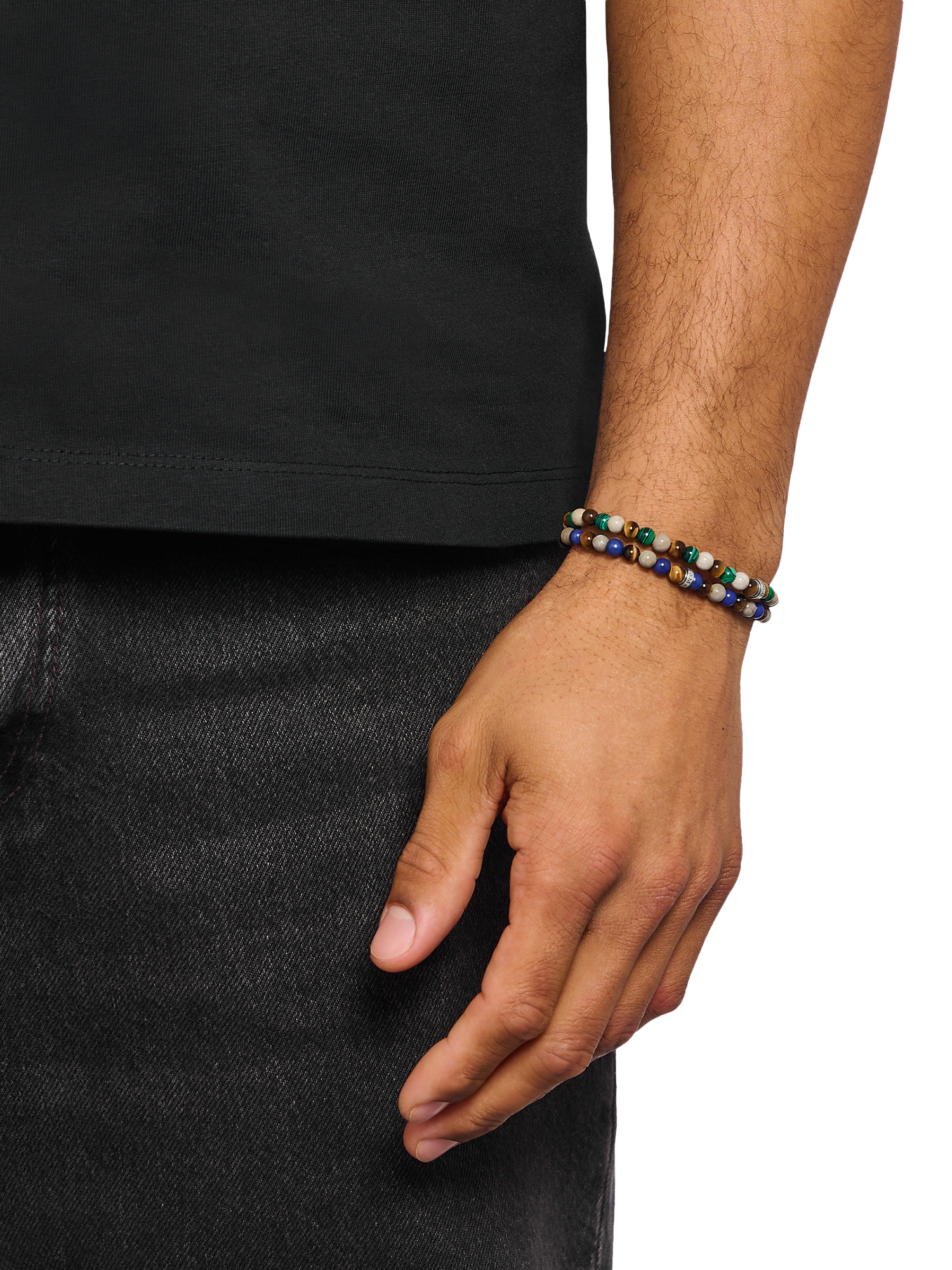 From the Rebel at Heart collection, this stretch bracelet features five natural stone beads in daisy jasper, imitation lapis lazuli and tiger's eye. Finished with a blackened 925 sterling silver logo ring engraved with THOMAS SABO. Available in 17cm, 19cm and 21cm. Wear and be inspired by the positive energies of the stones. Comes in THOMAS SABO Rebel at Heart packaging.