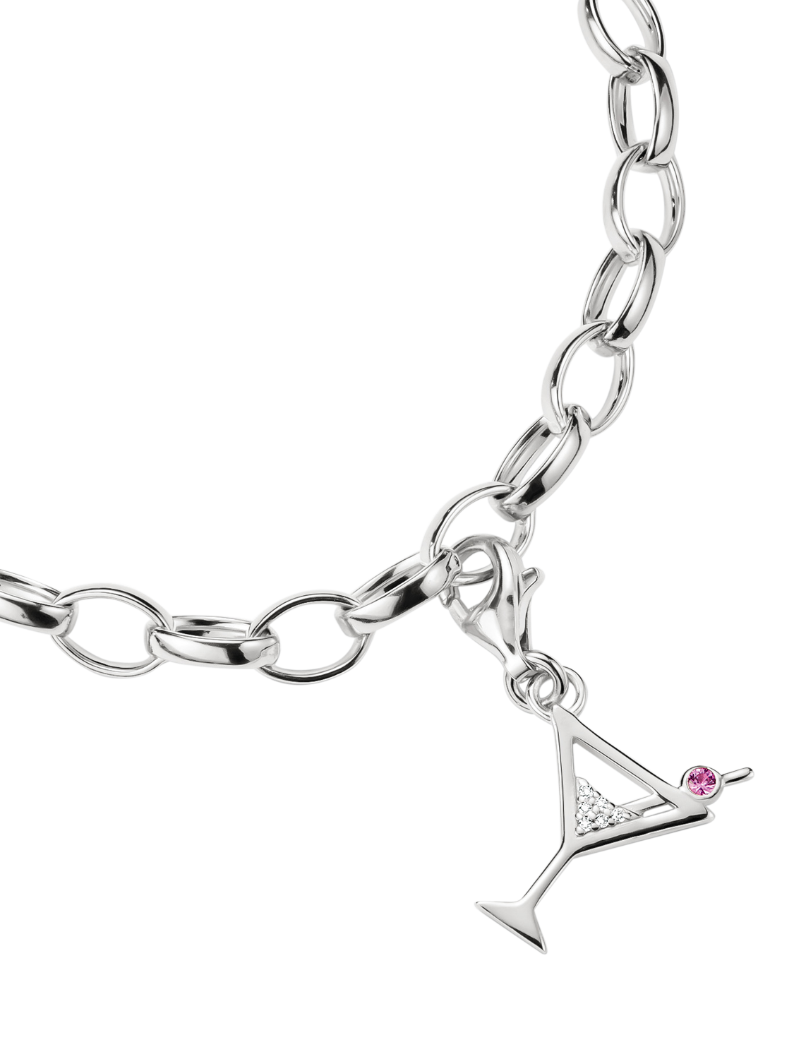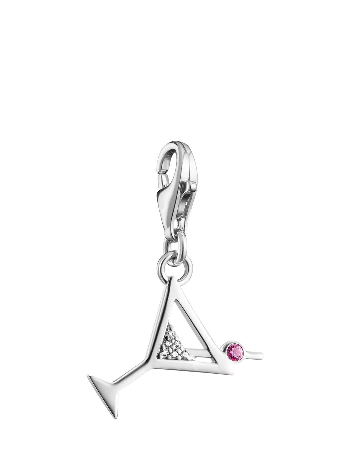 The silver Cocktail Glass Charm with stone embellishment and cut-out design is the perfect accessory for any party.