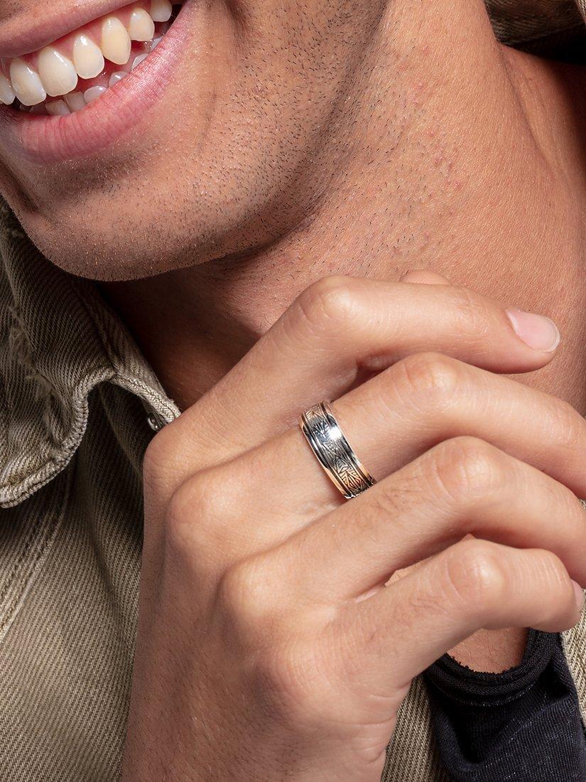 With an androgynous and abstract styling, the ring can easily appeal to men and women alike. Its engraved geometric finish gives it the perfect blend of texture and coolness.