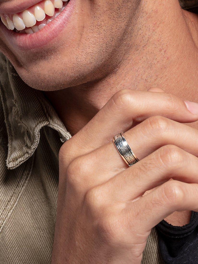 With an androgynous and abstract styling, the ring can easily appeal to men and women alike. Its engraved geometric finish gives it the perfect blend of texture and coolness.