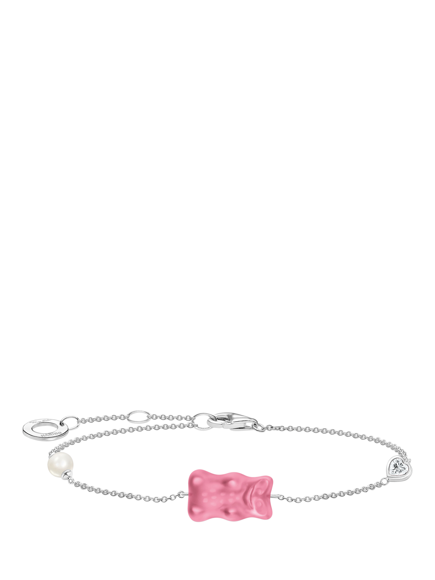 From the THOMAS SABO x HARIBO collection, this playful bracelet features a pink Goldbear crafted from shatterproof frosted crystal glass, alongside a cultured freshwater pearl and heart-cut zirconia stone. With a THOMAS SABO x HARIBO engraving on the reverse. Crafted in 925 sterling silver. Adjustable from 16 to 19cm.
