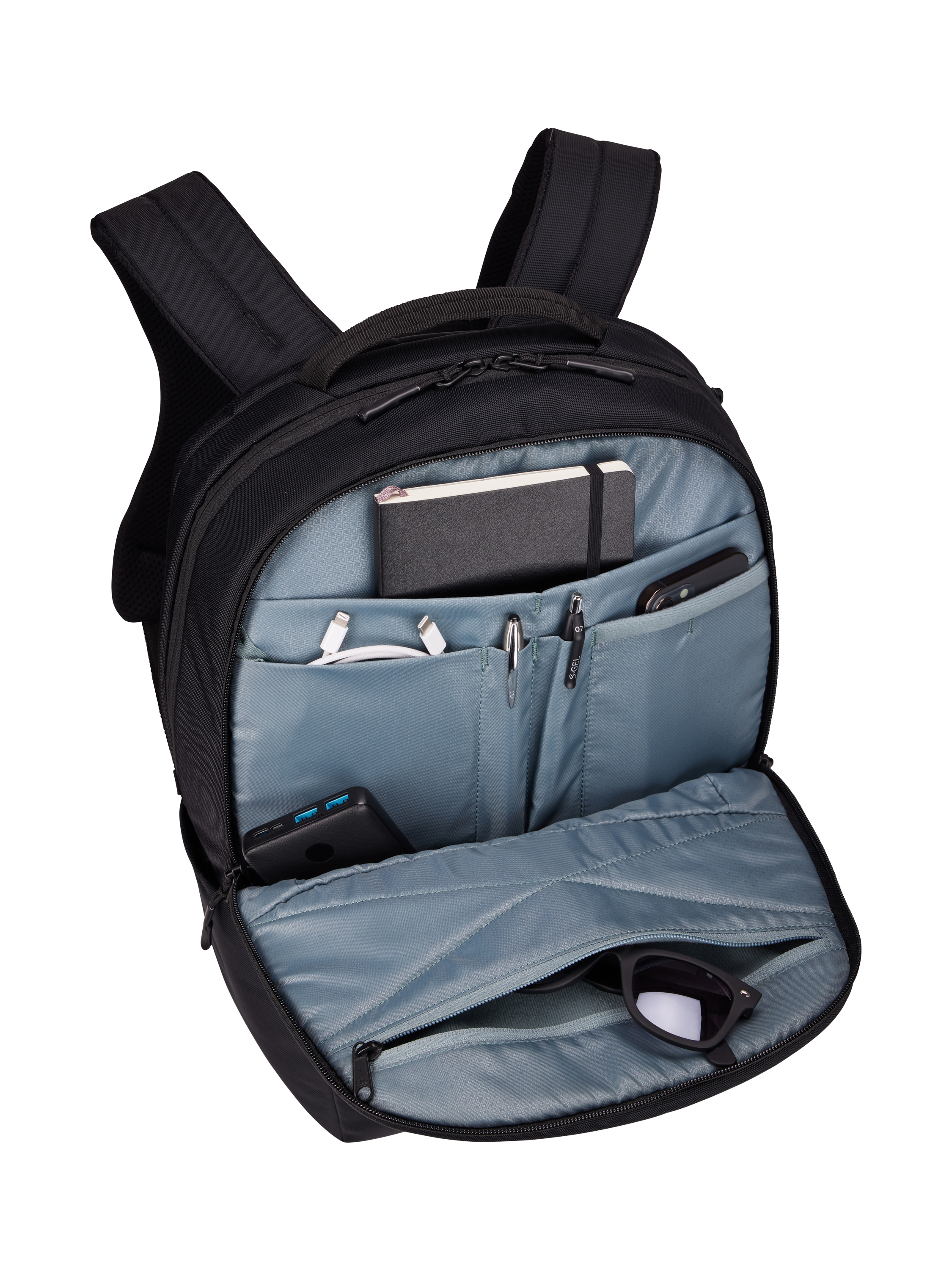 - Interior organization panel keeps pens, cords, keys, and other essentials organized and secure