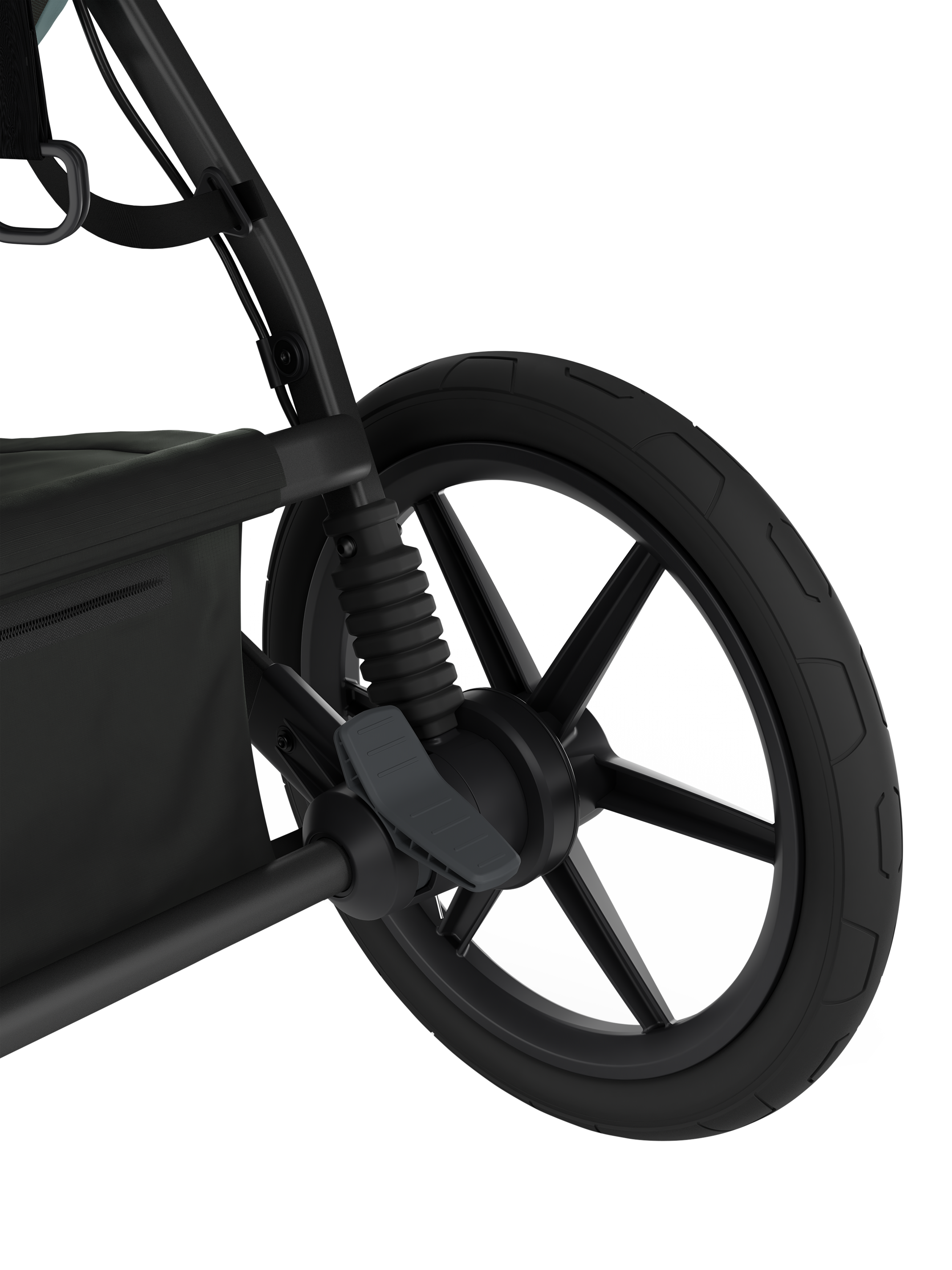 - The swivel front wheel, which locks into place for higher speeds, combined with large rear wheels, makes the stroller lightweight and easy to manoeuvre