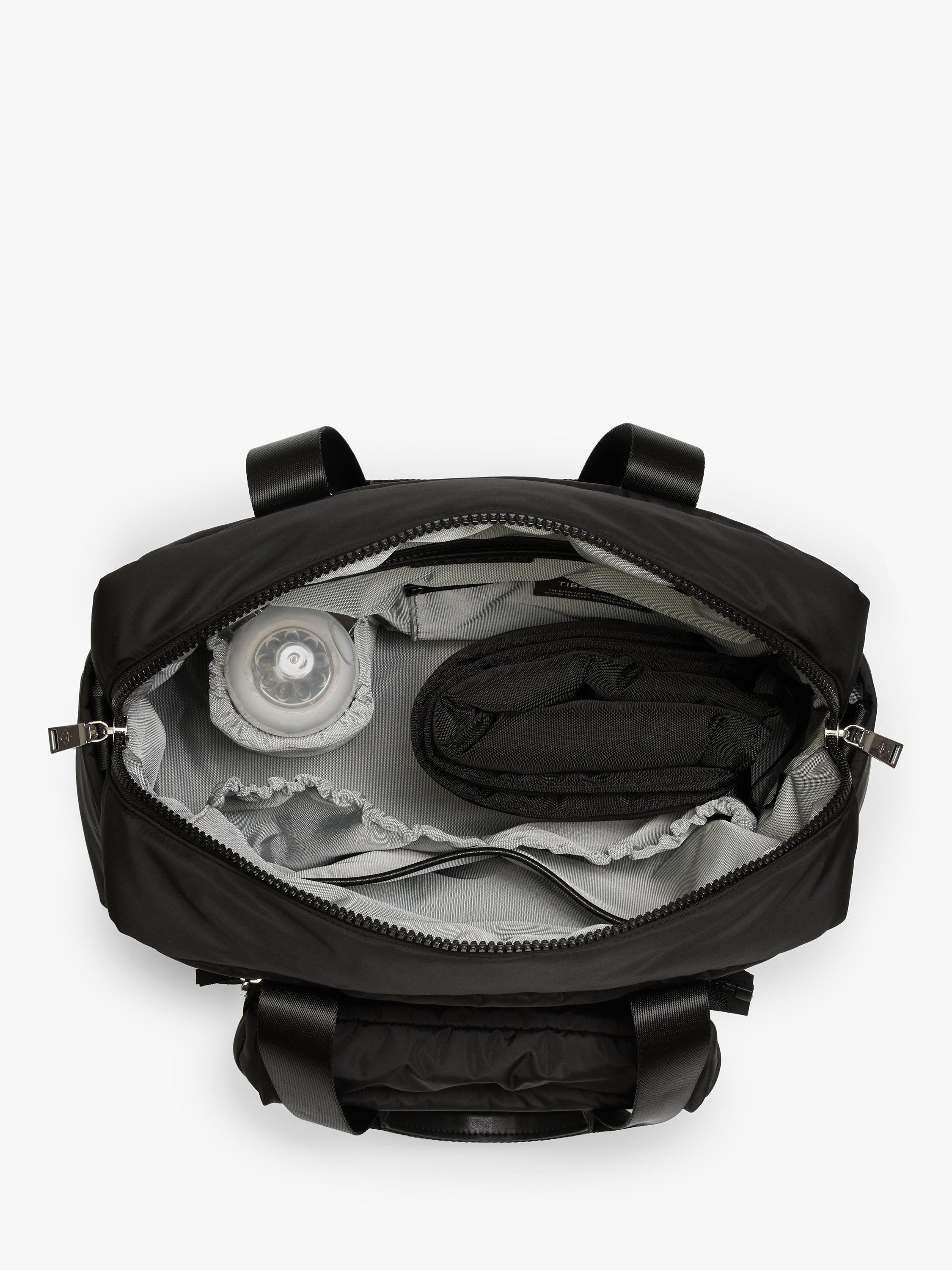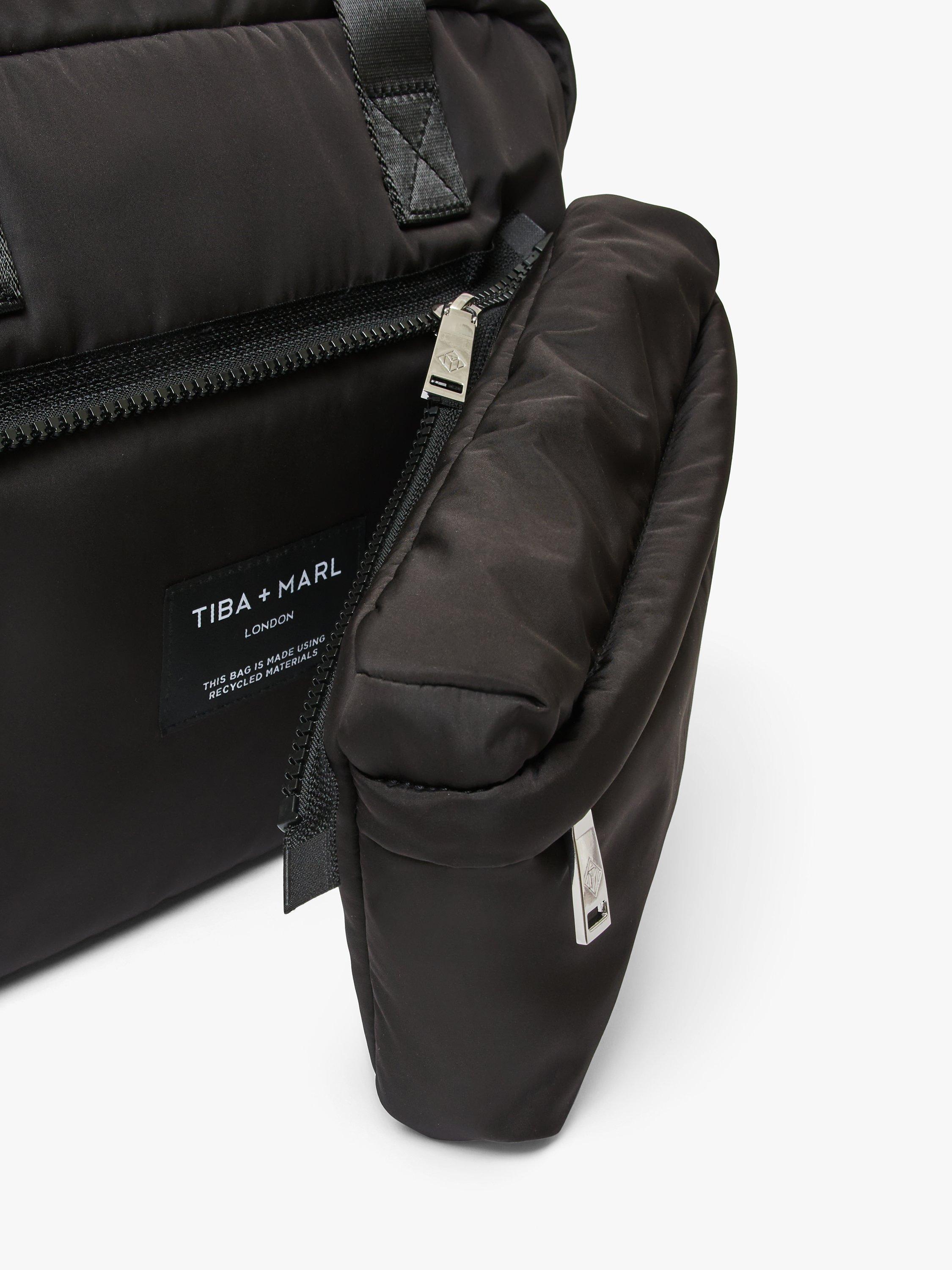 Crafted from water-resistant, recycled padded nylon, it may feel soft and tactile but it sure packs a punch when it comes to functionality. It features a removable front pouch that is ideal for storing your valuables (perfect if the main bag is out of your sight) or equally as good for a small stash of wipes/ nappies and cream if you want to unzip the pouch for quick nappy changes.