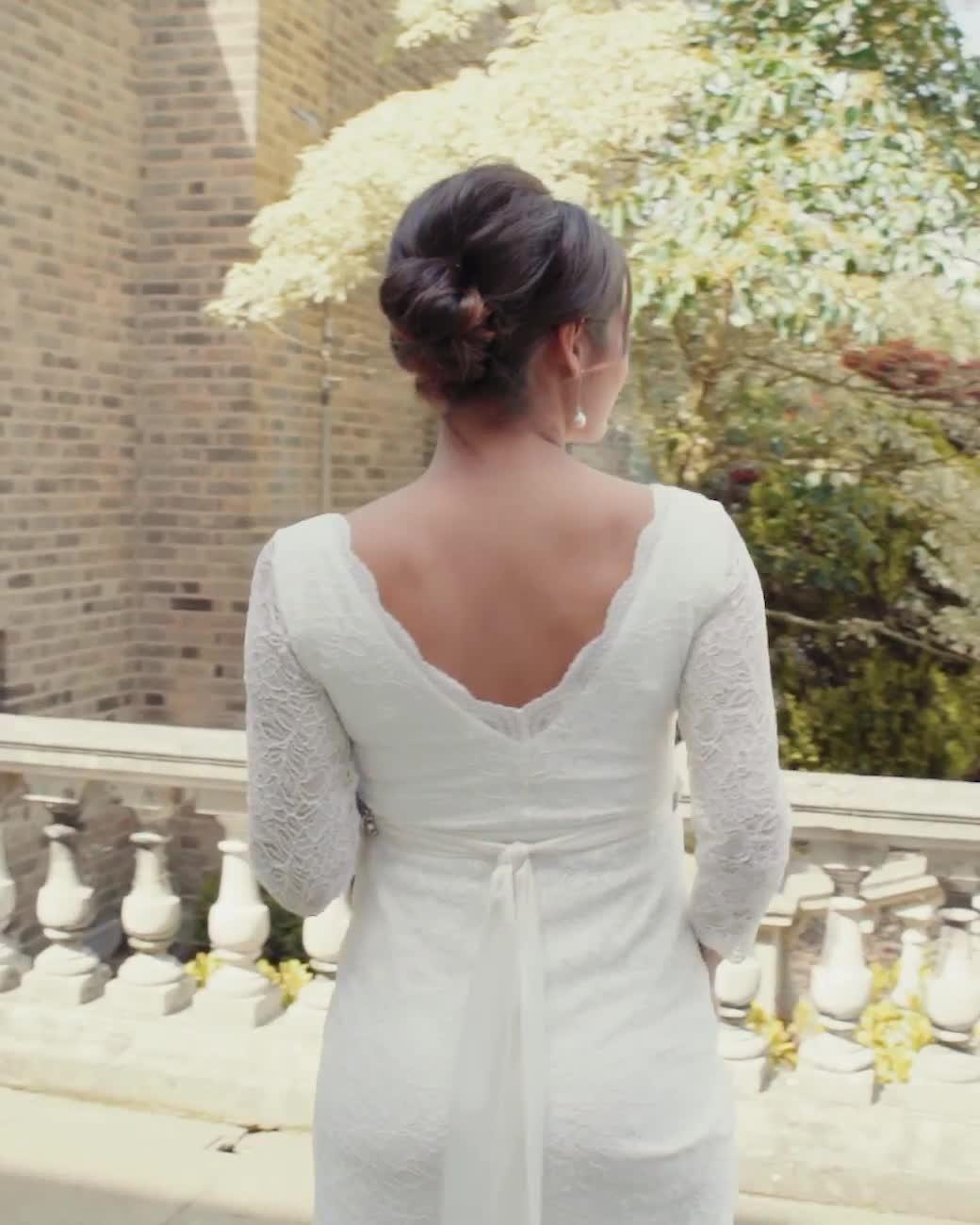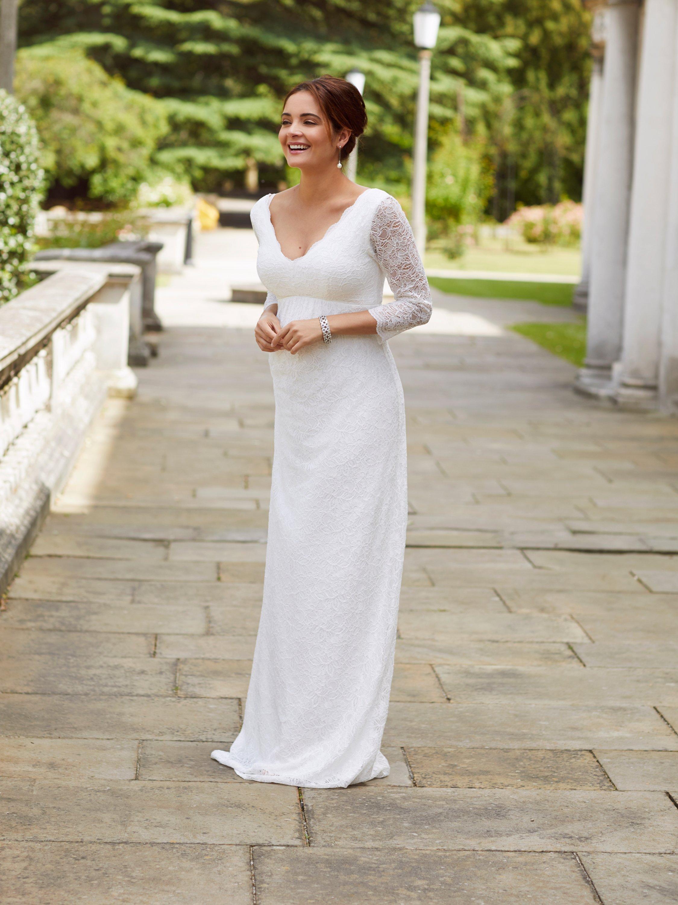 This full-length maternity wedding gown is covered in ivory stretch corded lace and fully lined in premium, breathable jersey. The plunging v-neckline to both the front and back has a scalloped-edge detail, which is reflected in its matching three quarter sleeves. A beautifully shaped floor length skirt creates a sleek and sophisticated shape to pregnancy curves.