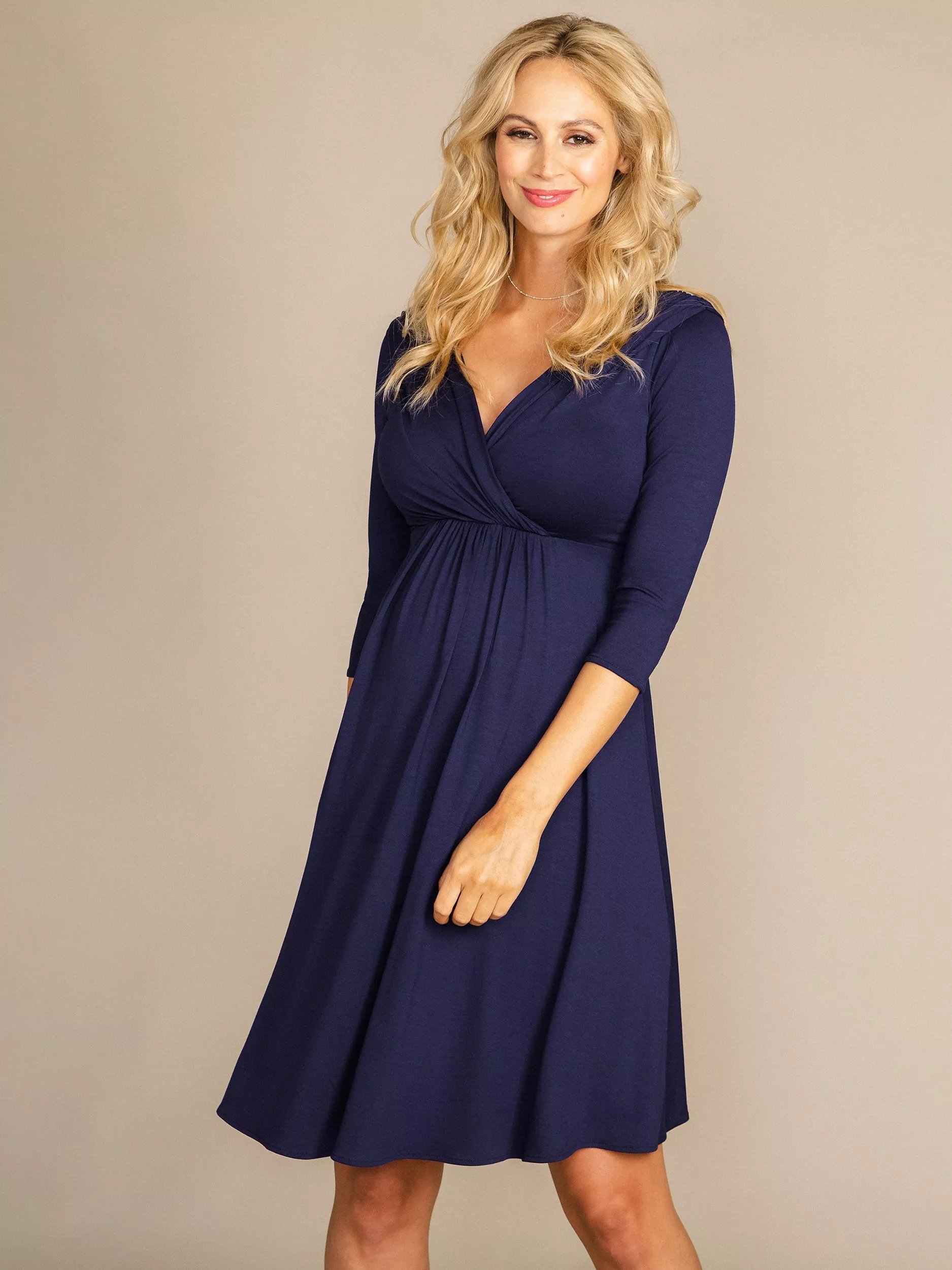 A really versatile maternity dress with a flattering cross over neckline and ¾ sleeves, beautiful during every stage of pregnancy and practical for nursing in the months that follow.