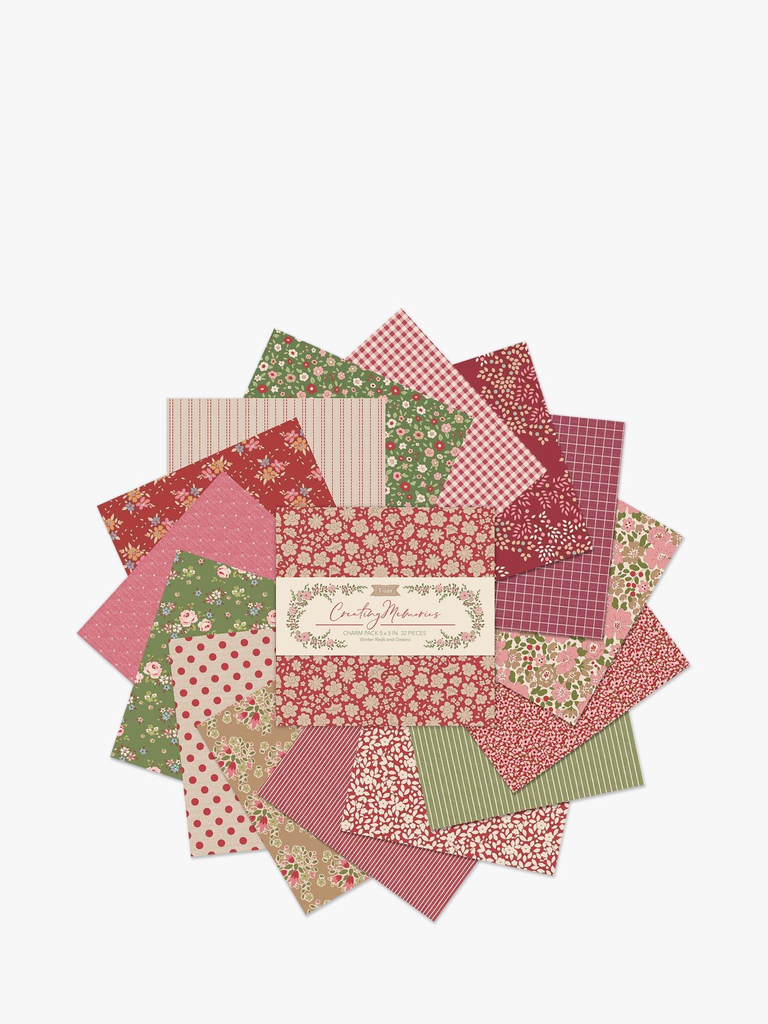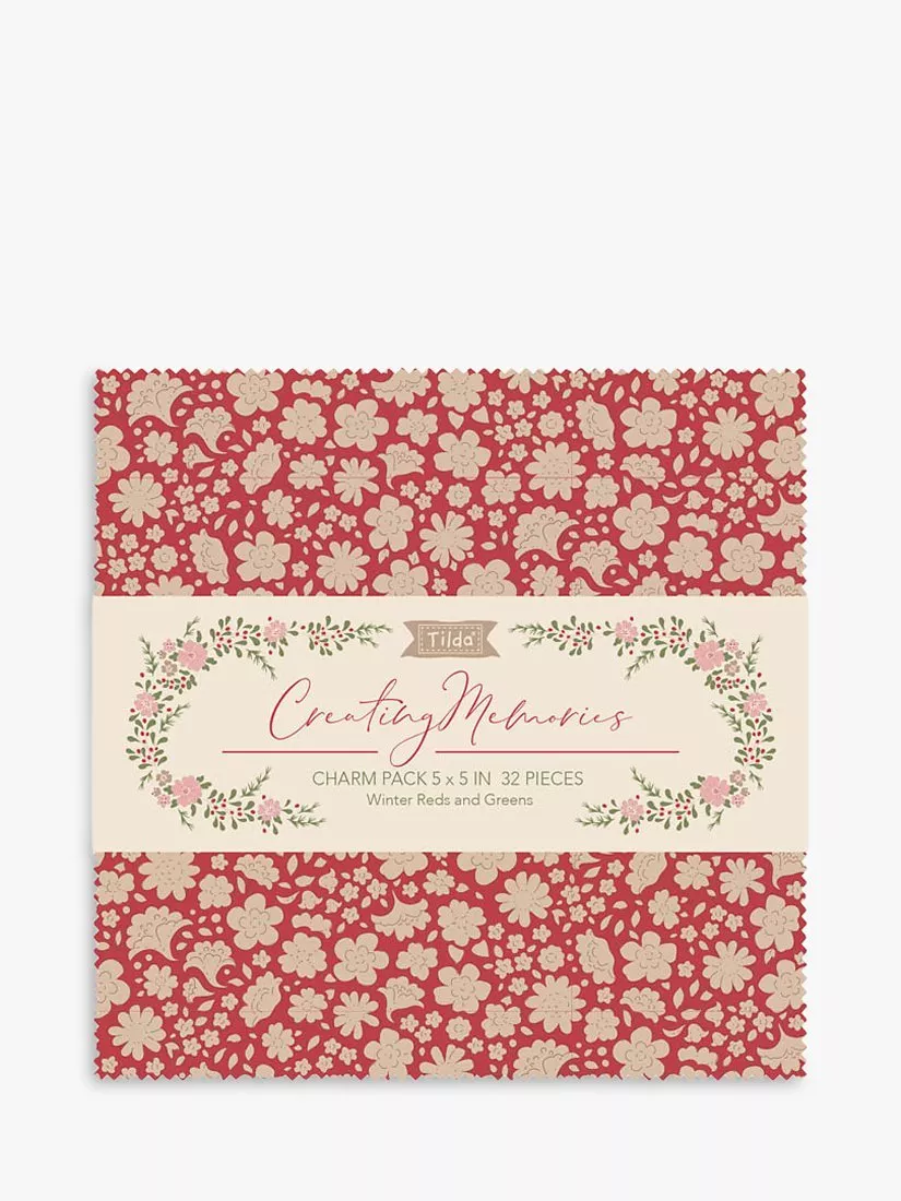 Tilda's Creating Memories Collection winter Charm Pack includes 32 5in x 5in squares - 2 of each of the spring colourway, both prints and wovens. Tilda Fabric's Creating Memories Collection are 100% cotton prints and wovens designed by Norwegian designer Tone Finnanger. The fabrics in Creating Memories are useful as a small-patterned supplement all year, but dividing the pre-cuts into seasonal colourways will help you add that extra flair to seasonal shop exhibitions