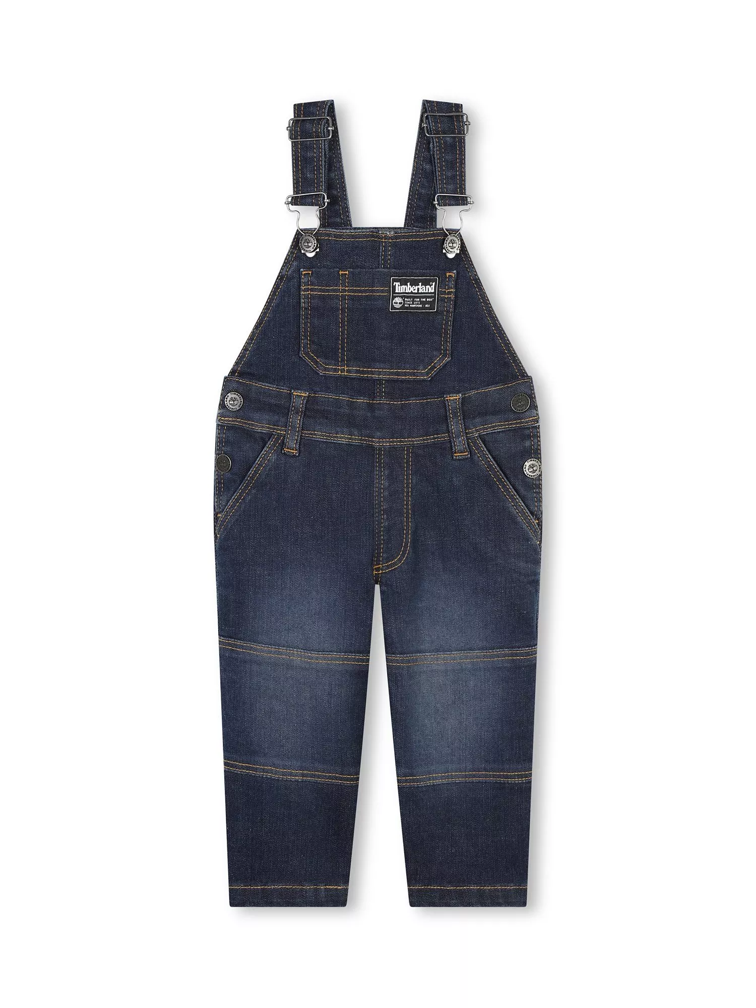 Denim overall-style dungarees with a front pocket and woven label, side pockets and adjustable straps.