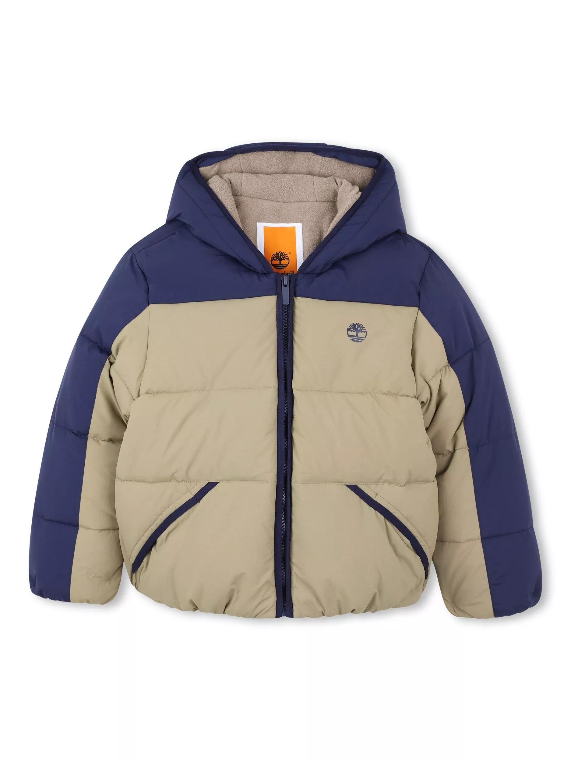 Wrap them up in this water-repellent puffer jacket from Timberland, ideal for those unpredictable days out. Designed with a zipper fastener, front pockets, yoke at sleeves, and printed logo on the chest.