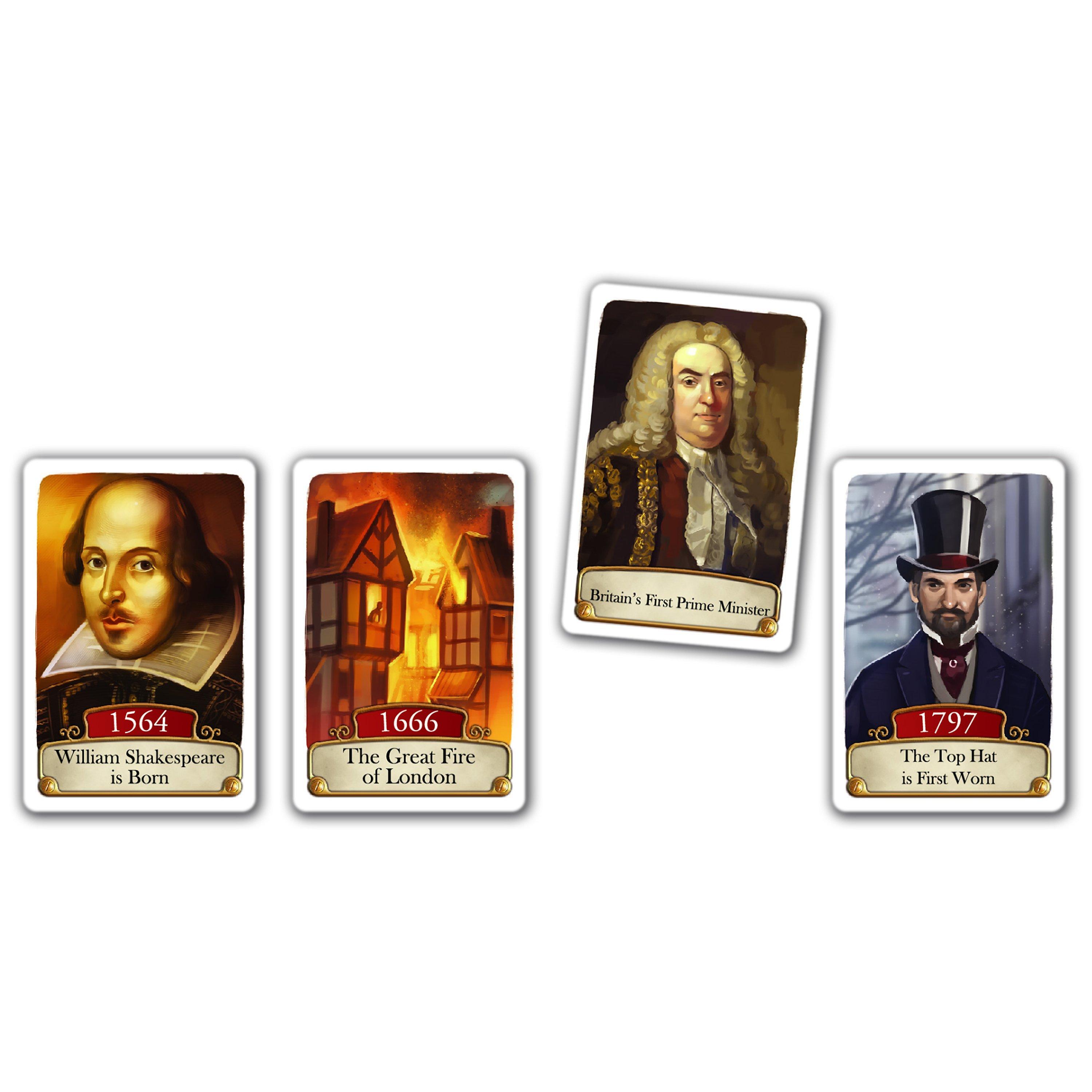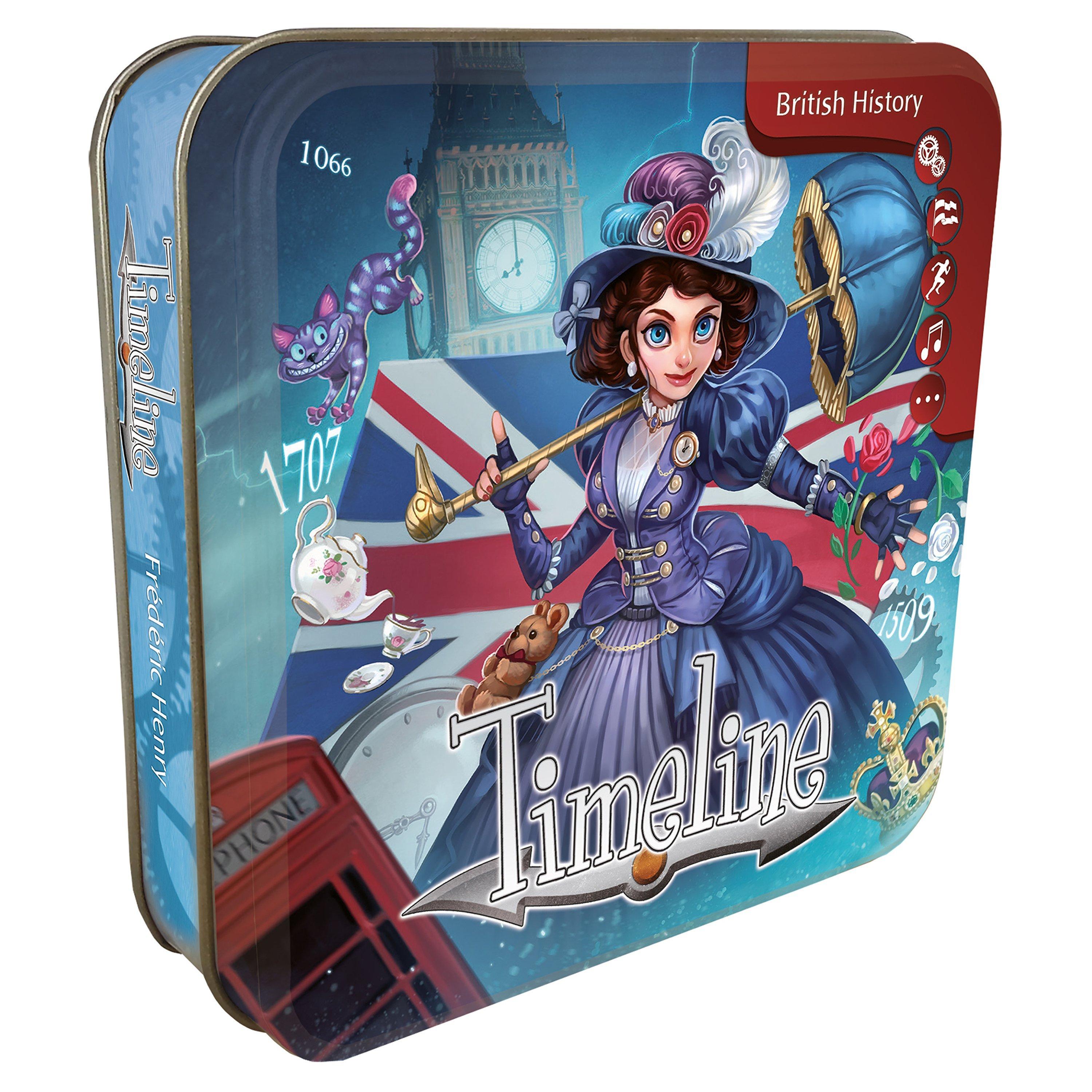 Was William Shakespeare born early enough to enjoy the delights of a cup of tea? and did he wear a top hat? Britain's first Prime minister was surely at a later date, but was that before or after the great fire of London?" these are the kind of questions that you'll be faced with in Timeline: British history. Each turn you place one of your cards where you think it goes in the timeline before turning it over to see if you are right. There is only one goal - play all of your cards! this tin has 110 British history themed cards.