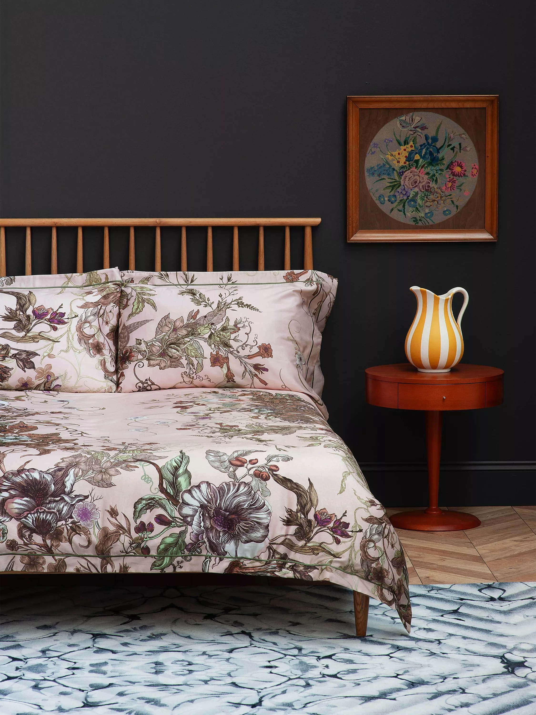 Timorous Beasties Opera Botanica bed linen features a whimsical design with trailing foliage, delicate branches, and soft floral elements, all set against a pale pink background.