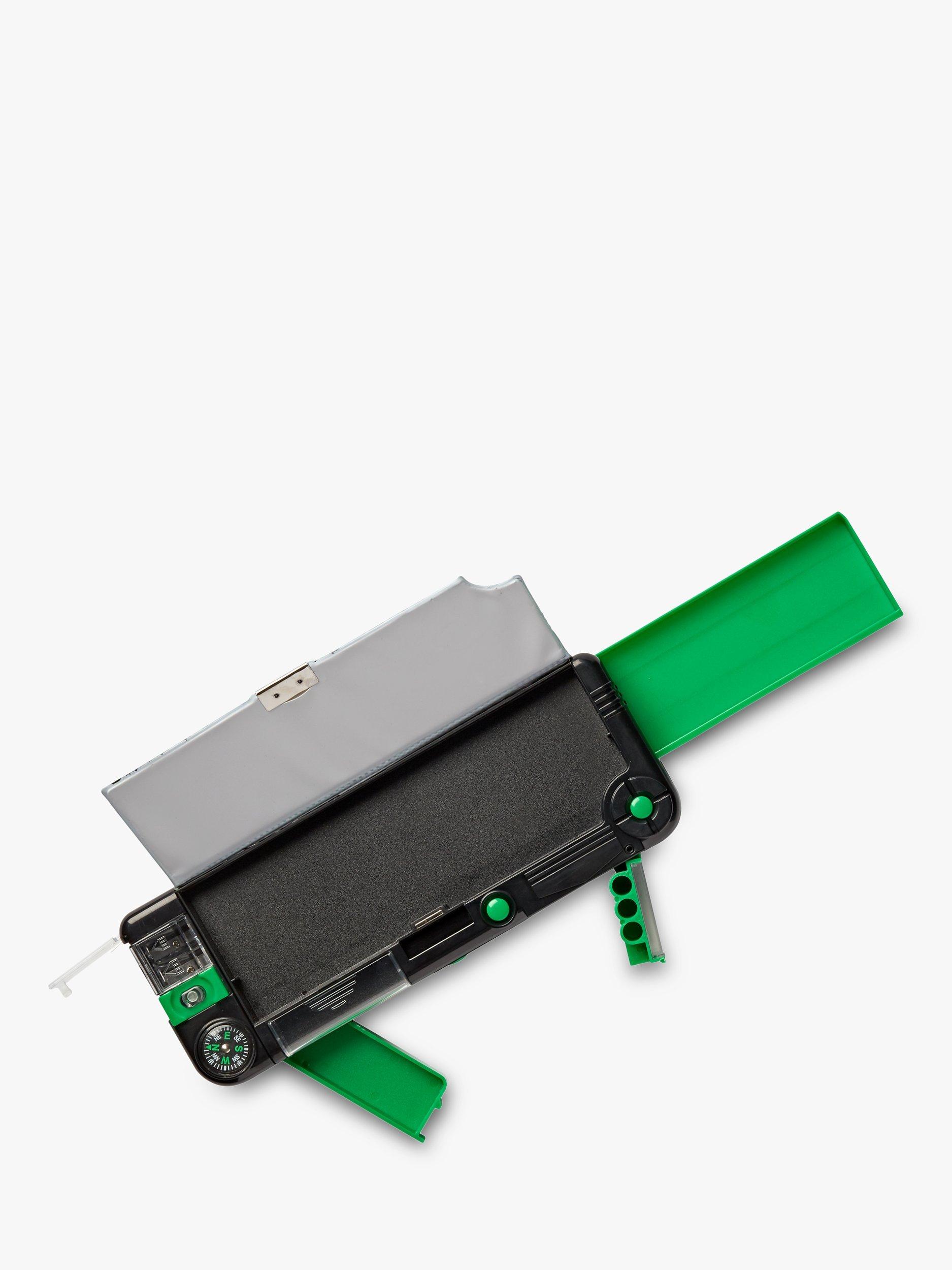 Includes stationery items, small and large compartments as well as a durable snap shut lid. The Camo Snap Compartment Pencil Case includes: 15cm ruler, ballpoint pen, pencil with eraser topper, and built-in sharpener.