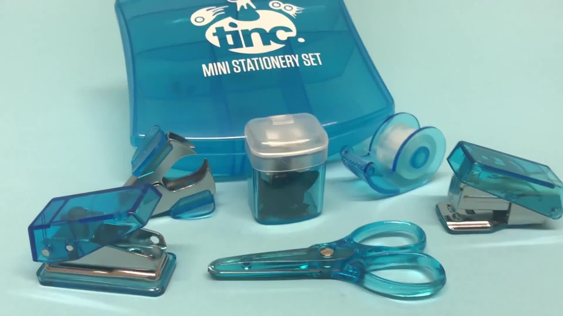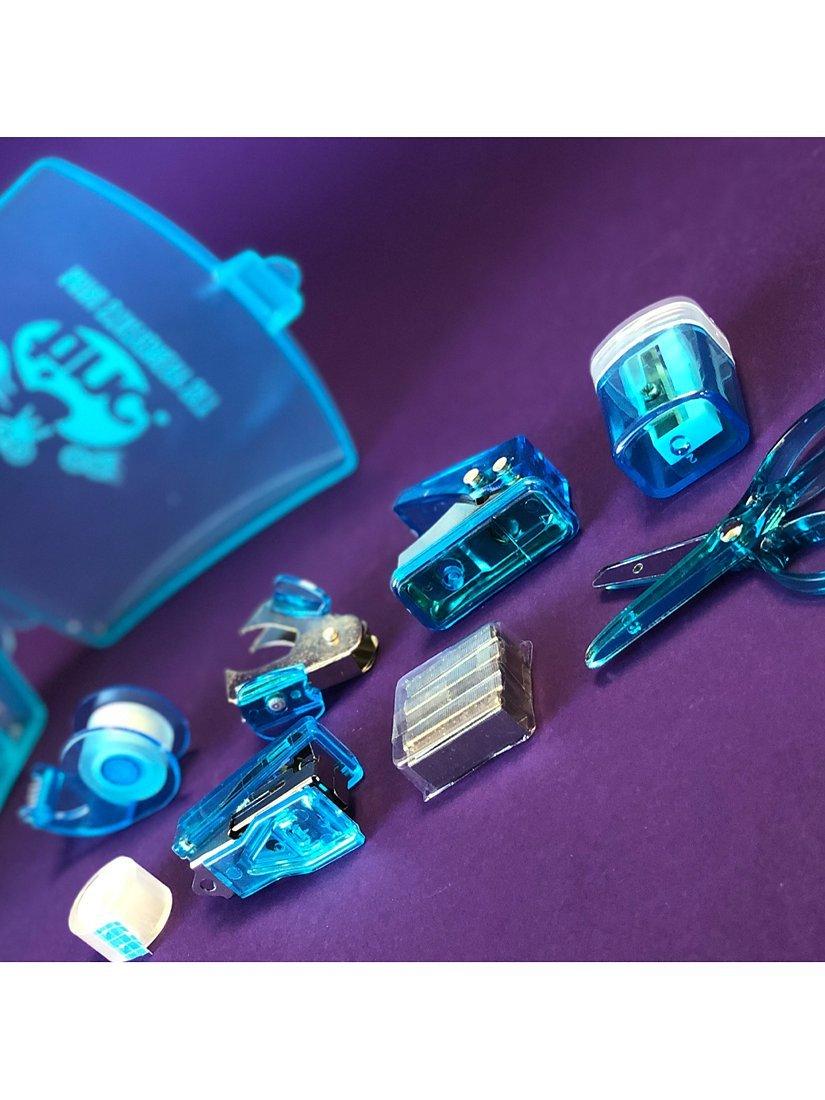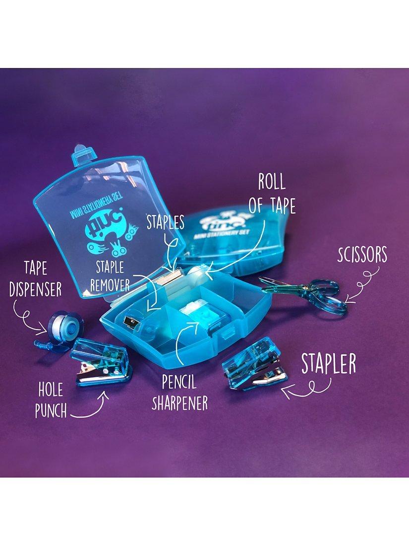 This set contains mini tape dispenser, mini scissors, mini stapler, mini staple remover, and mini sharpener. This set also includes refills for the stapler and tape dispenser.