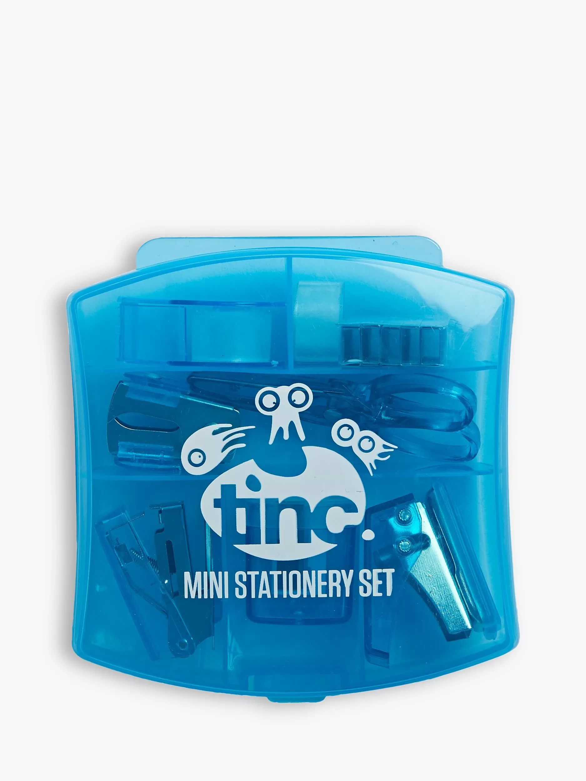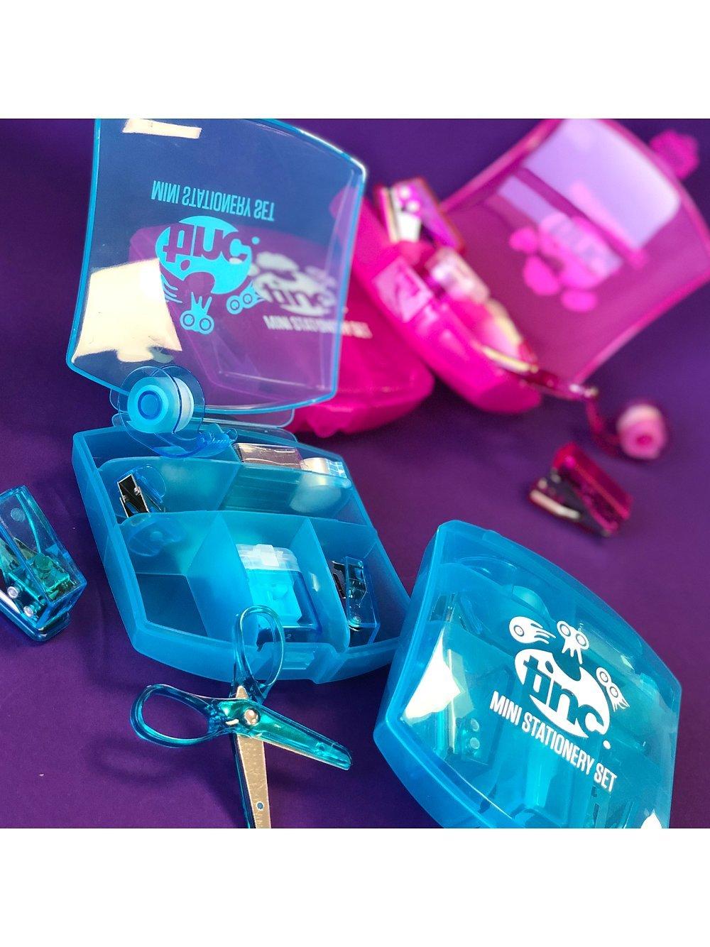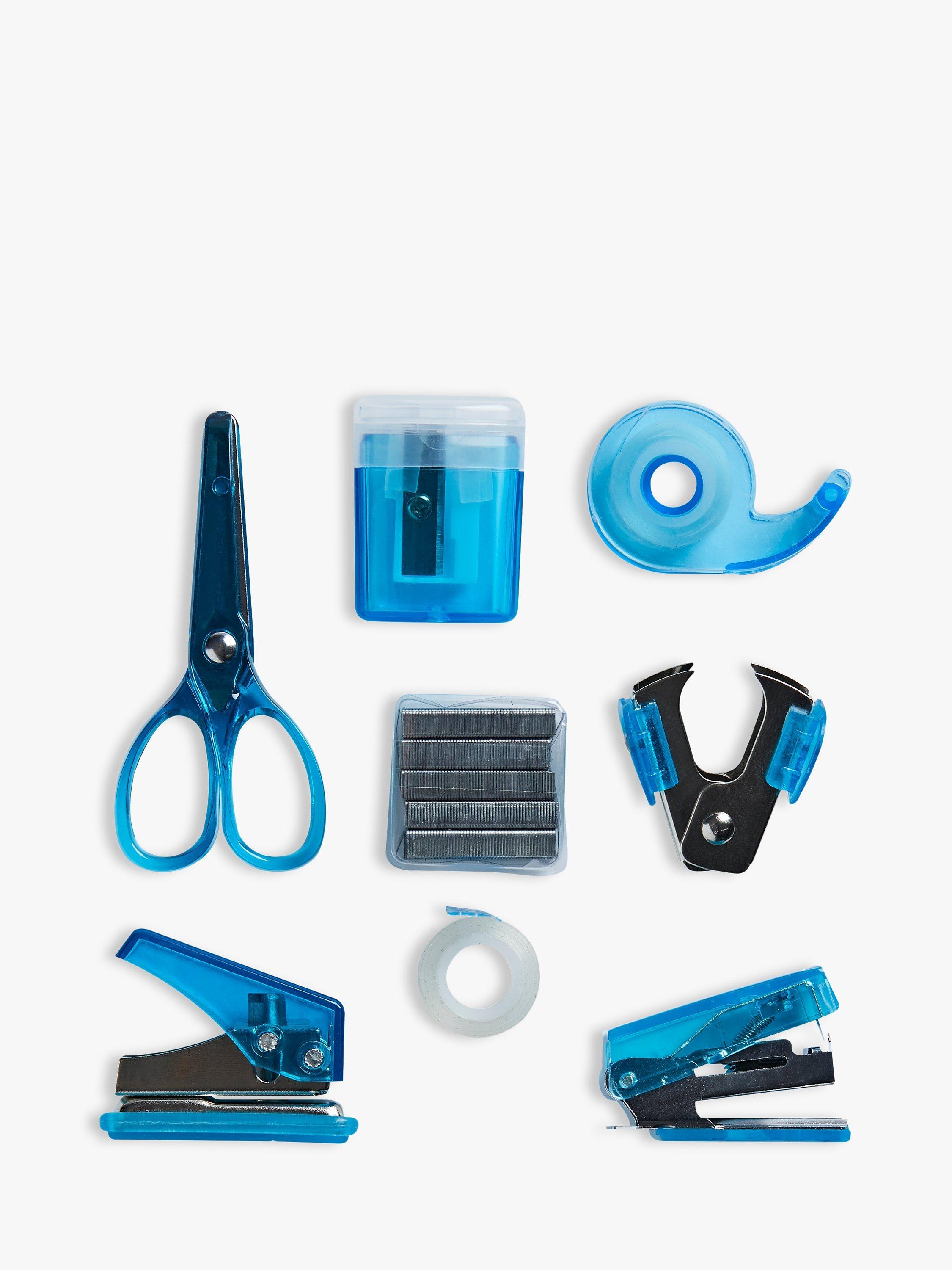 This set contains mini tape dispenser, mini scissors, mini stapler, mini staple remover, and mini sharpener. This set also includes refills for the stapler and tape dispenser.