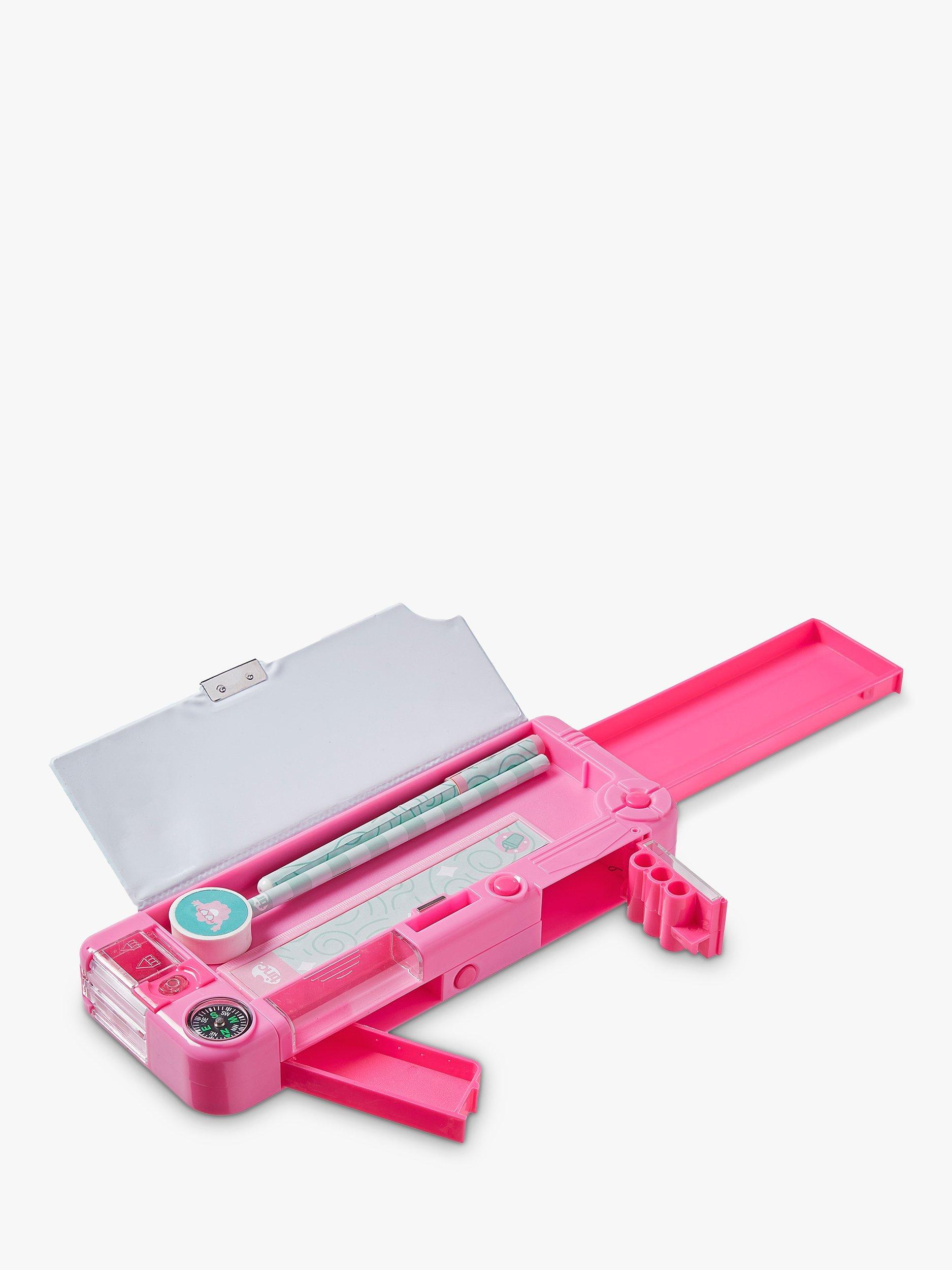This Filled Compartment Pencil Case includes: One 15cm ruler, a ballpoint pen, a pencil with an eraser topper, and a built-in sharpener.