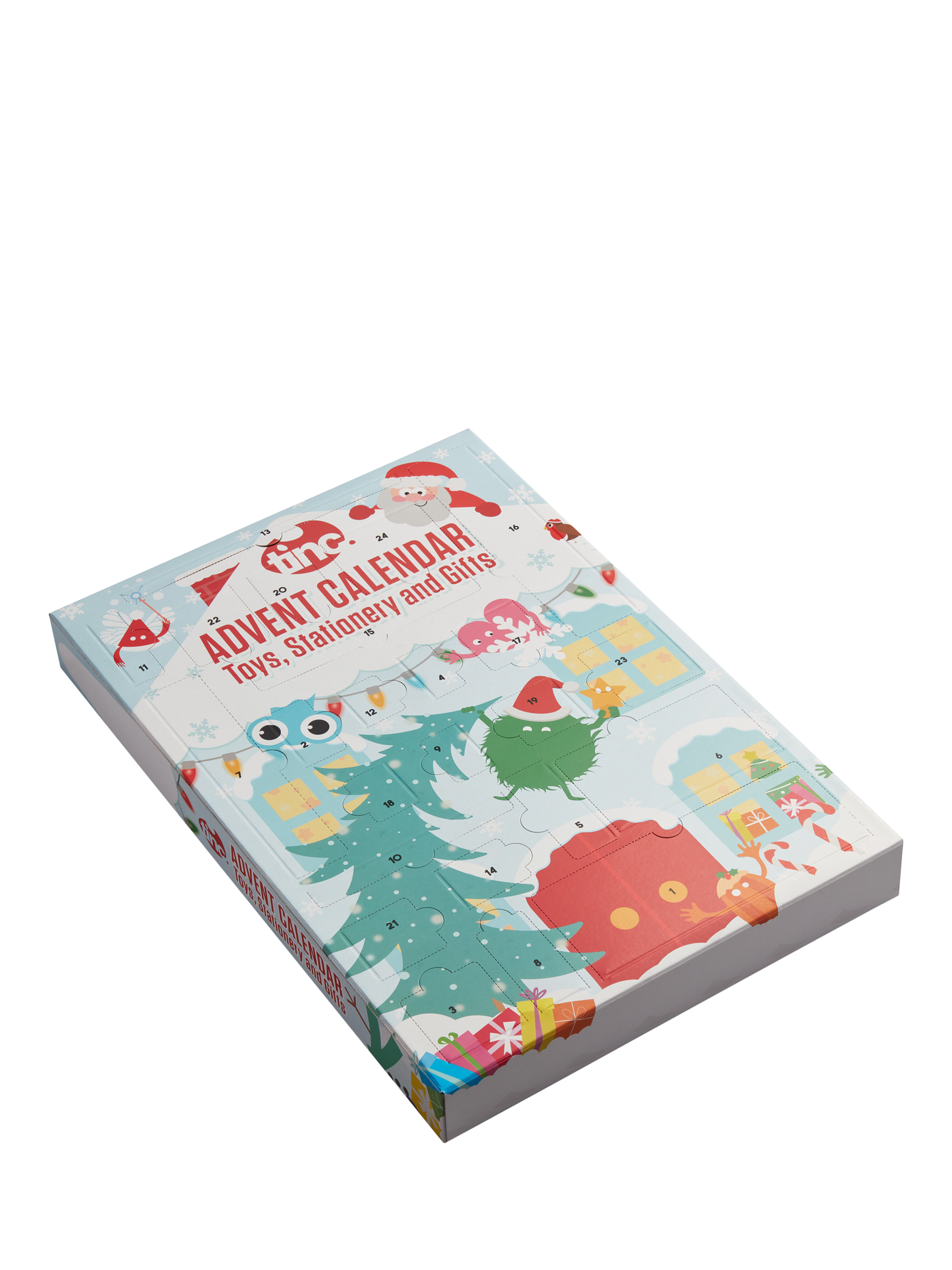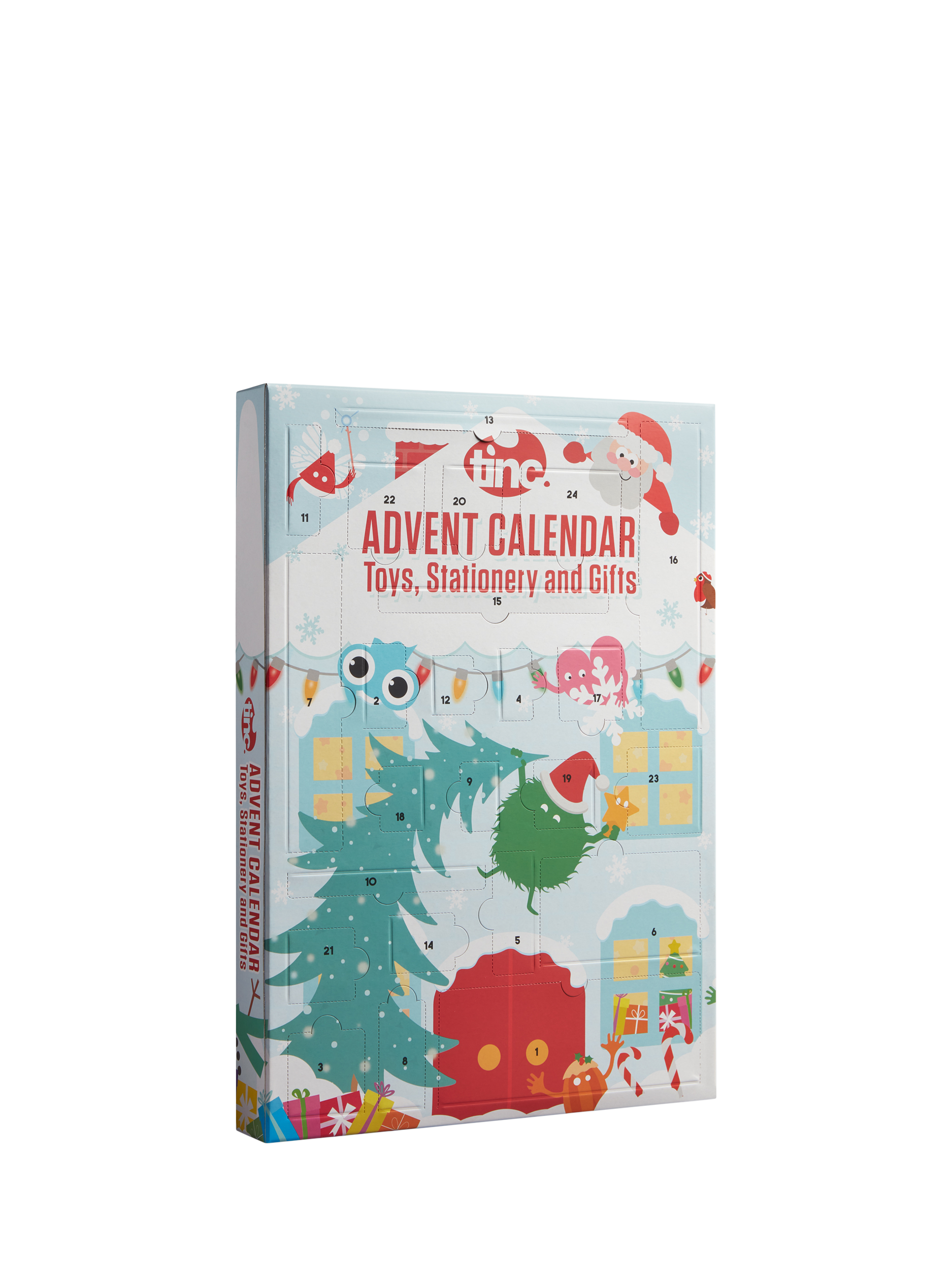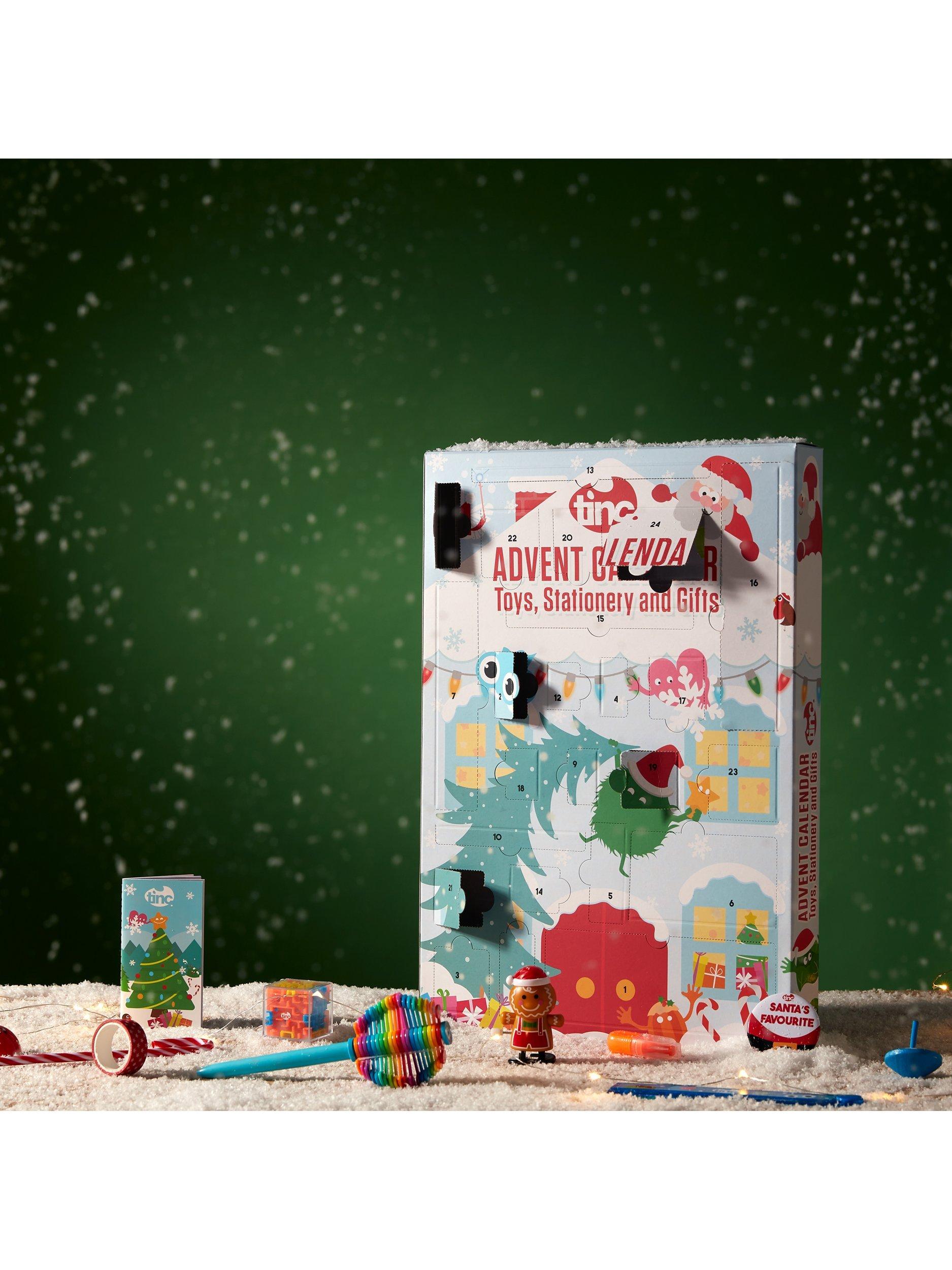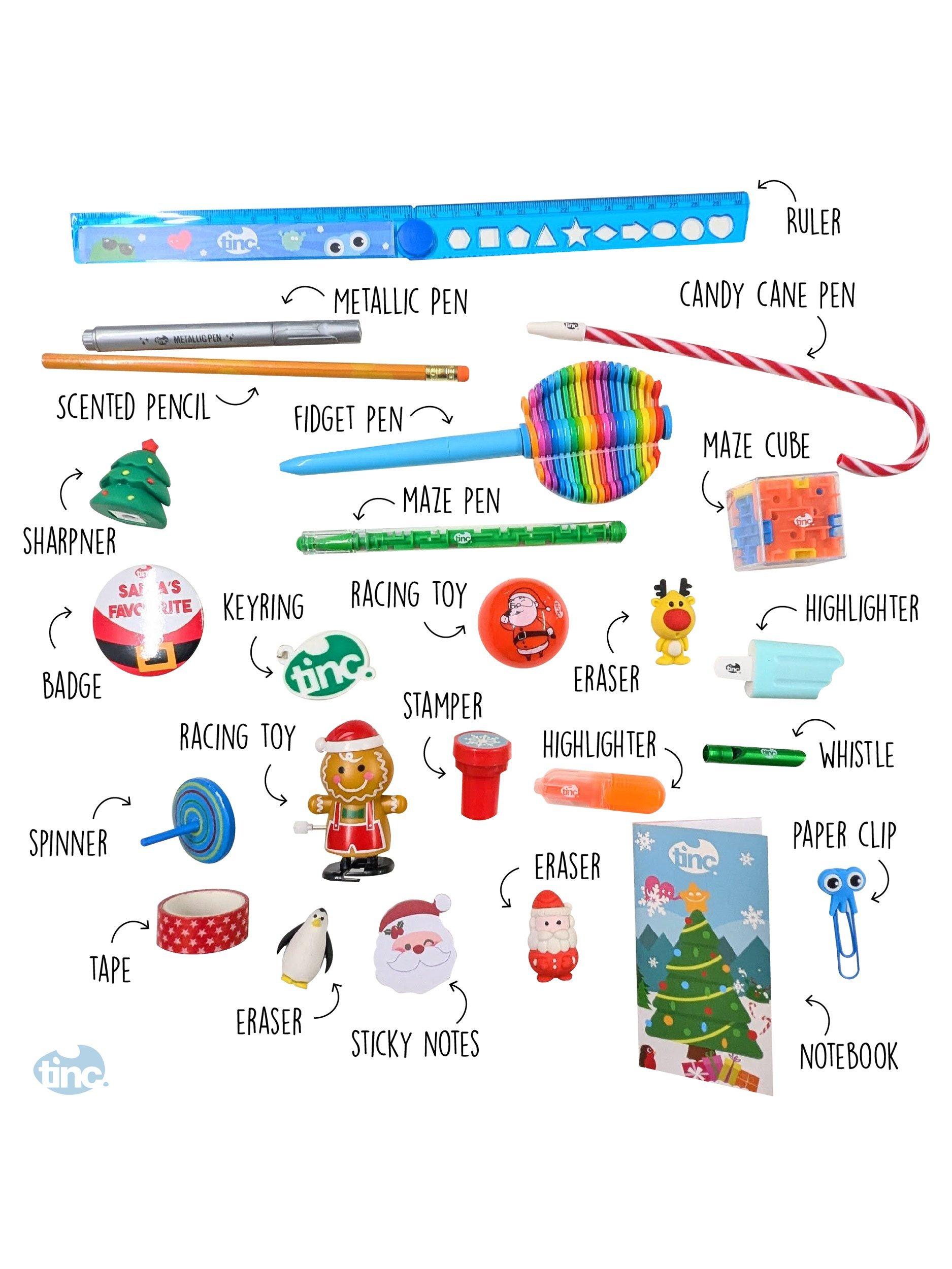 This Tinc Kids Advent Calender has 24 fun and functional individual gifts. Festive items included: Ruler, Metallic Pen, Candy Cane Pen, Scented Pencil, Fidget Pen, Maze Cube, Sharpener, Maze Pen, Badge, Racing Toy x2, Erase x4, Highlighter, Stamper, Whistle, Spinner, Tape, Sticky Notes, Paper Clip, Notebook, Keyring.