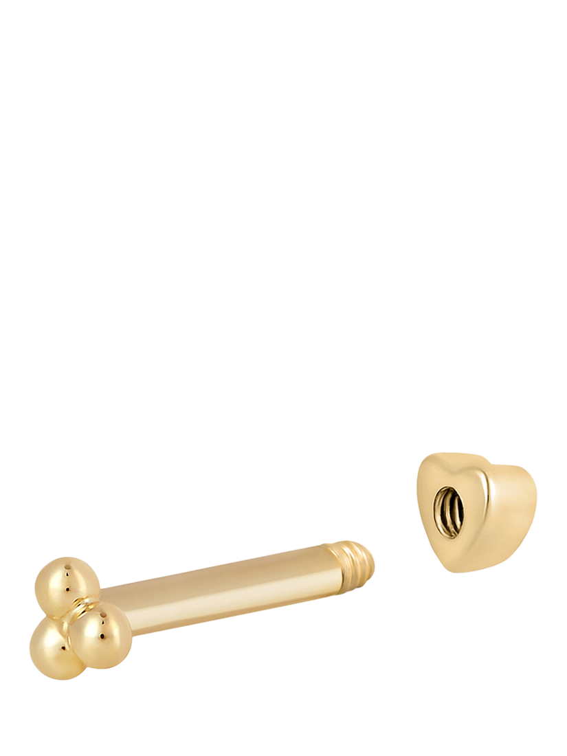 A classic design with three dots in a triangular formation, this barbell earring is made from 9ct solid gold and is secured with a heart-shaped screw back.