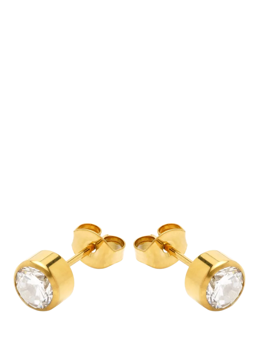 A simple and elegant way to add some sparkle to your day, these bezel-set stud earrings are neat and secure. Made from gold plated titanium with butterfly backs, set with moissanite stones for a sparkling look that you can wear all day. Perfect for lobe piercings. Butterfly back closure, and suitable for pierced ears only.