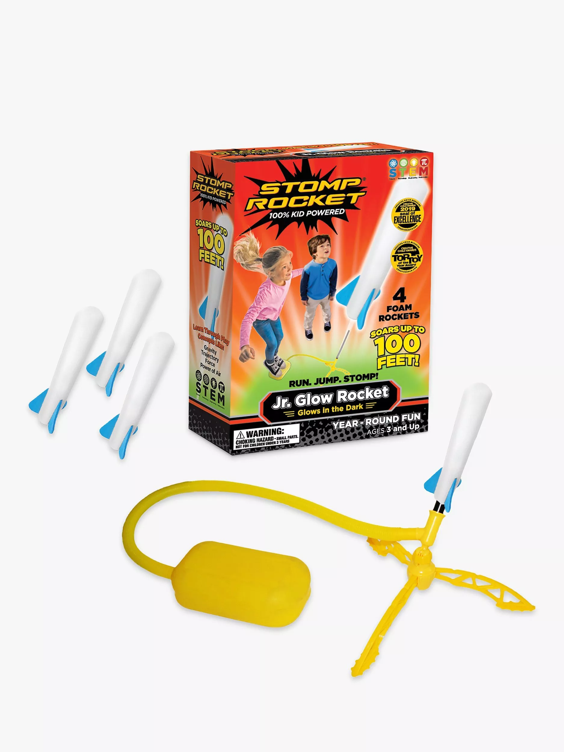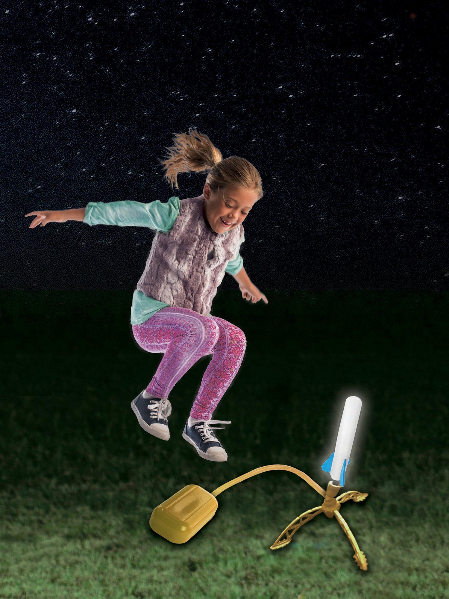 Jump on the launch pad and watch as the rockets fly up to 100 feet! Change the trajectory and see how far it goes! Best of all, all 4 rockets are glow-in-the-dark, so kids can use them for nighttime fun!