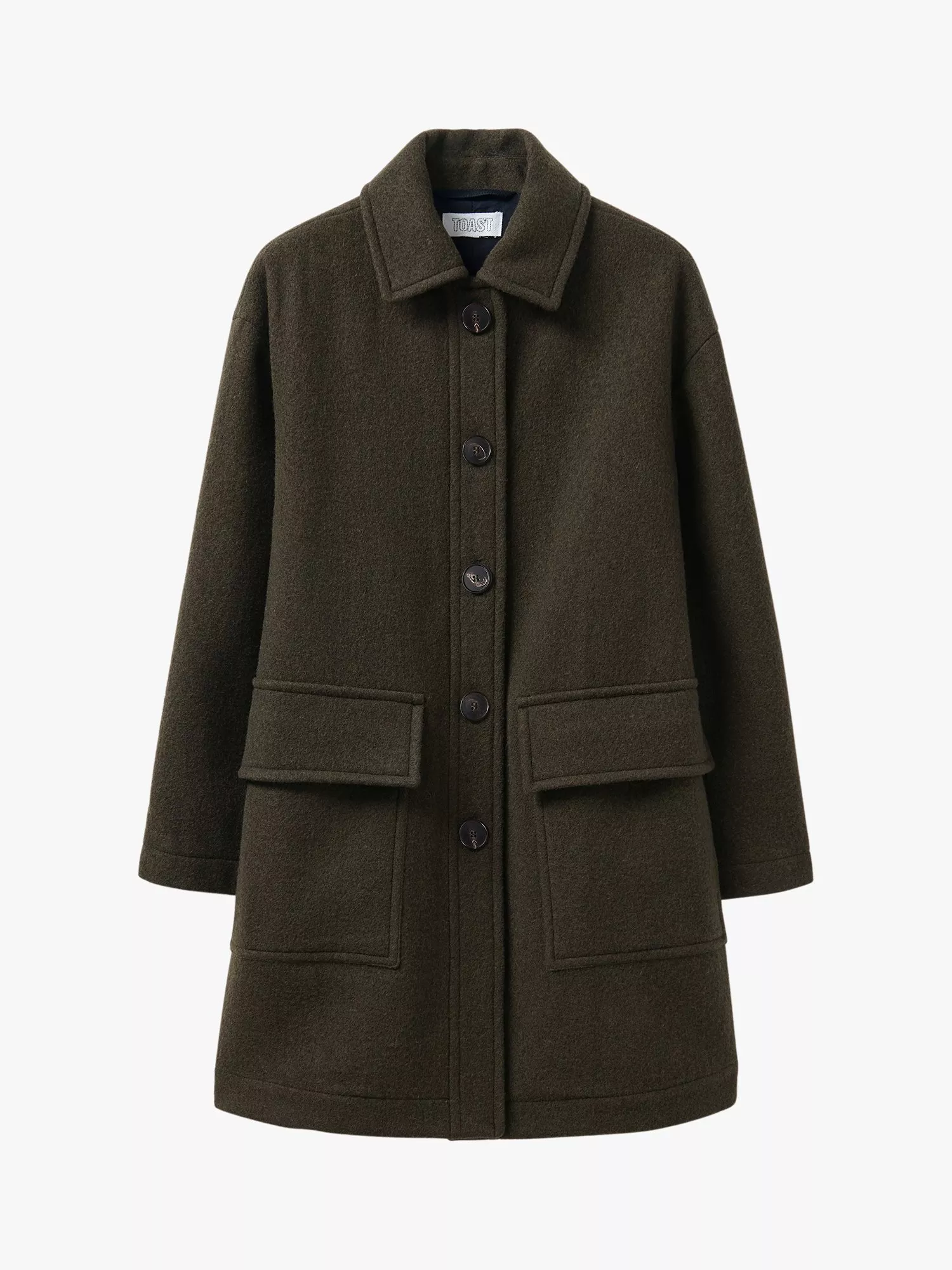 Made from warm and textured, boiled wool, this coat from Toast has a easy, roomy cut that's perfect for layering over chunky knits and cosy outfits. It has a cutaway collar with a row of buttons below, full length sleeves and a centre seam down the back with a vent for ease of movement.