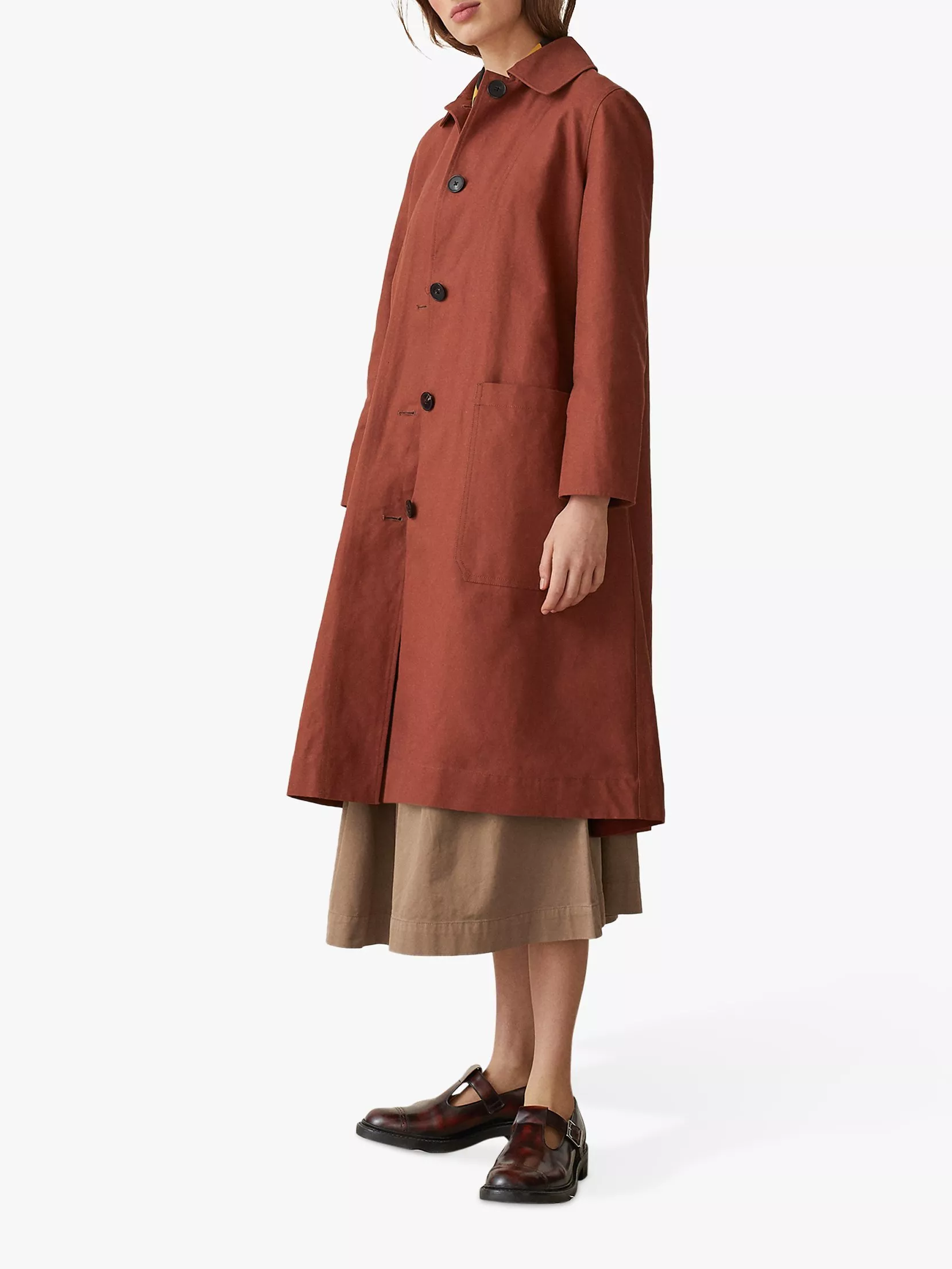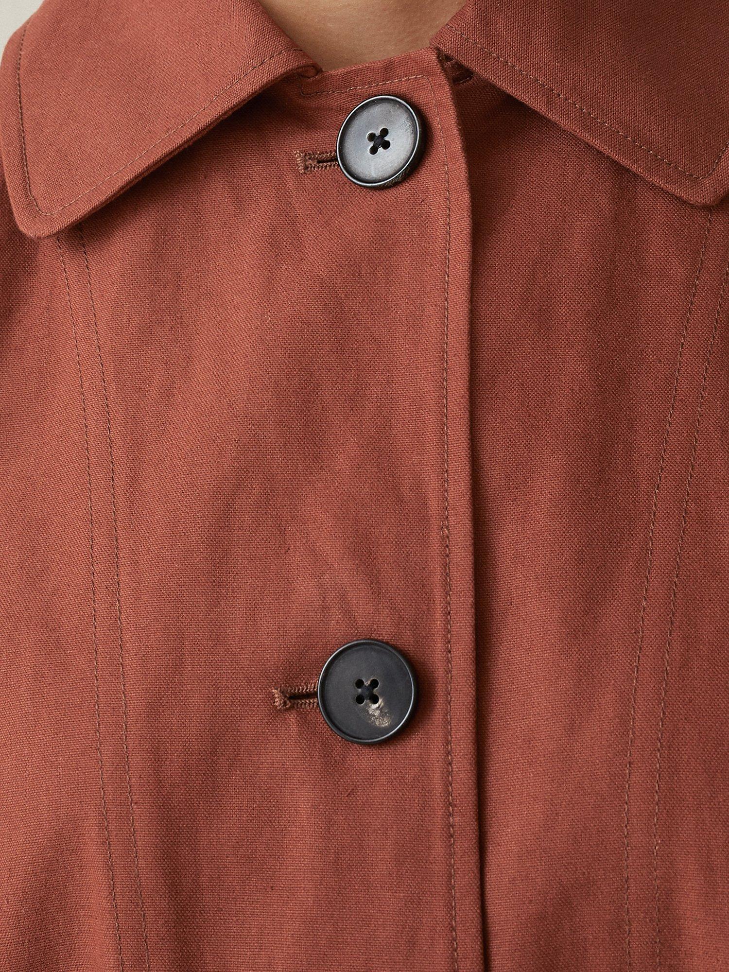 Made from cotton blend canvas with a weighty feel, this timeless piece has a swing cut that layers over flowing dresses and wide-leg trousers. The perfect blend of smart and causual, it has corozo button fastenings, front patch pockets and a vent in the back for ease of movement and a flowing finish.