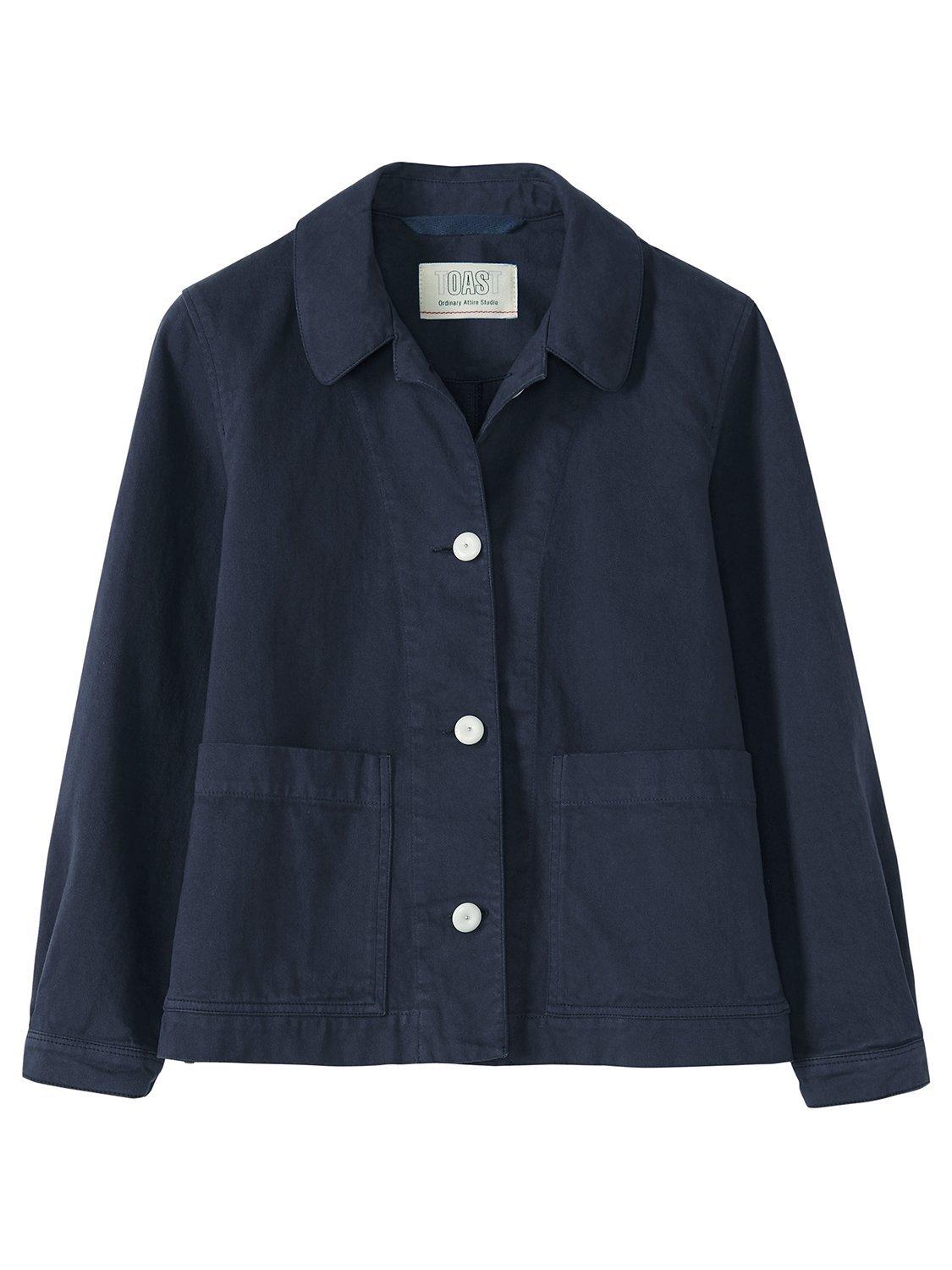 Made from pure cotton twill and garment dyed for a rich uniform colour, this jacket offers a neat boxy silhouette. It has corozo shank button front fastenings with a rounded collar, bracelet length sleeves and patch pockets.