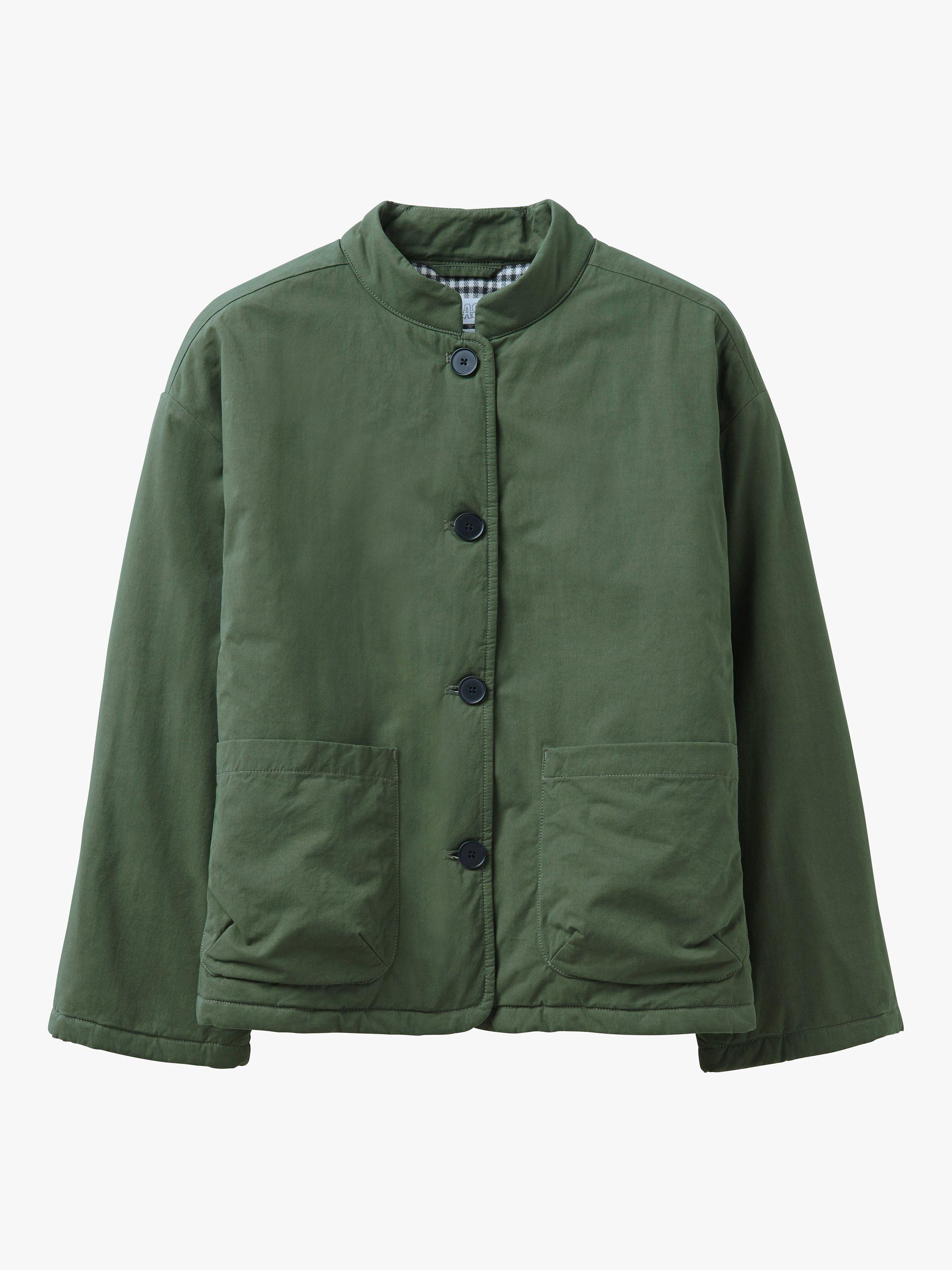 With a light organic cotton twill outer, internally quilted to a warm, recycled polyester wadding this soft and boxy cut jacket from Toast is a must-have. Designed with relaxed, dropped shoulder and stand collar, it has a fuss-free button fastening and two handy patch pockets too. The lining is a charming contrast brush cotton gingham.