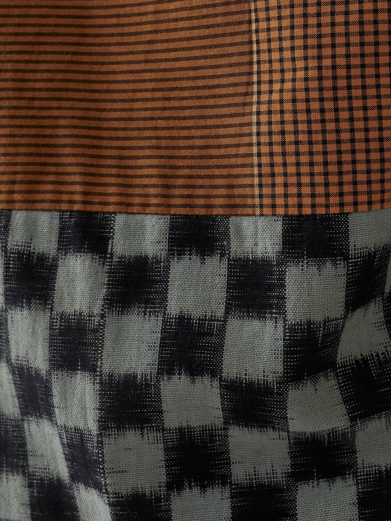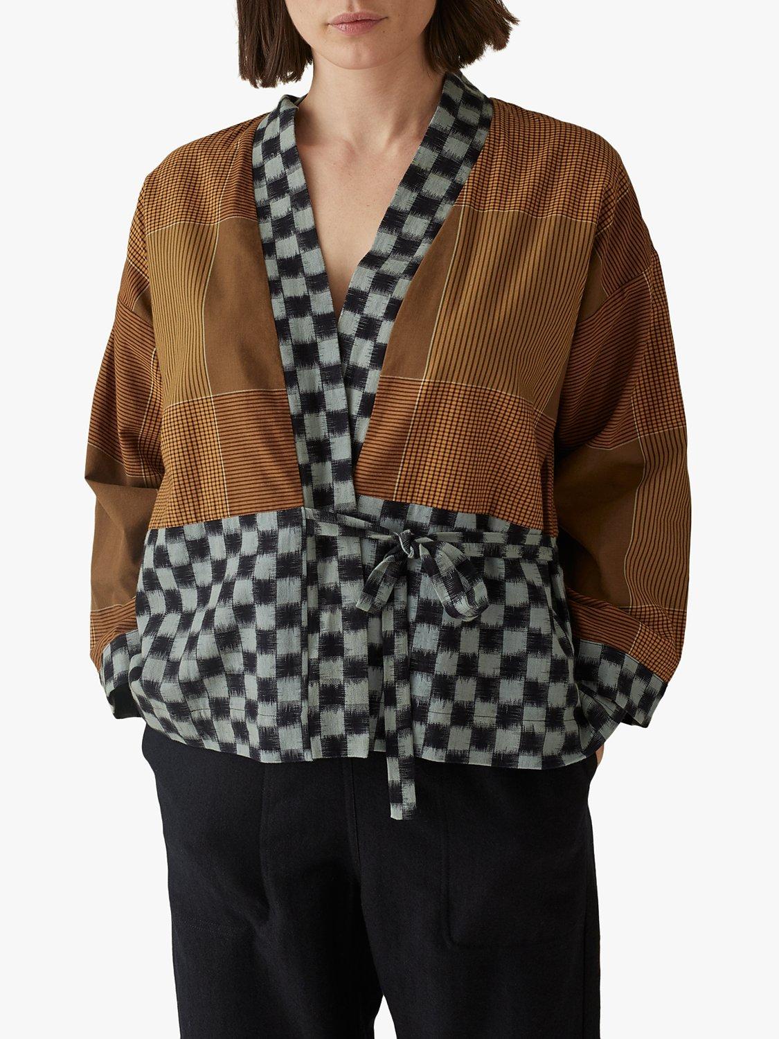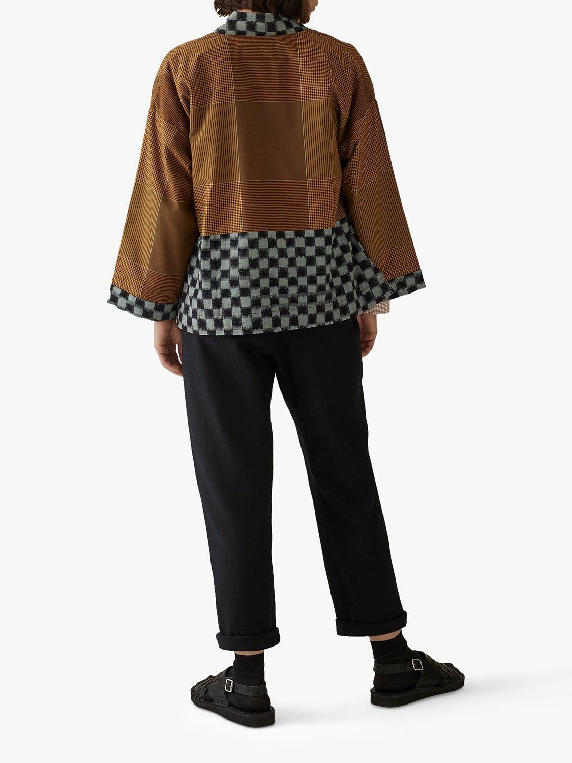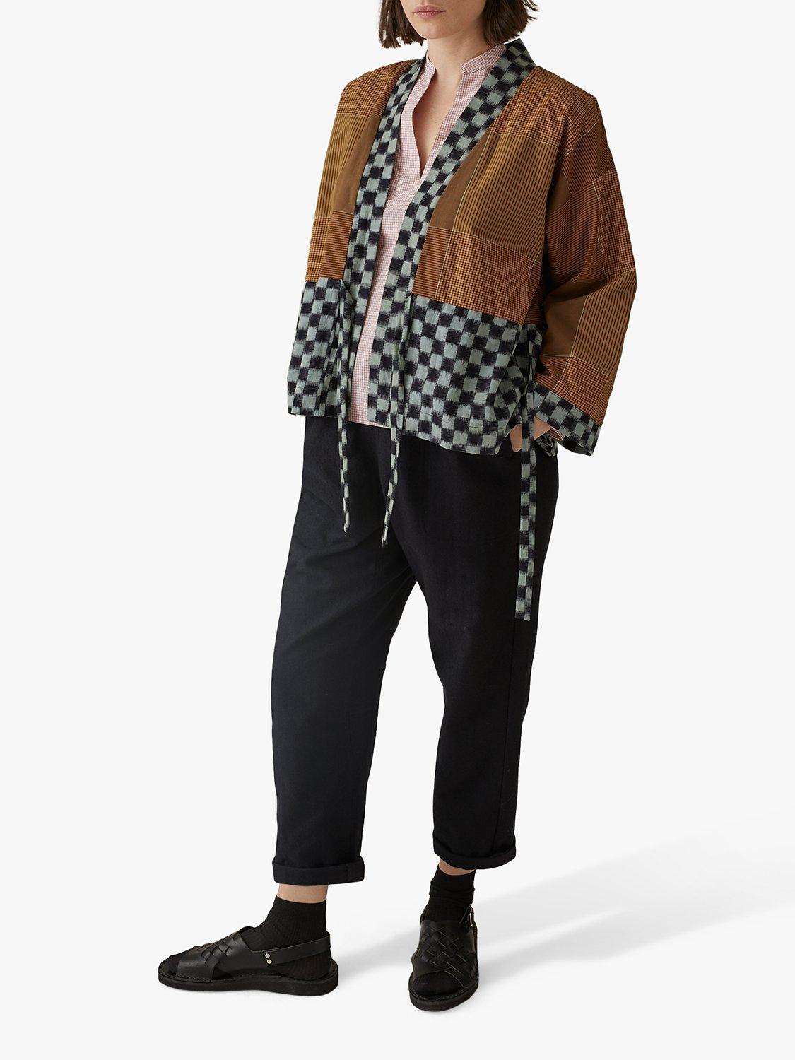 A statement style that's both effortless and elegant, this Toast jacket has a checked cotton upper, with a contrast hand dyed and hand woven wide ikat hem. Soft and slightly slubby, with contrasting checks throughout, it can be worn either way around, revealing the ikat reverse. The boxy cut with dropped shoulders and wide, wristbone length sleeves make it easy to throw on with a wrap over front and fixed fabric tie at the side to fasten. It stays secure with internal ties and is finished with split side seams.