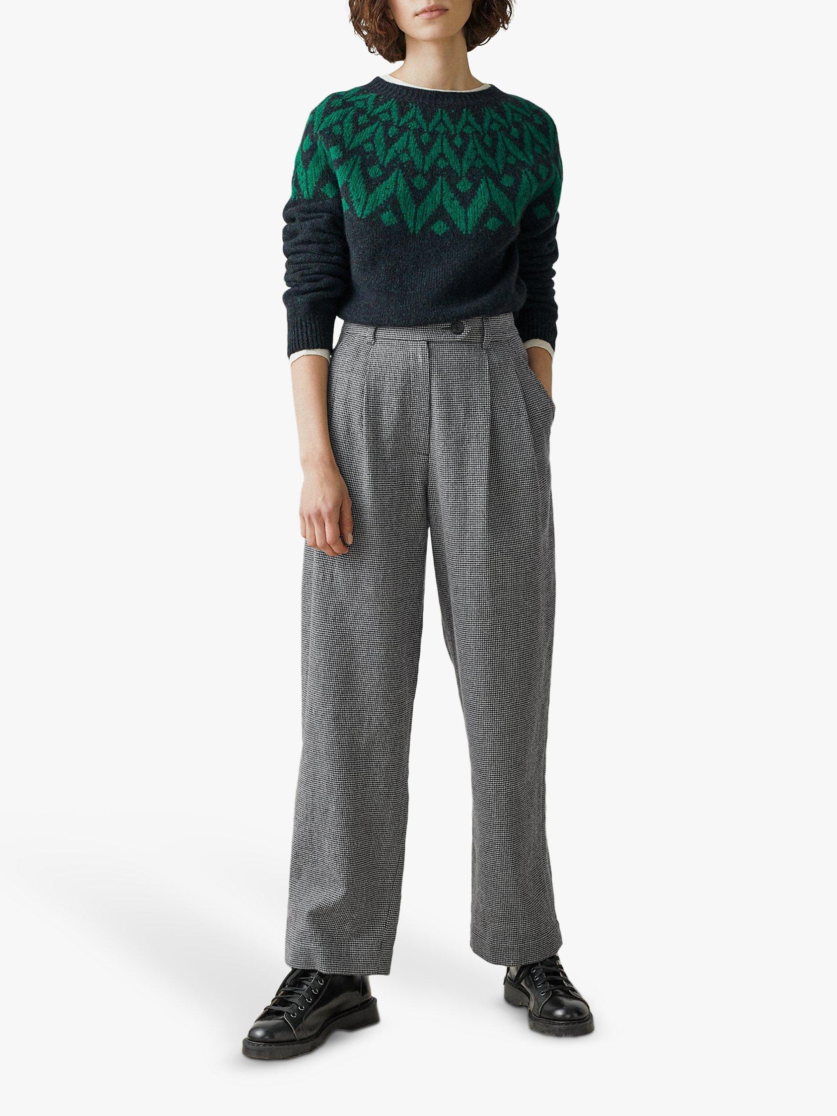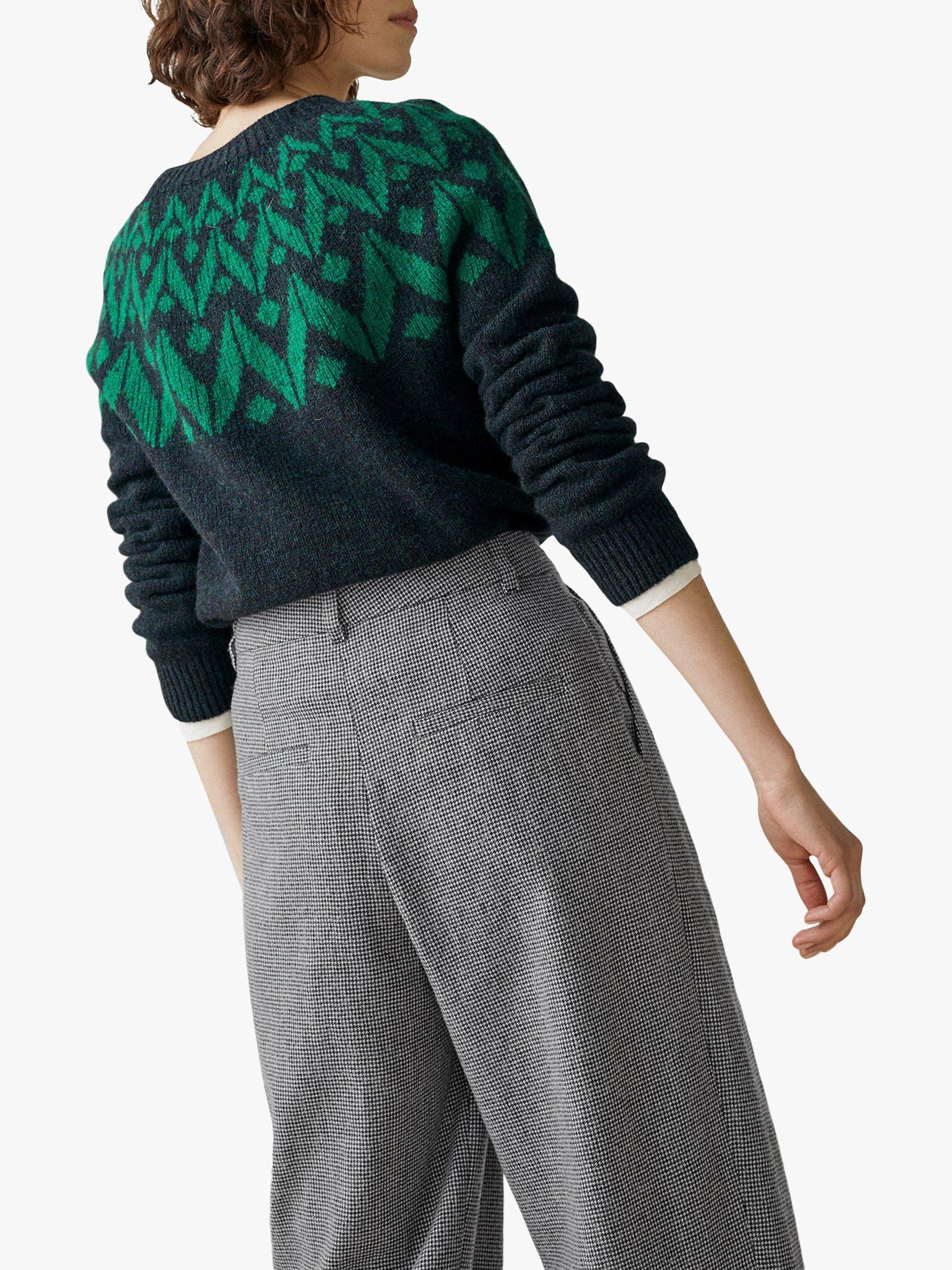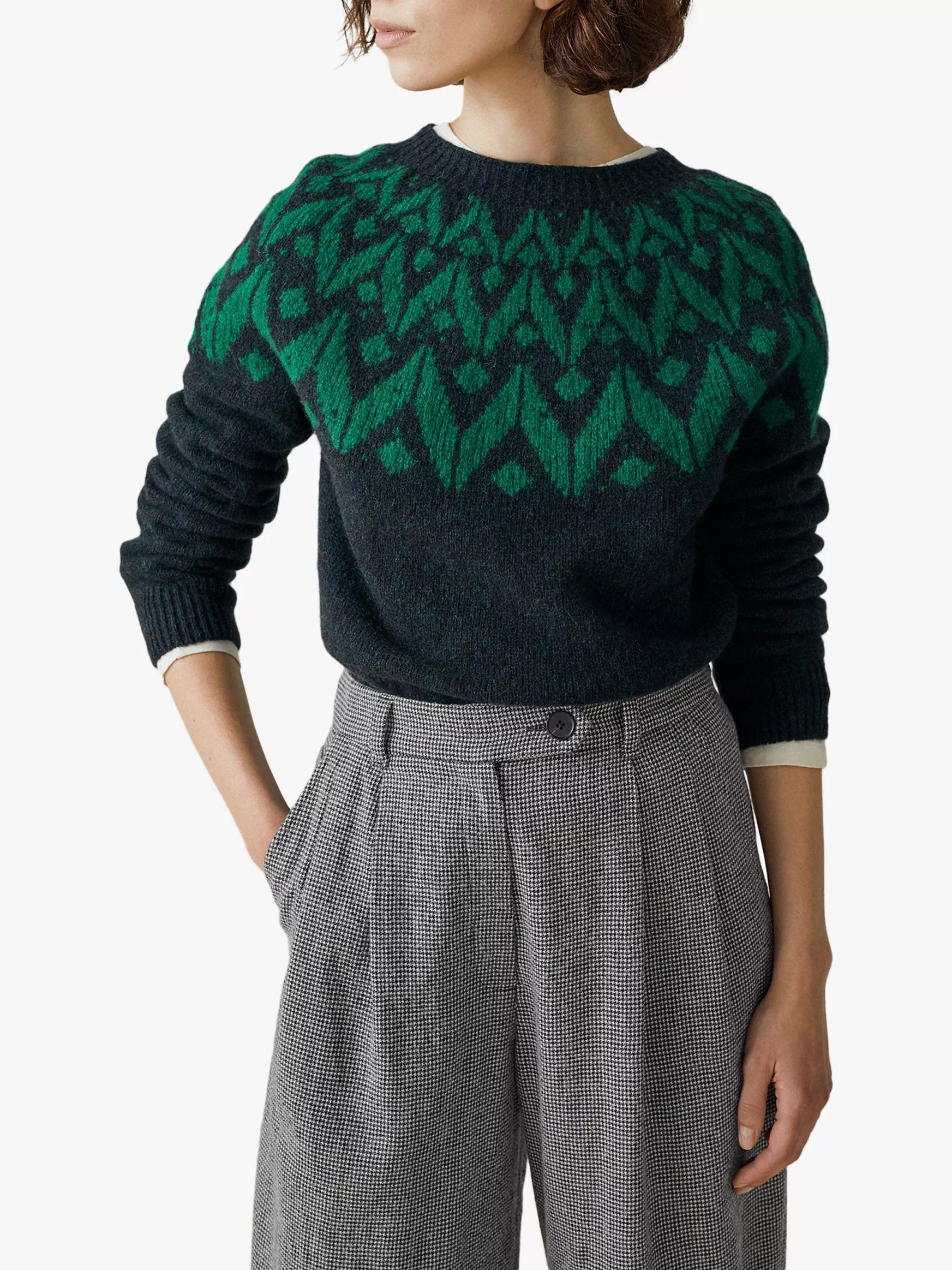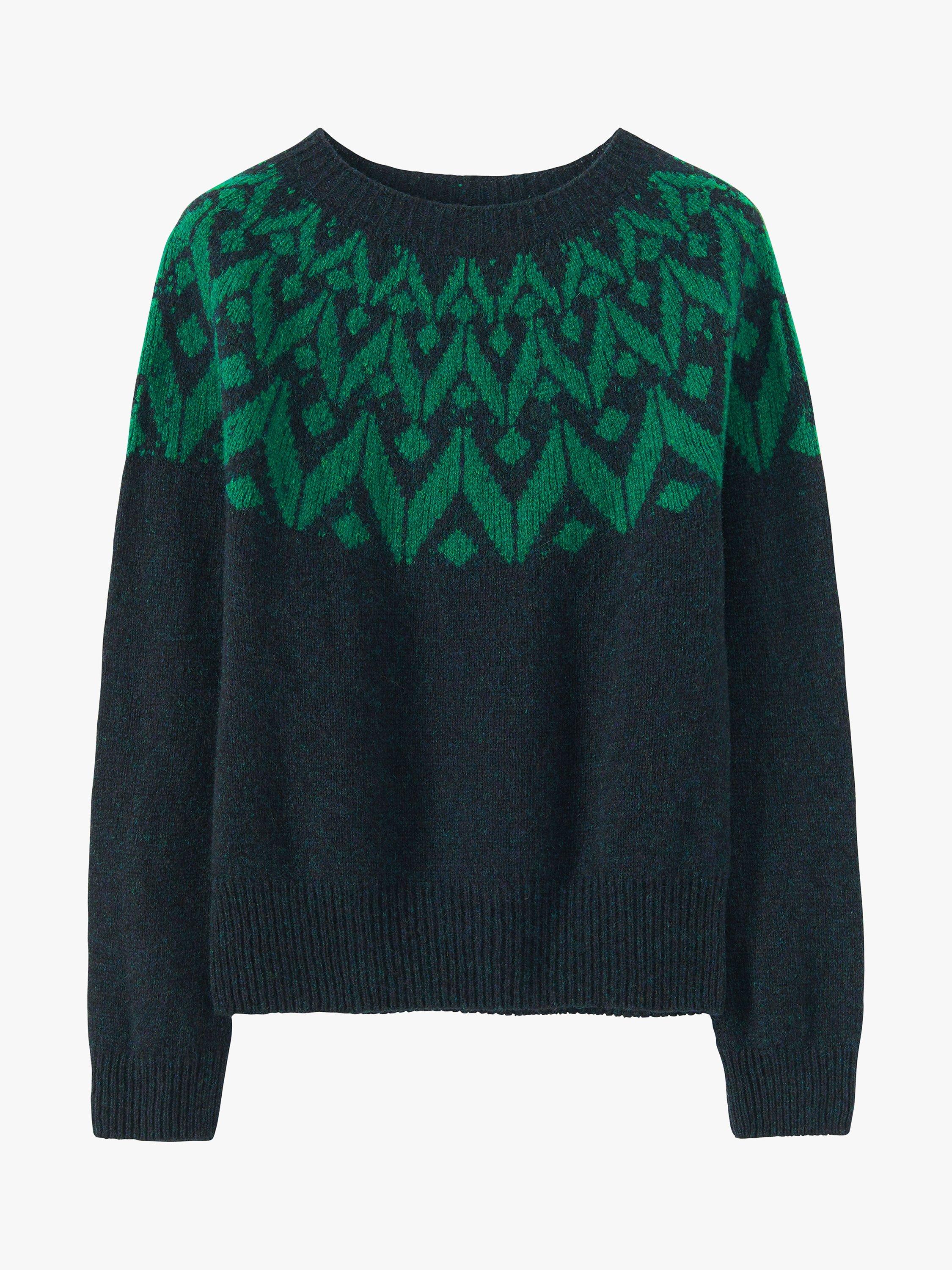 Warm and soft in Scottish-spun wool, this jumper from Toast has a contrast chevron yoke that runs along the neckline for a standout look. Seamlessly knitted in the round so that the pattern is not interrupted, this cosy piece has deep ribbed cuffs and hem for a neat finish with full length slender sleeves. Pull it on with anything from flowing midi skirts to tapered twill trousers.