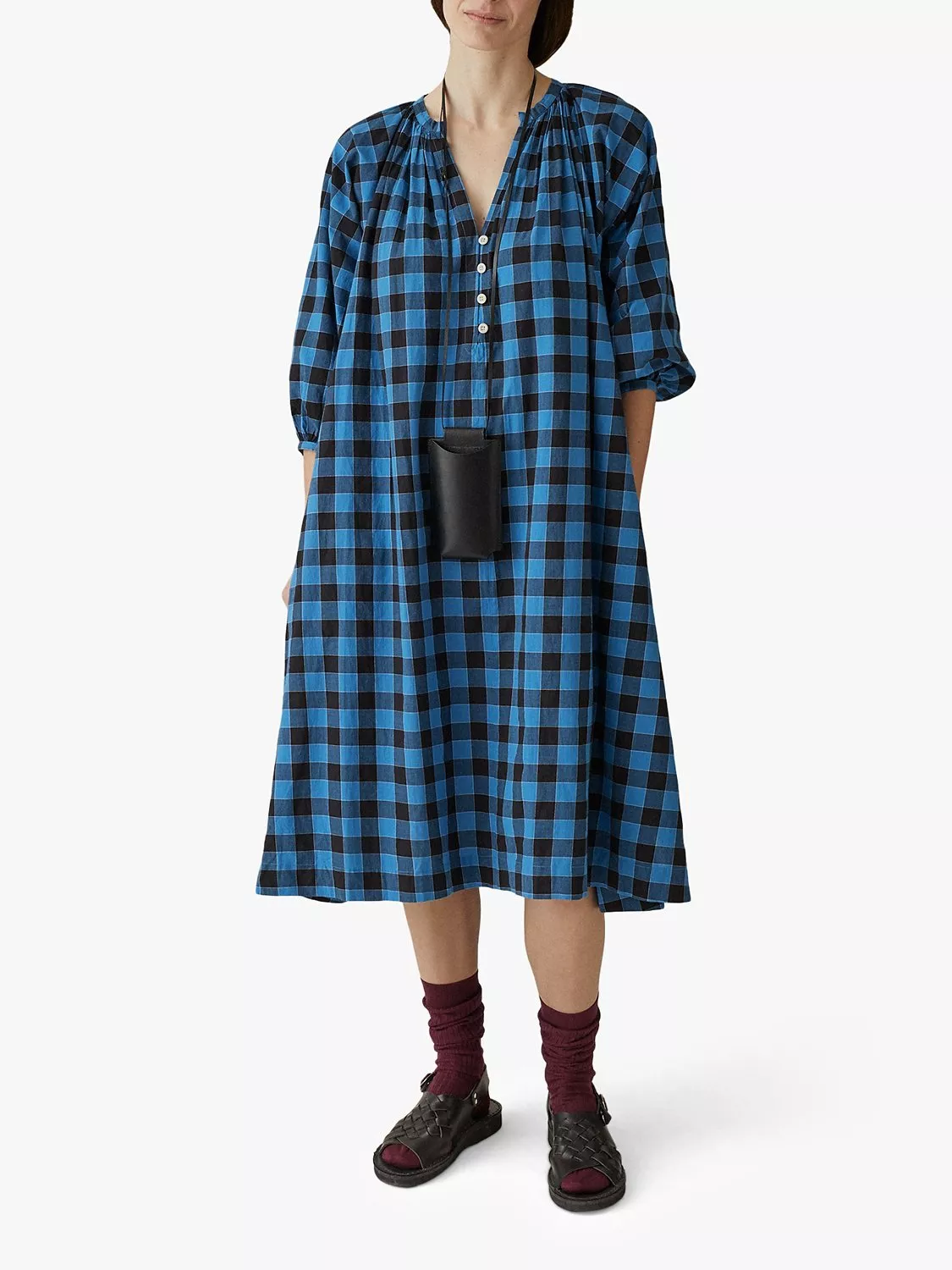 Supple and lightweight with a bold woven check, this Toast dress provides you with a stylish way to dress for the warm weather. Cut to an oversized, voluminous silhouette with a narrow wrap tie belt to cinch in the waist, it is finished with a neat row of rouleau loop buttons. Raglan sleeves complete the look. Try wearing with high top canvas trainers, or with chunky sandals.