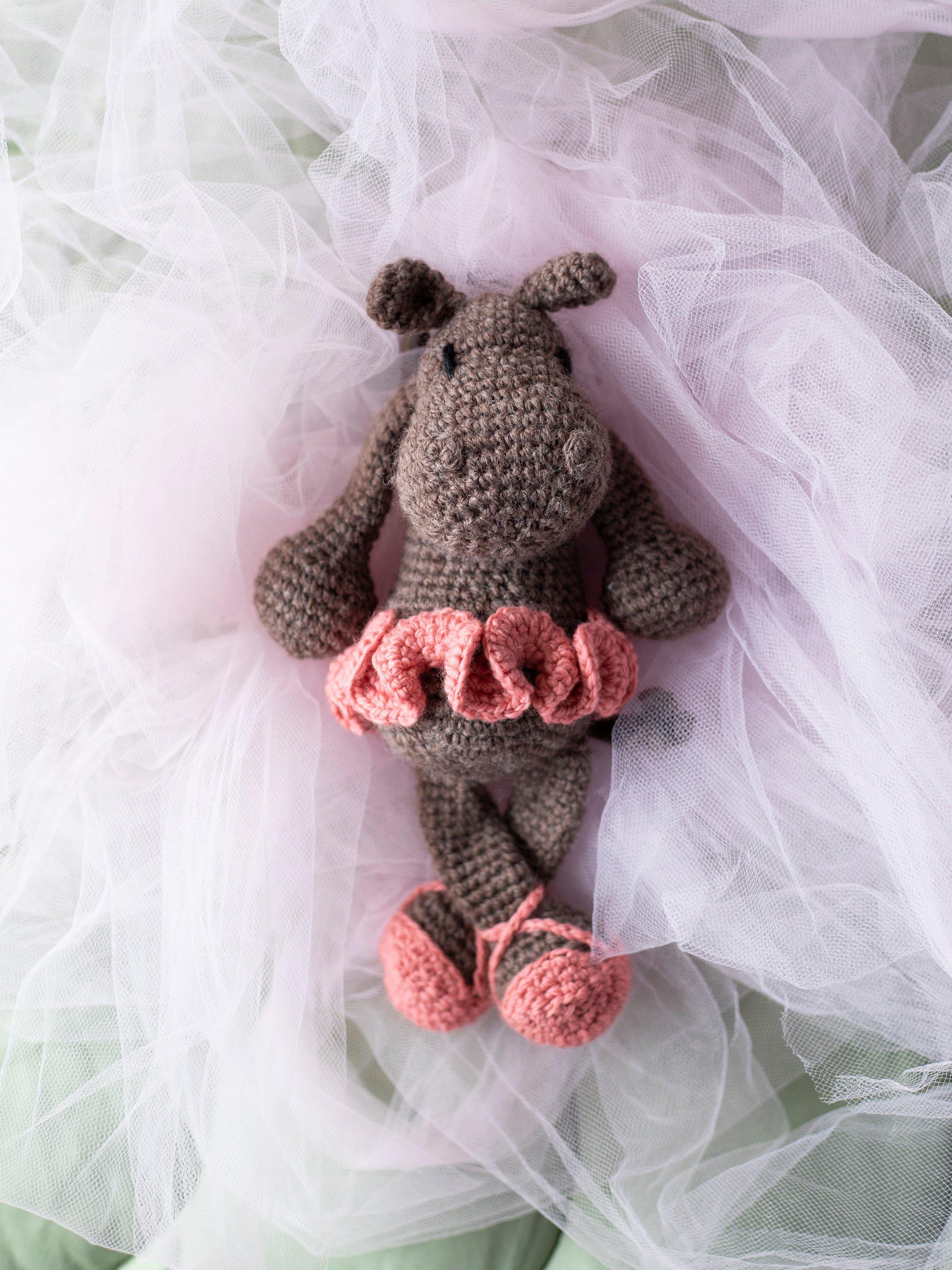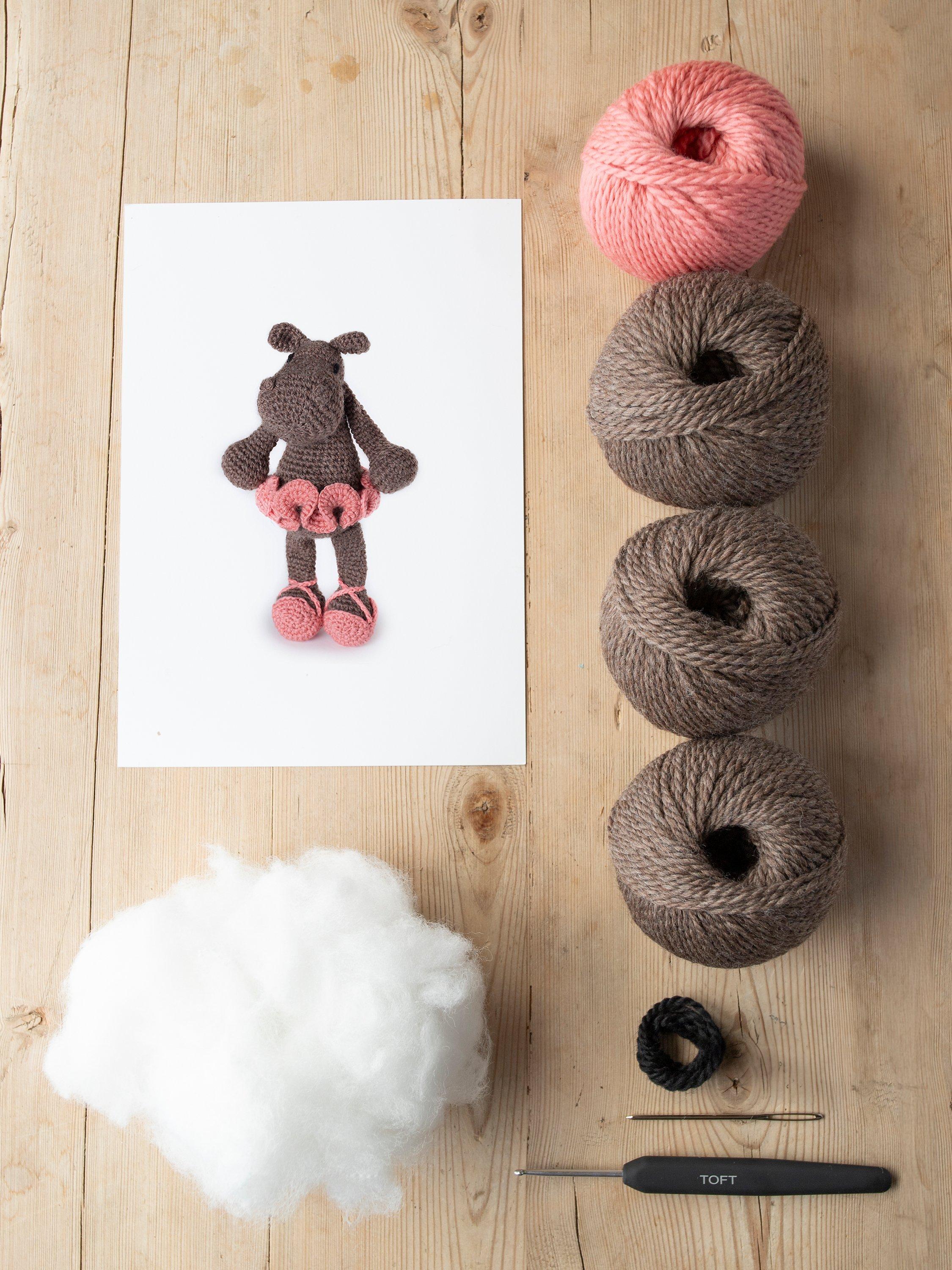 Each boxed Ballerina Hippo kit includes everything needed to complete the project: 100% luxury wool, crochet hook, needle, stuffing, eye threads and a pattern including a QR video link for lessons for all the techniques.