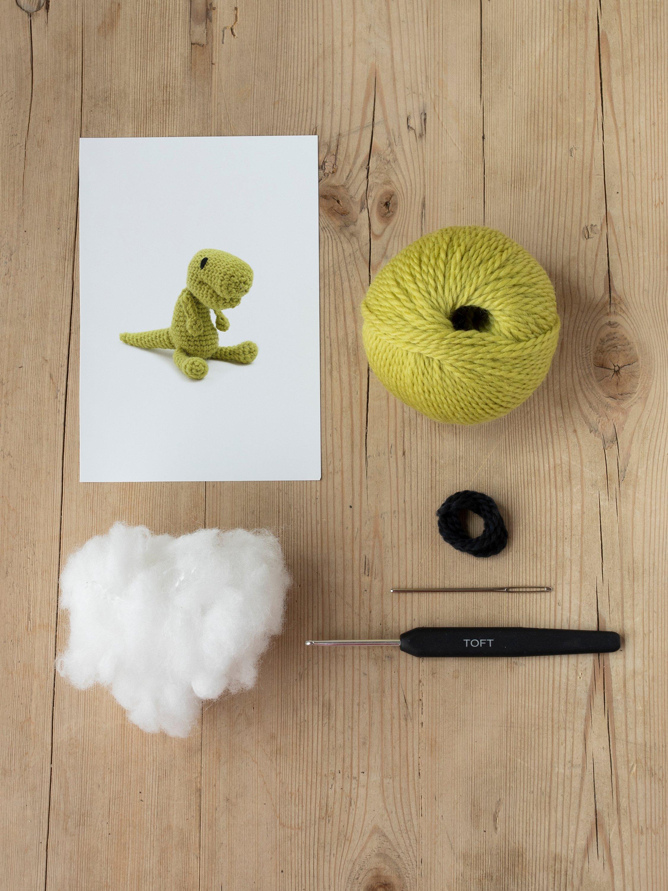 Part of the Edward's Menagerie collection of amigurumi crochet toys designed by best-selling author Kerry Lord, this kit is suitable for complete beginners and contains everything you'll need to crochet the T-Rex. It includes Toft's luxury British yarn along with the hi-loft polyester toy stuffing to fill your animal, a length of black yarn for the eyes, a crochet hook, a wool needle for sewing-up and full instructions to guide you through the process.