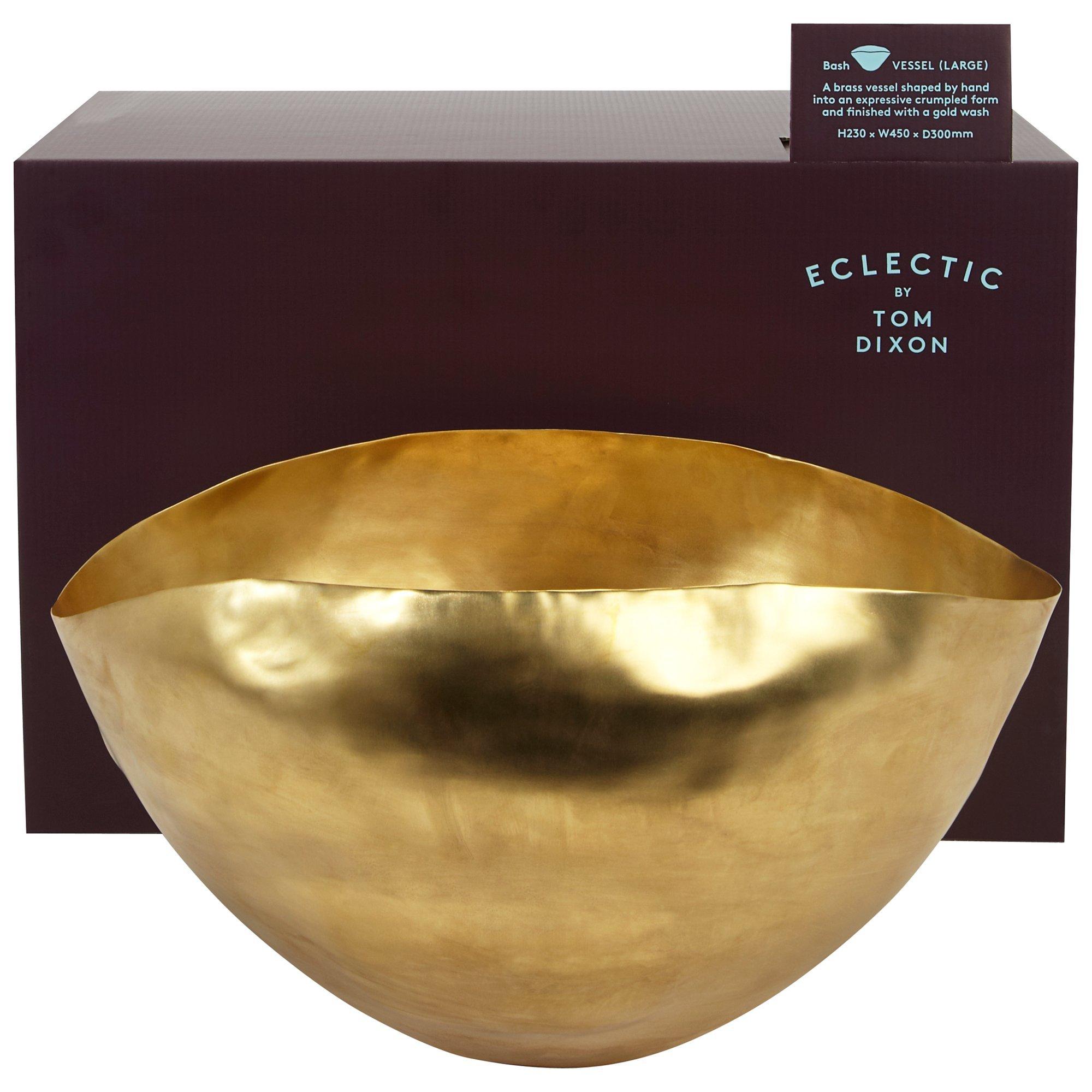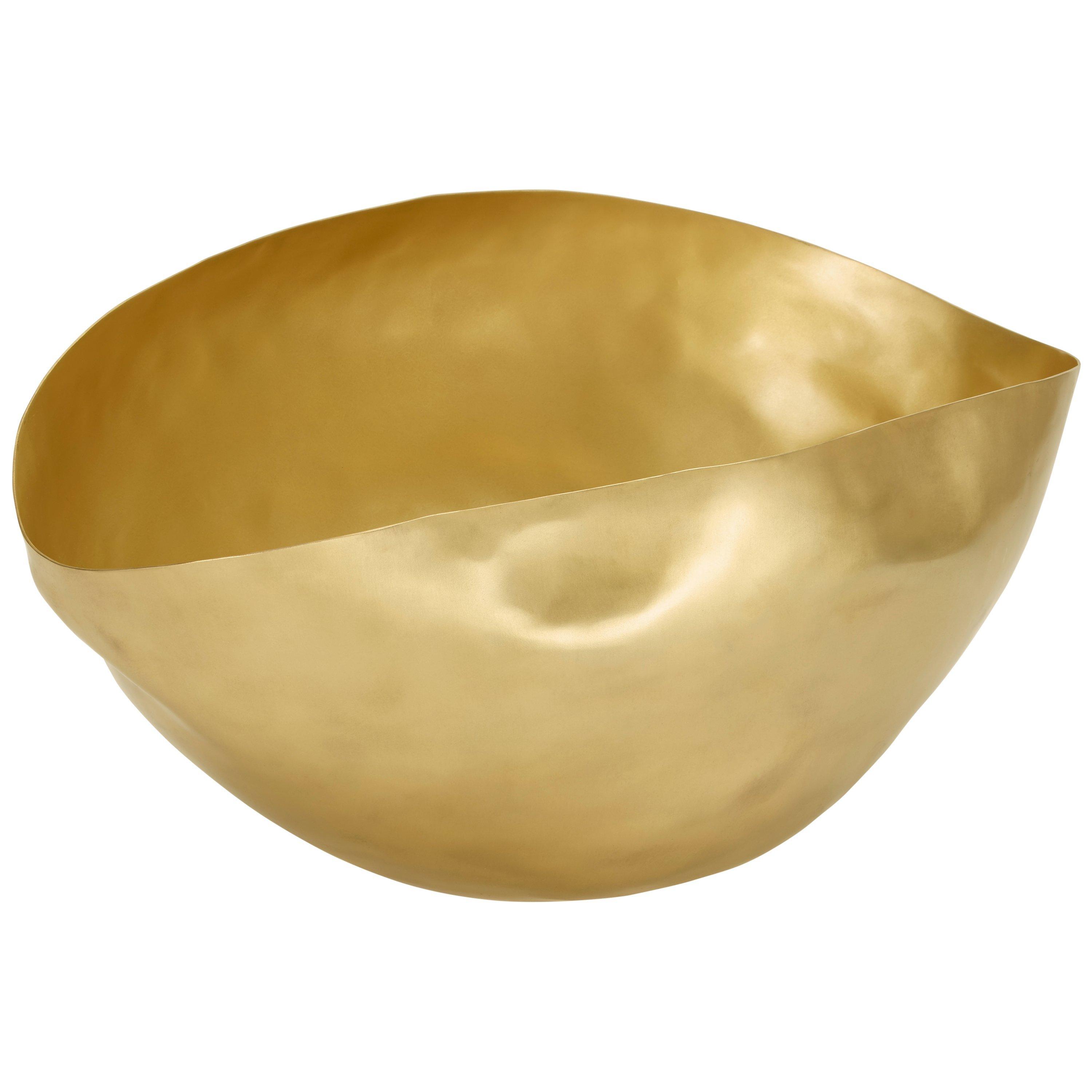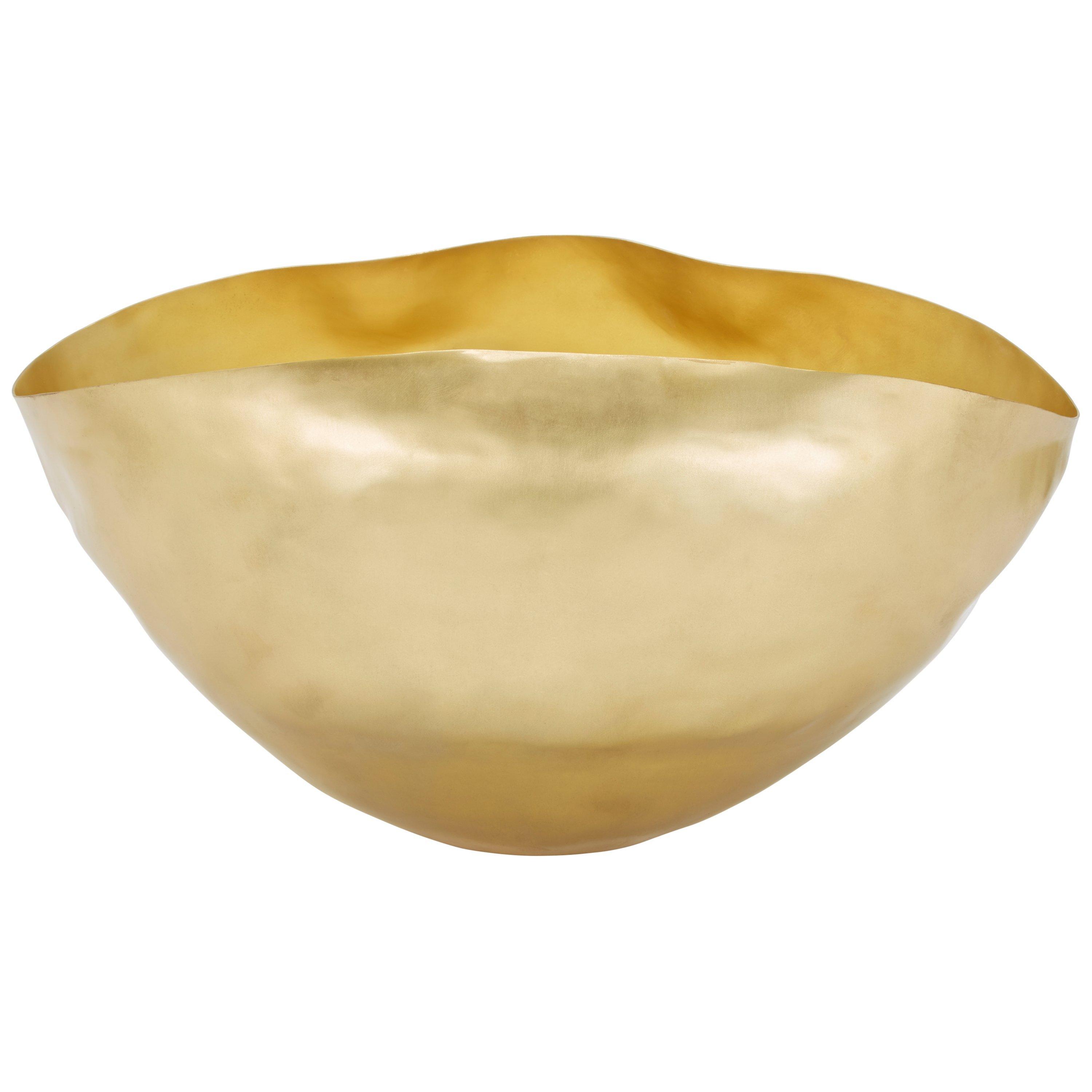 A brass vessel shaped by hand into an expressive crumpled form, this grand piece makes a dramatic addition to a room. Acting variously as an extravagant flower vase, fruit bowl or as a contemporary sculpture, it is a multi-faceted work that immediately intrigues and draws the eye. Available in small or large, to suit varying living spaces, each piece is unique in shape and finished with a gold wash.