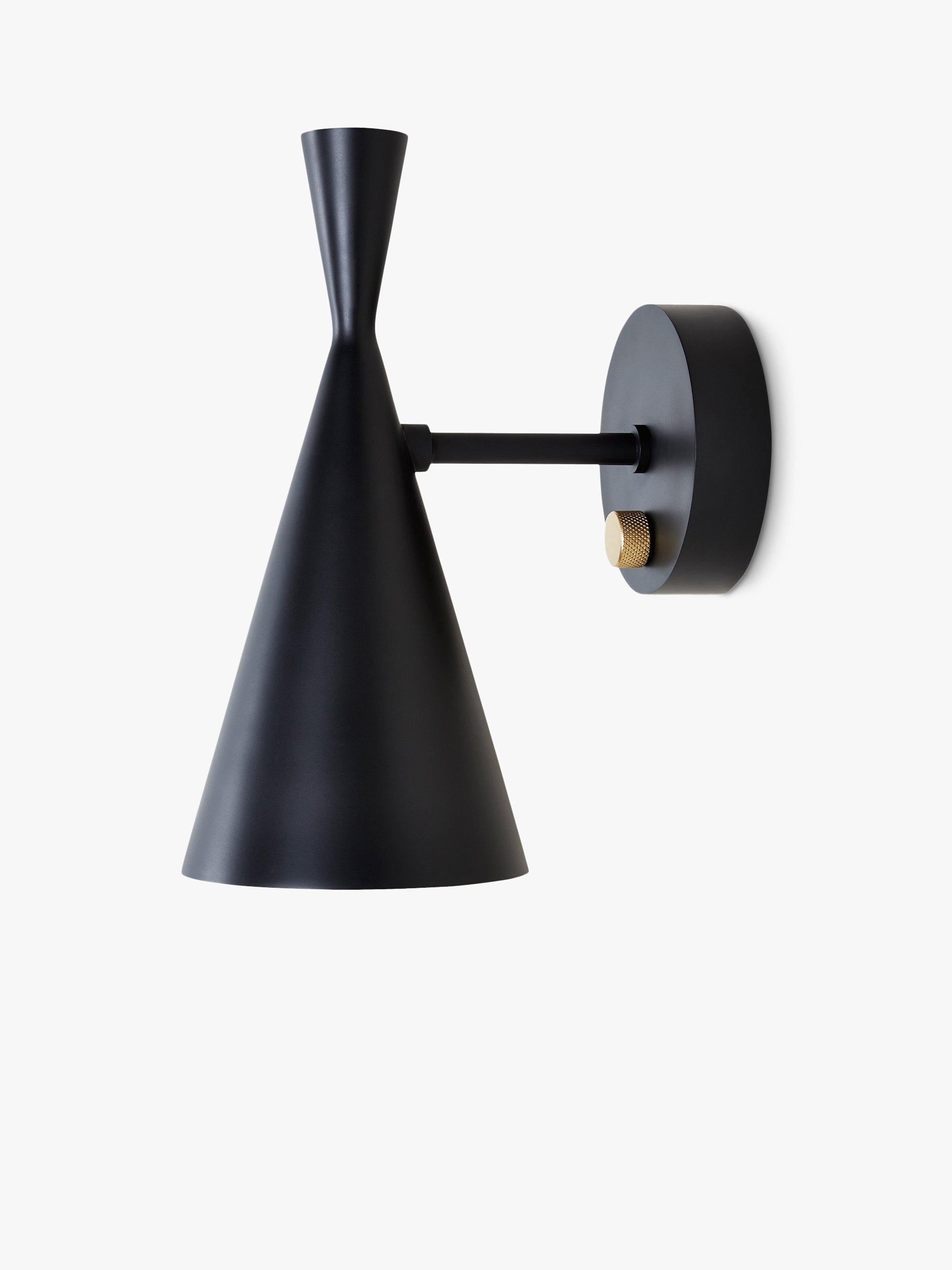 The Beat lighting range from Tom Dixon has been crafted and hand-beaten by experienced artisans in Moradabad, Northern India. Designed with a lacquered gloss white, or matt powder-coated black exterior, this single arm wall light has a striking golden interior that emanates a warm glow when lit. It also features a solid brass dimmer dial so that you can direct the exact amount of light you need.