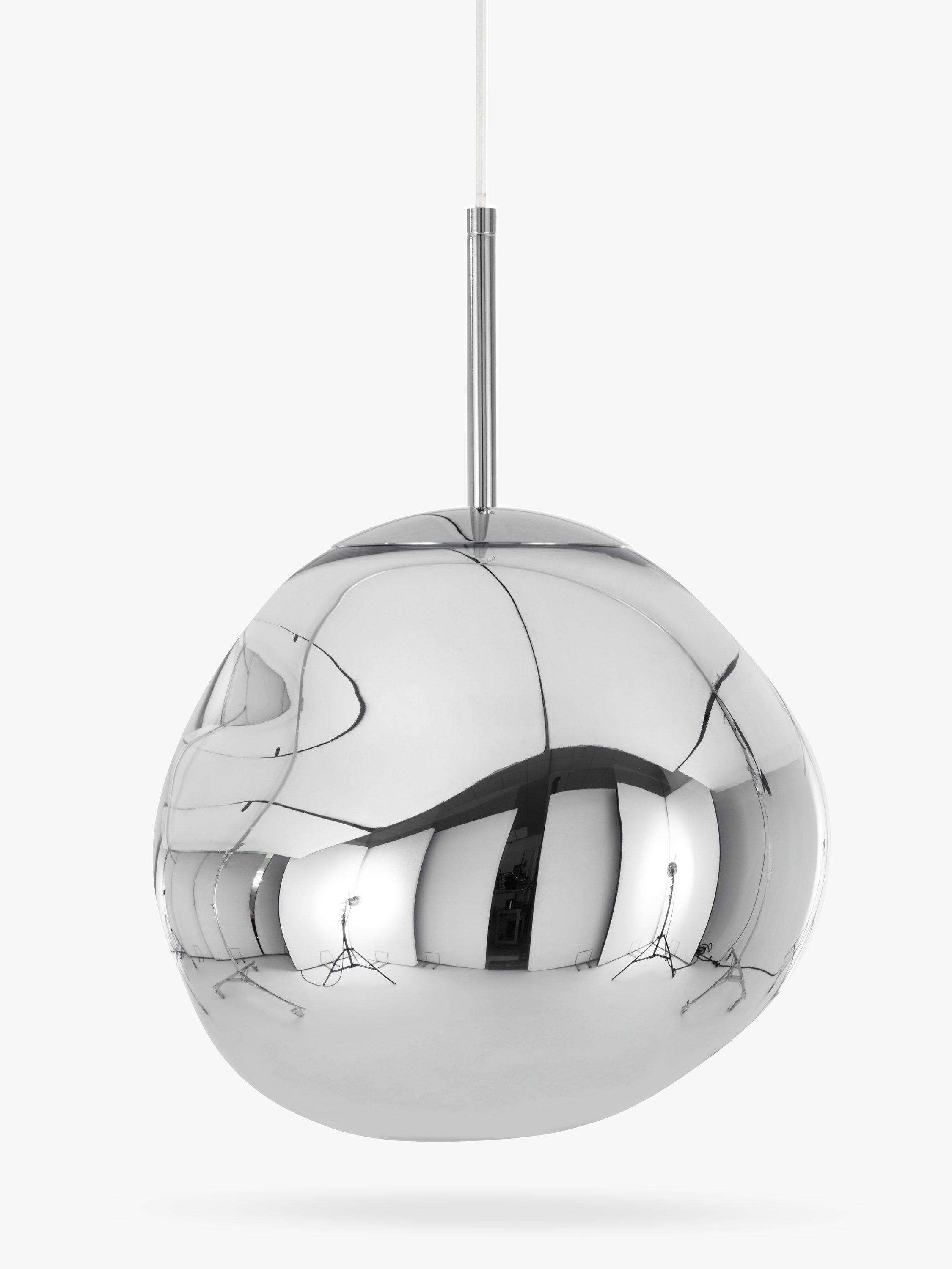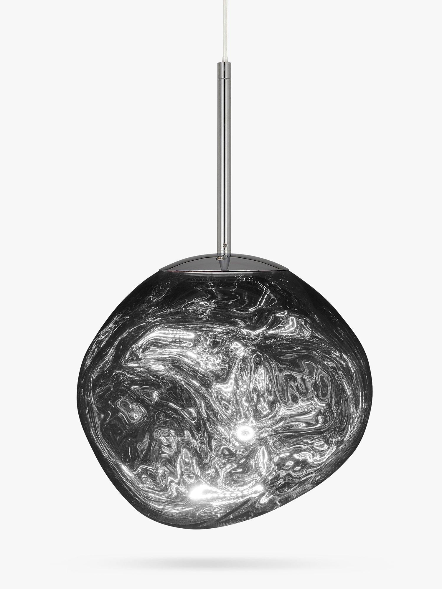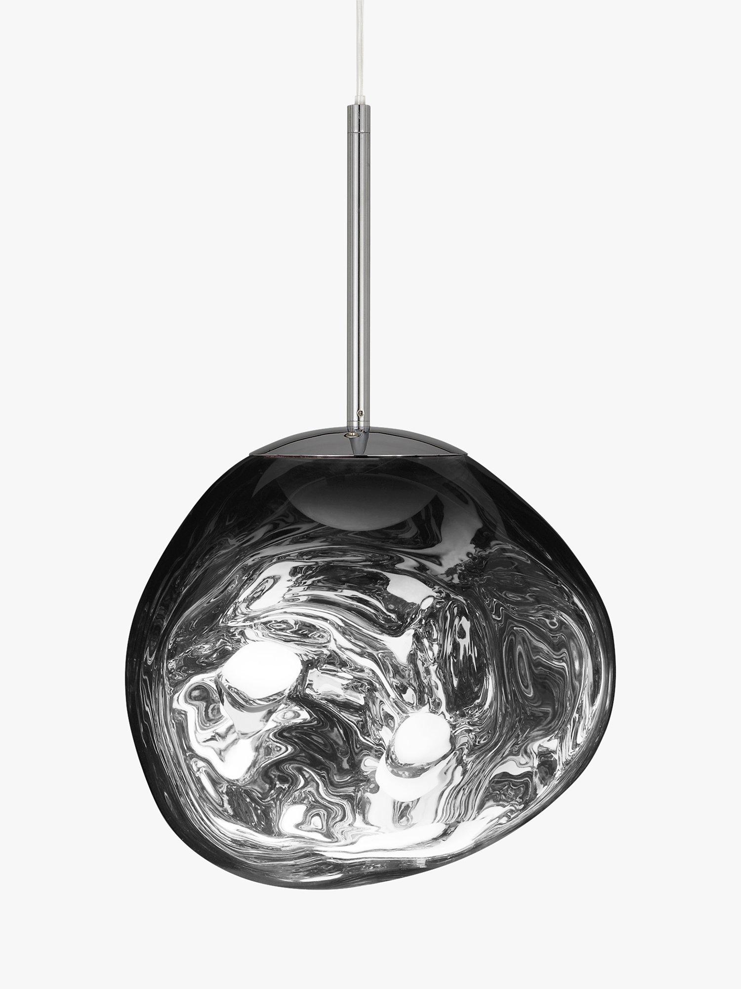 Melt is a beautifully distorted pendant in a modern finish and a matching ceiling rose. This integrated LED ceiling light creates a mesmerising, melting hot blown glass effect when on and a mirror-finish effect when off.