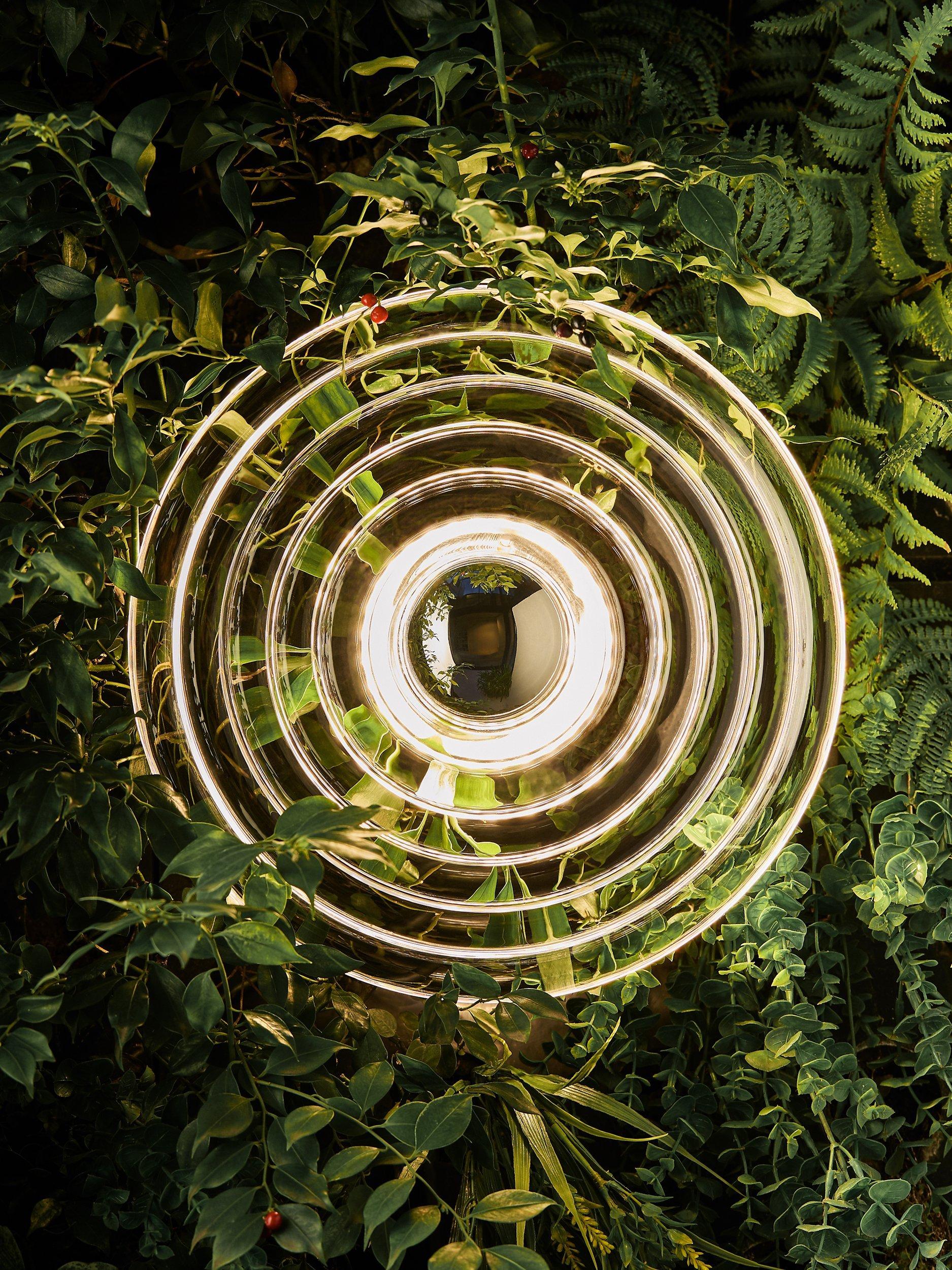The metal dome on the surface light has been upgraded from a flat cap to a curved dome, for a cleaner aesthetic. The tiny bubbles in the glass are a celebration of how the products are made and naturally appear when the glass is hand-pressed.