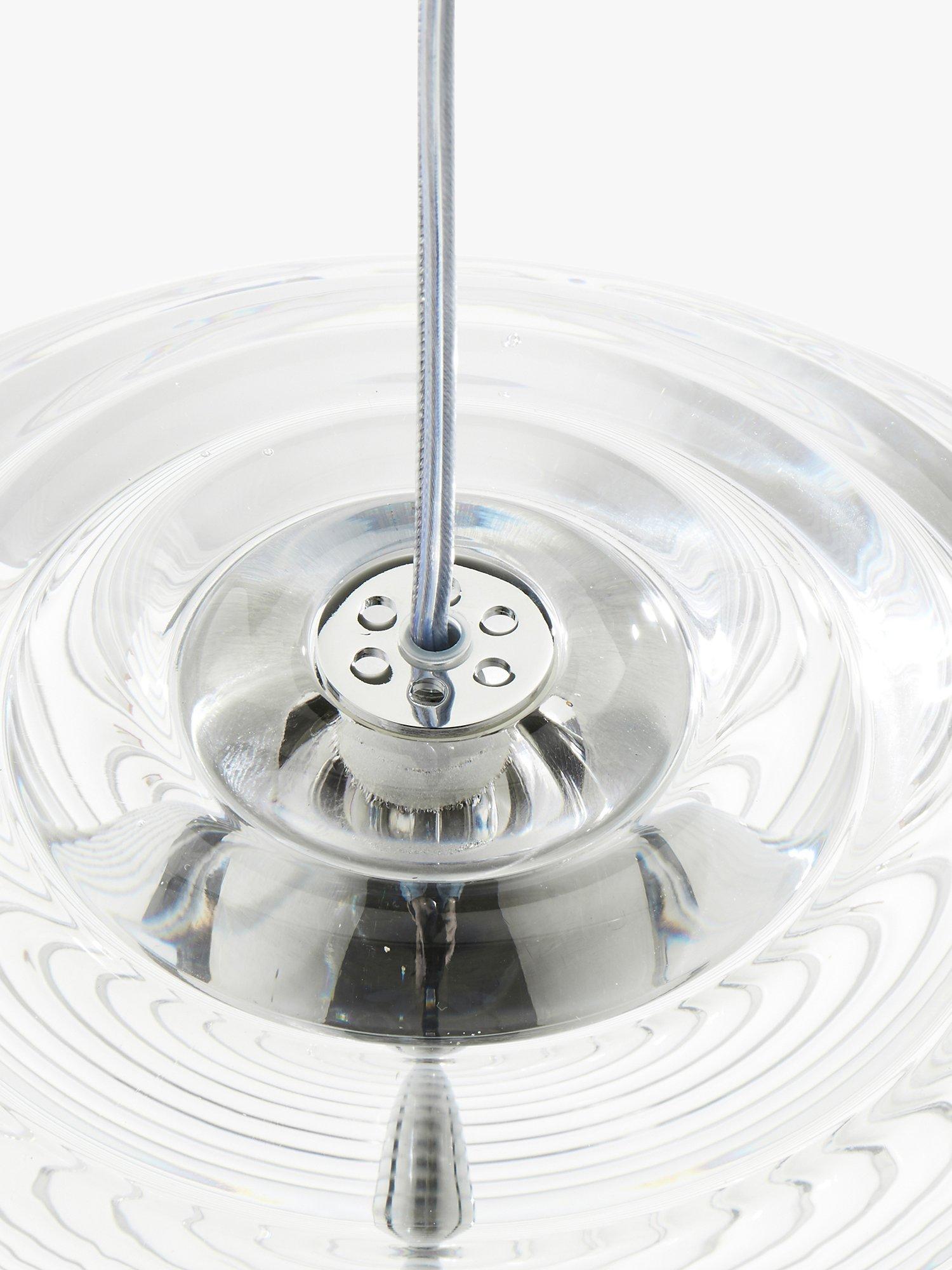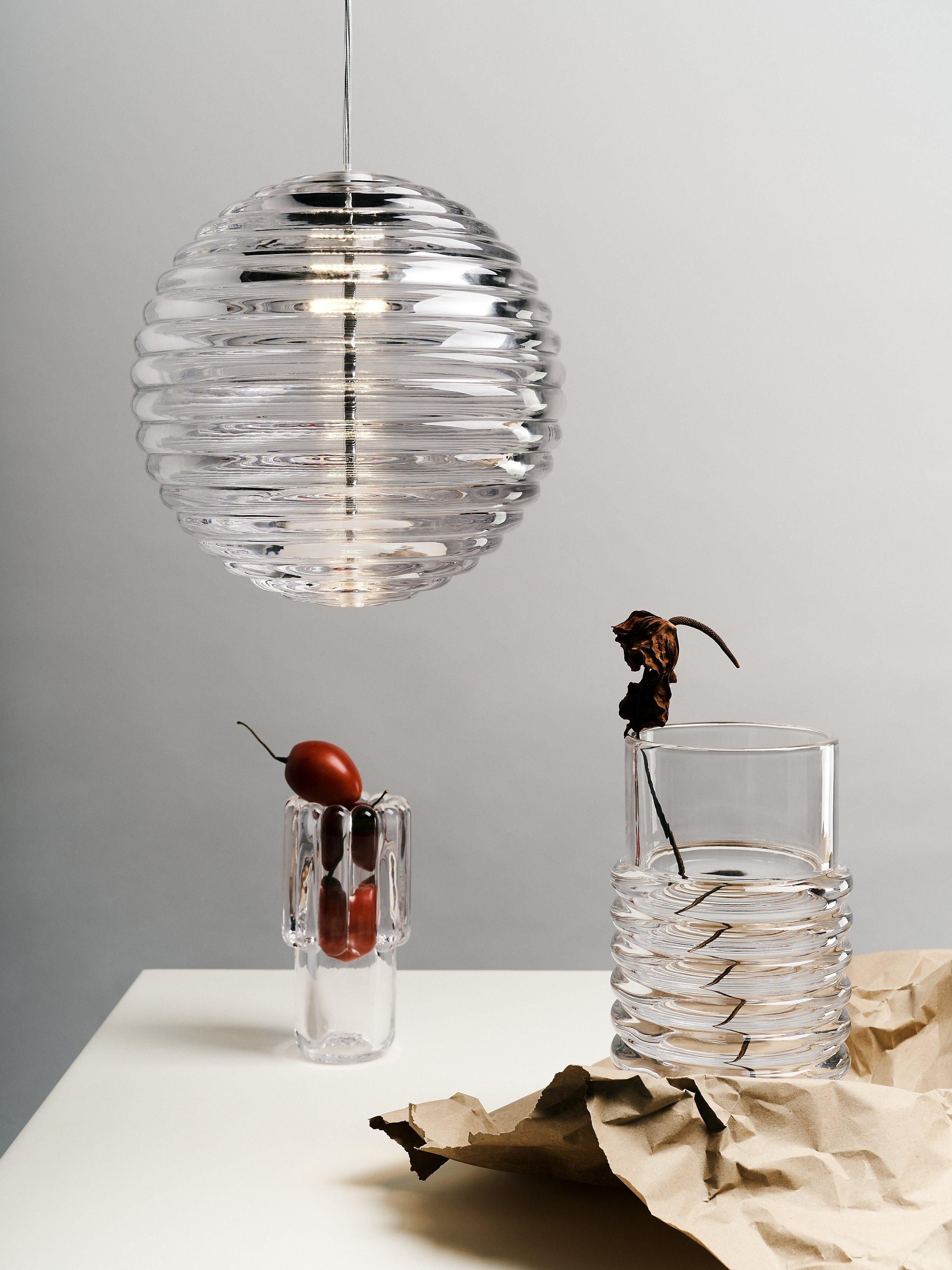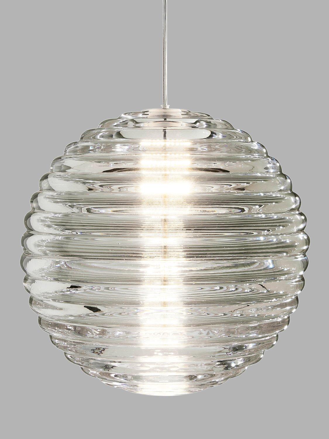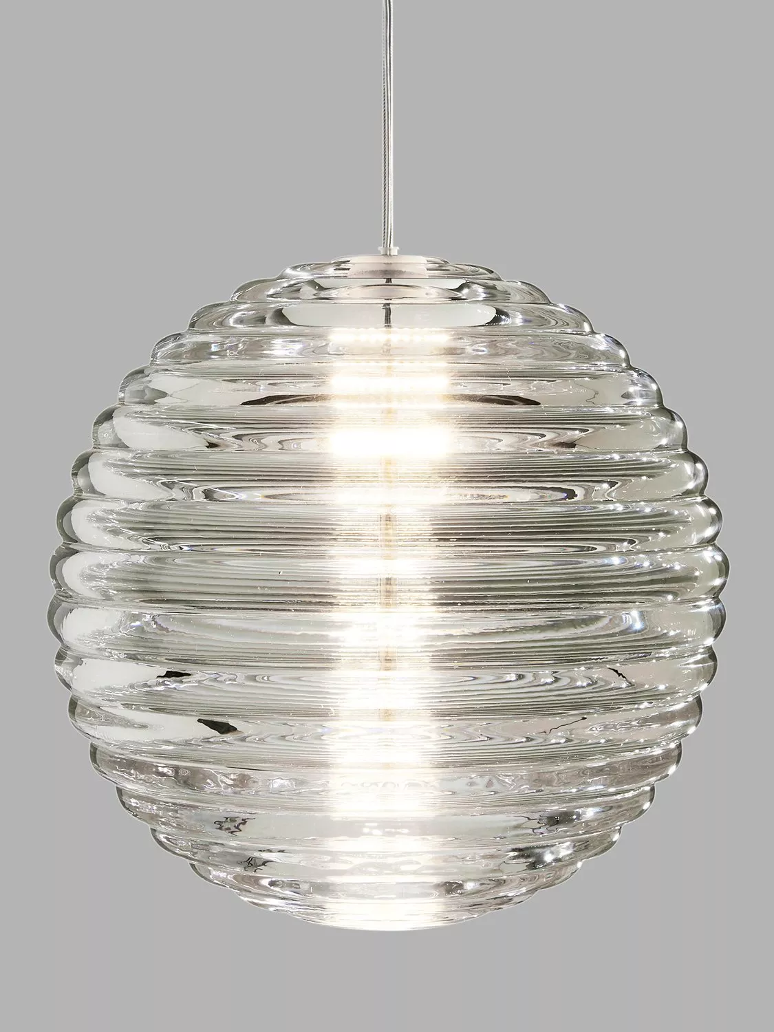 Press, by Tom Dixon, is a series of lights made from the thickest and most transparent glass with a satisfyingly rounded linear surface detail. Aptly named Sphere, this bold ceiling pendant is reminiscent of a shipping buoy and its ribbed glass design diffuses the light from the integrated LED, creating linear and stripey patterns. Press is manufactured by dropping massive globs of molten glass at 1,200 degrees centigrade, pressed in iron moulds under tons of pressure to create immensely durable lights. This light is height-adjustable at the point of installation.