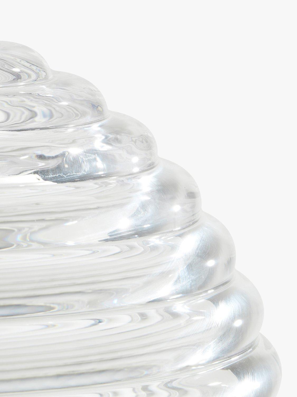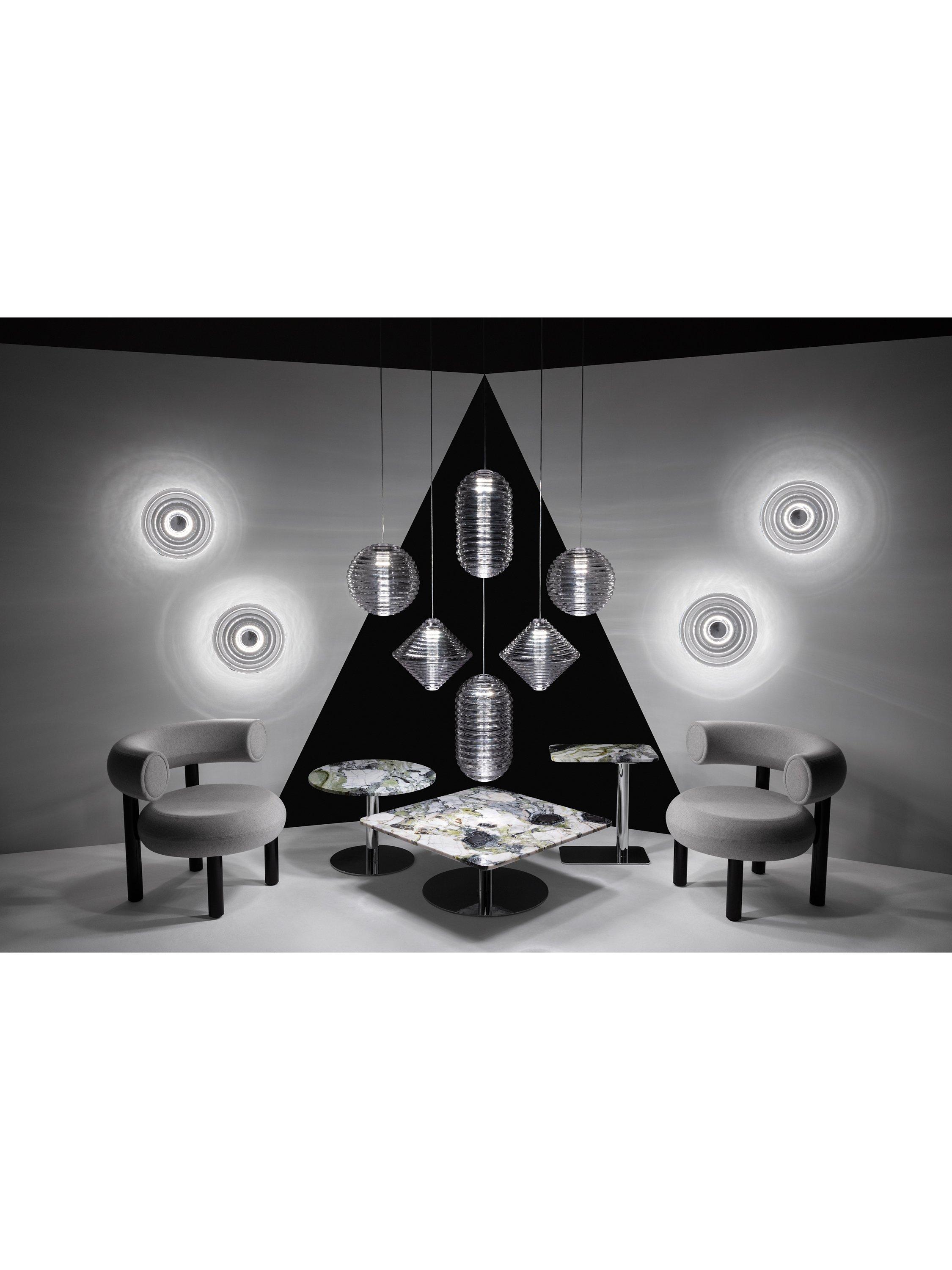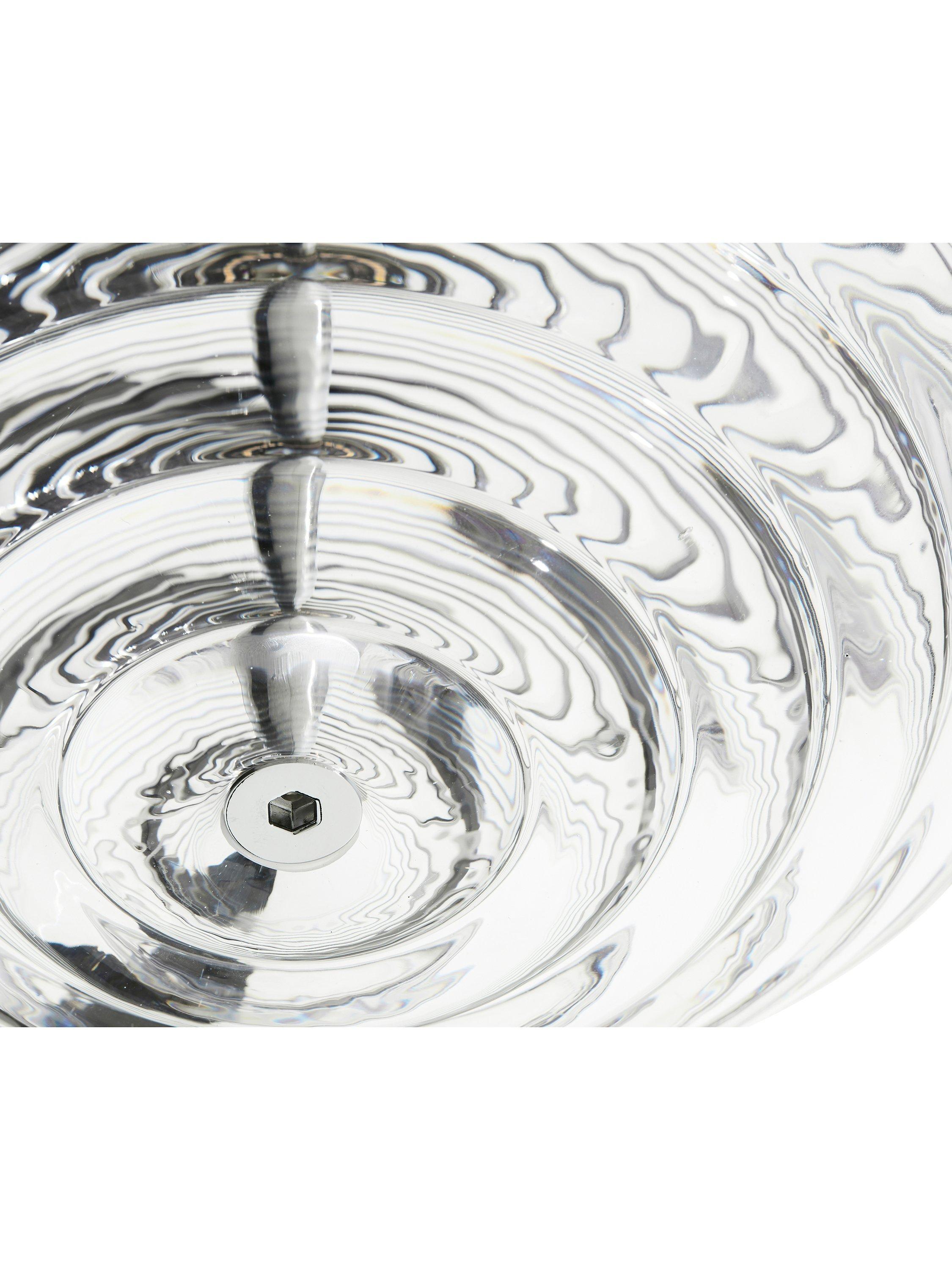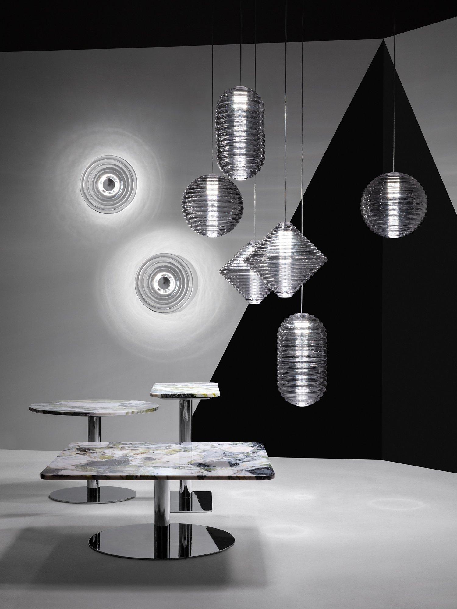 Press, by Tom Dixon, is a series of lights made from the thickest and most transparent glass with a satisfyingly rounded linear surface detail. Aptly named Sphere, this bold ceiling pendant is reminiscent of a shipping buoy and its ribbed glass design diffuses the light from the integrated LED, creating linear and stripey patterns. Press is manufactured by dropping massive globs of molten glass at 1,200 degrees centigrade, pressed in iron moulds under tons of pressure to create immensely durable lights. This light is height-adjustable at the point of installation.
