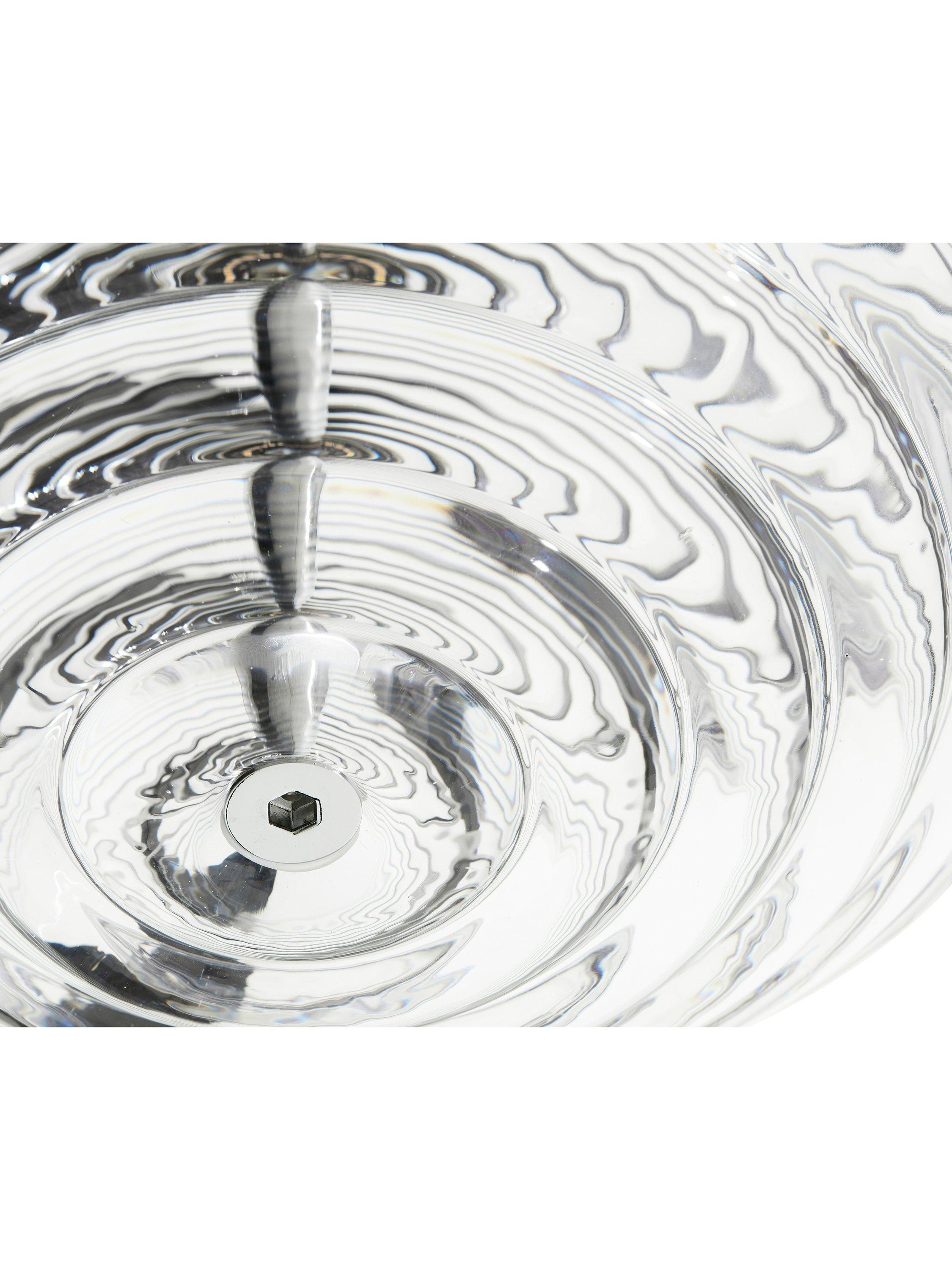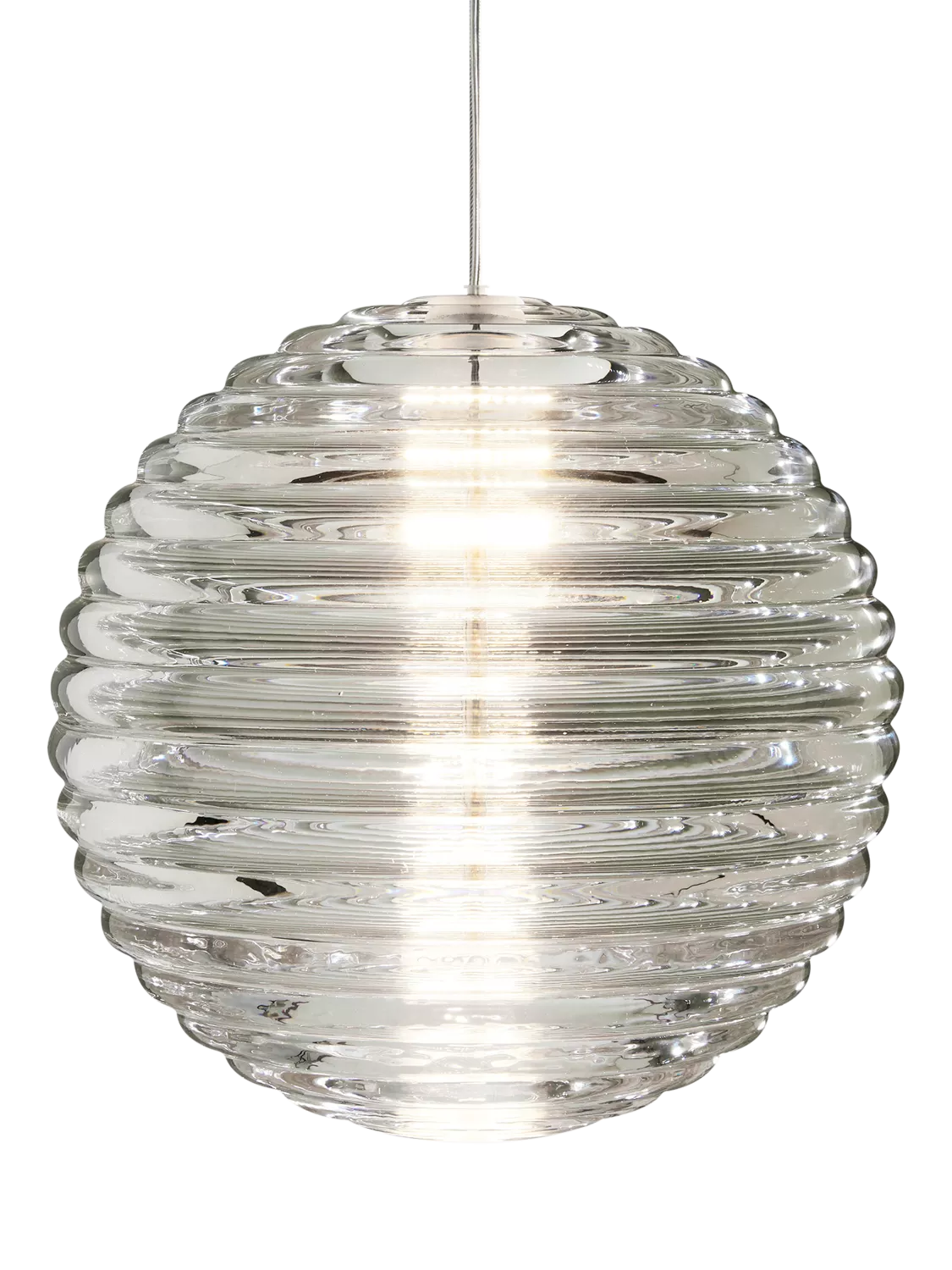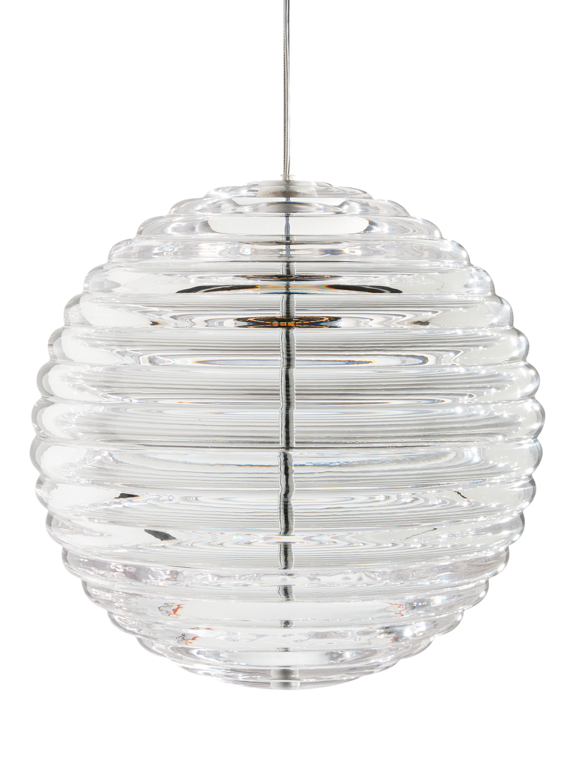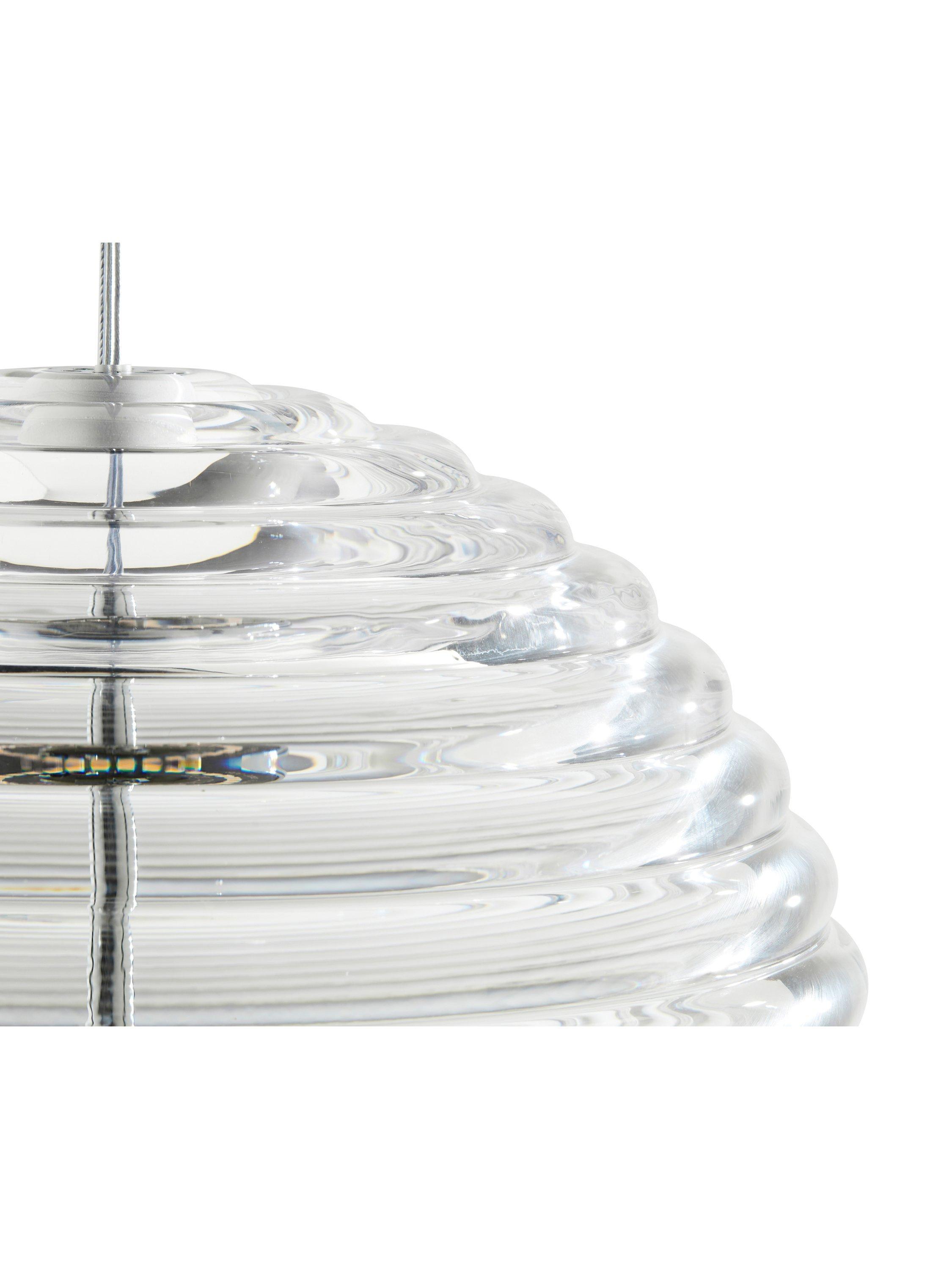 Tom Dixon's Press lighting range is made from the thickest and most transparent glass with a satisfyingly rounded linear surface detail. Aptly named Sphere, this shape in the range is reminiscent of shipping buoys and children's toys. The ribbed glass diffuses the light source and projects linear and stripy patterns.