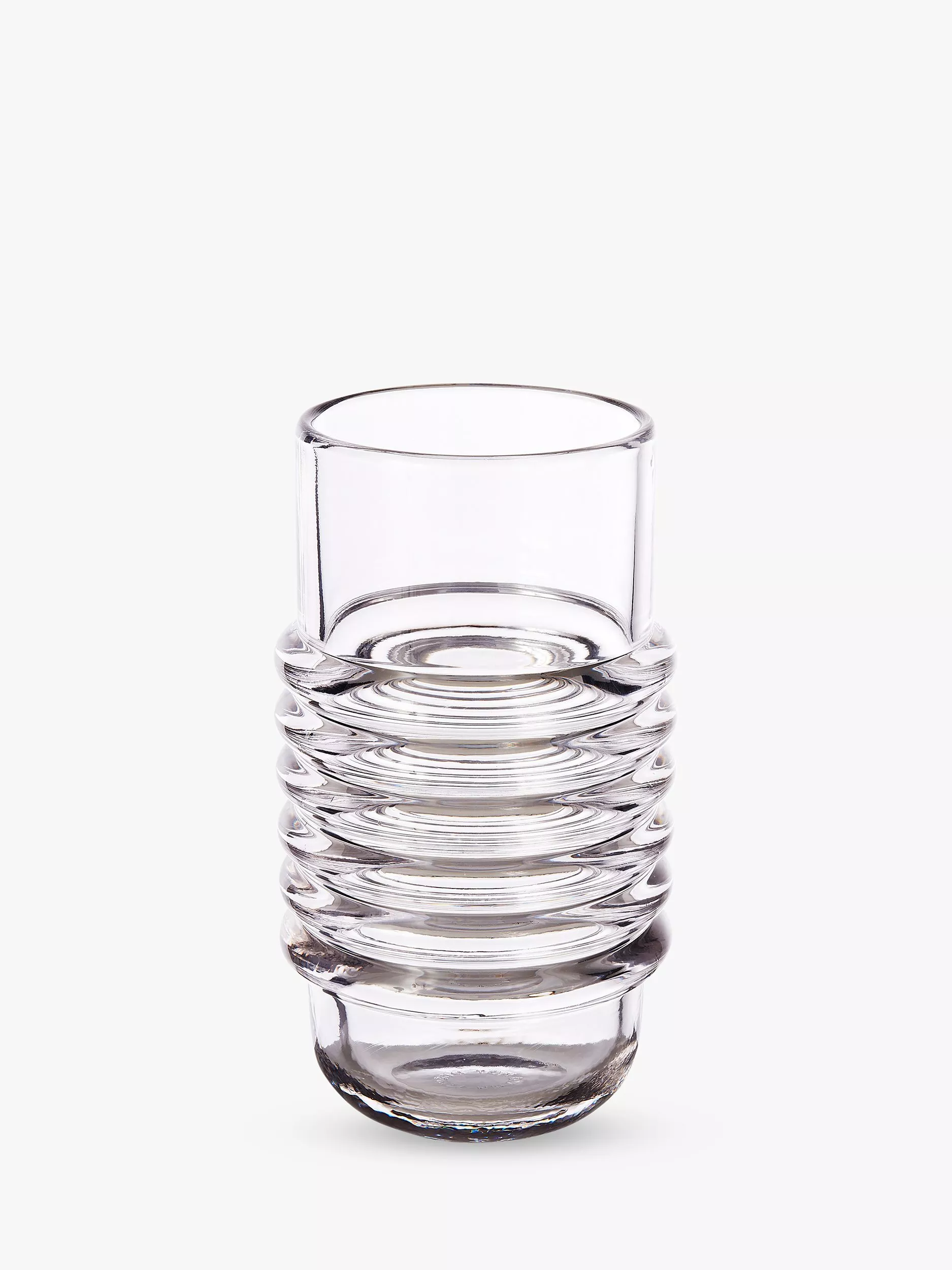 Part of the Press range from Tom Dixon, this vase is made from heavyweight glass that's industrially pressed into an iron mould. It's perfectly engineered to create a kaleidoscopic light show as the rib-like middle refracts light through the glass. This simple addition of ribbing gives the traditional column shape a new and modern edge, creating the illusion of bent stems through the vase.
