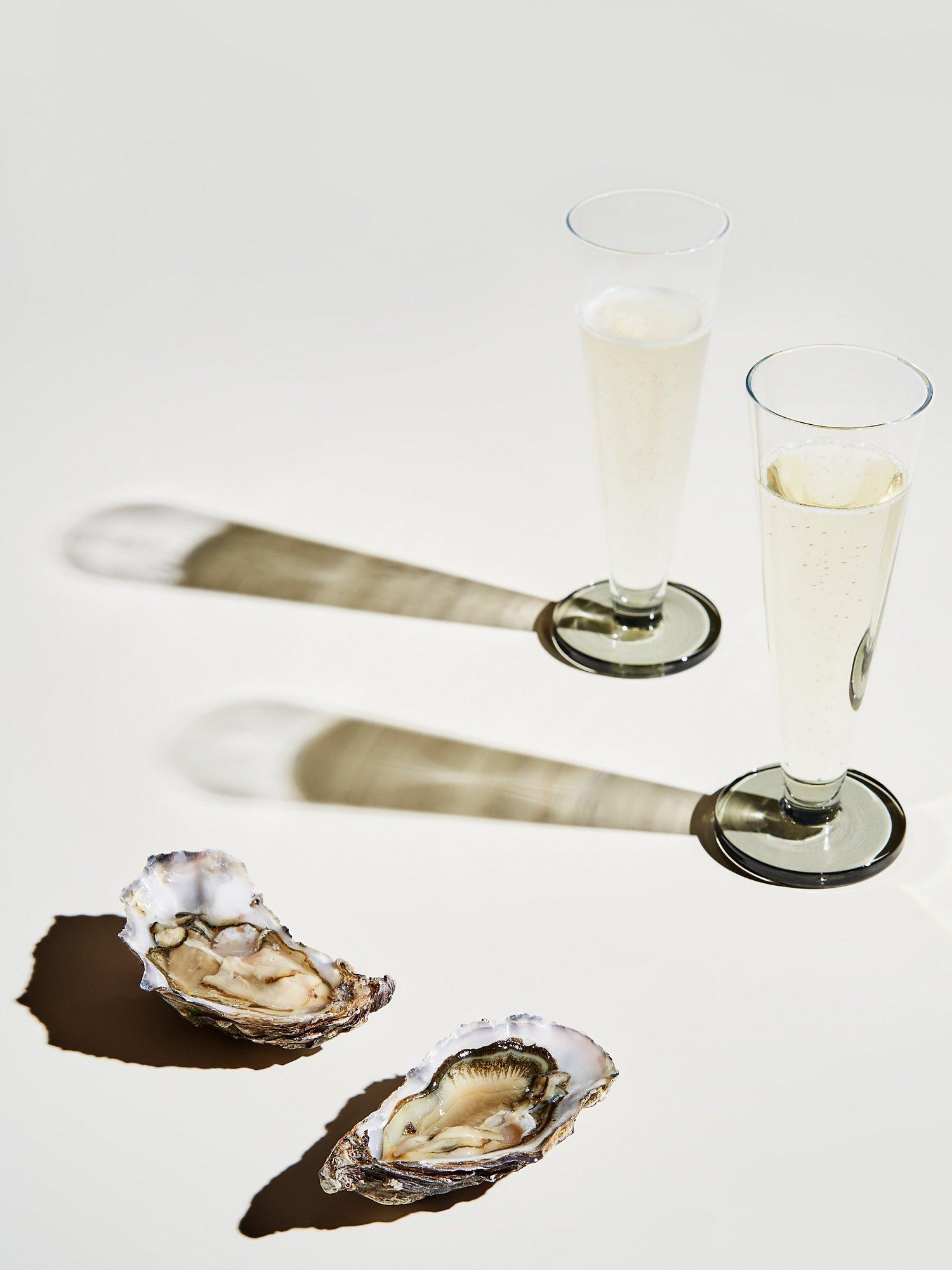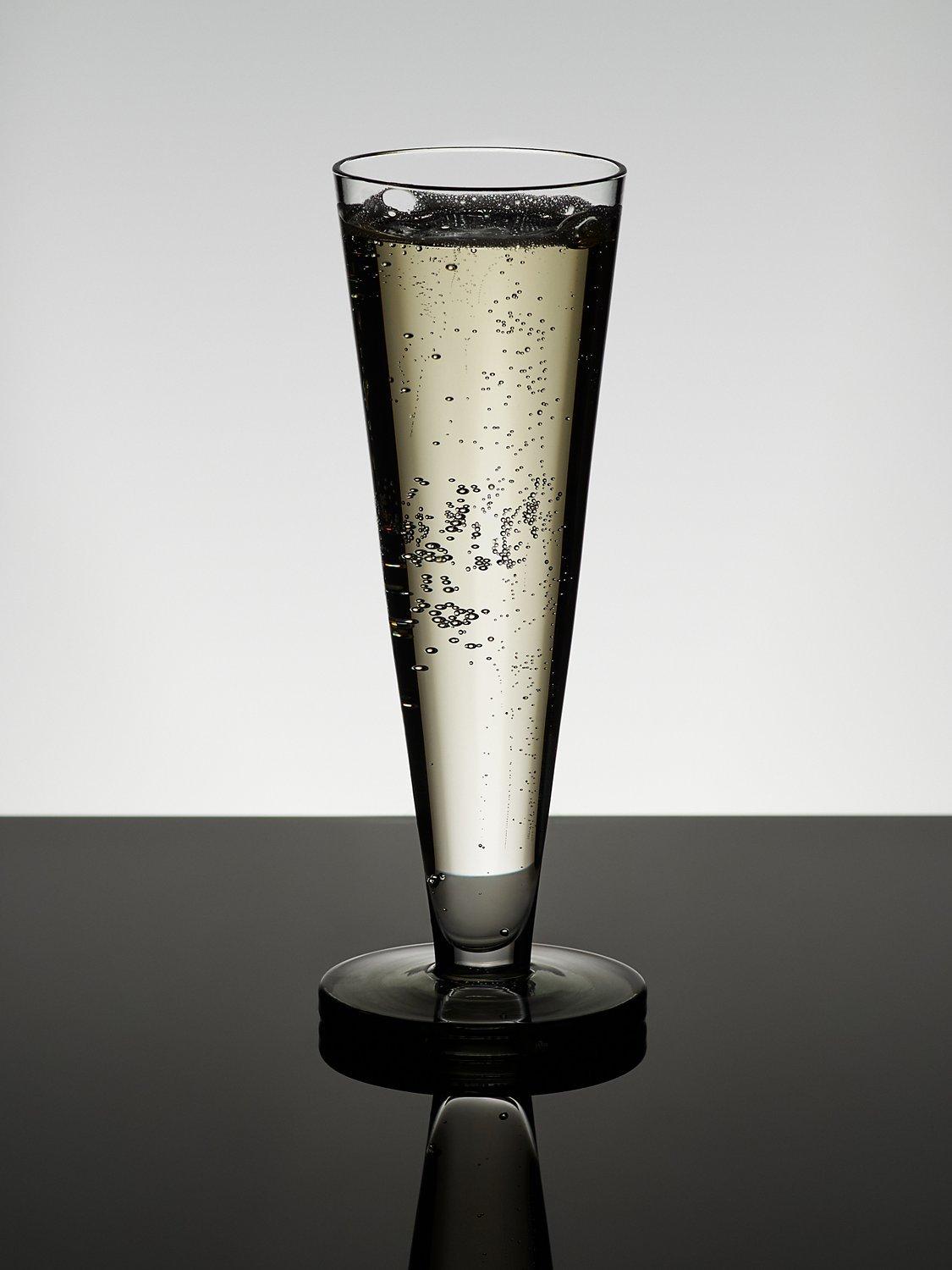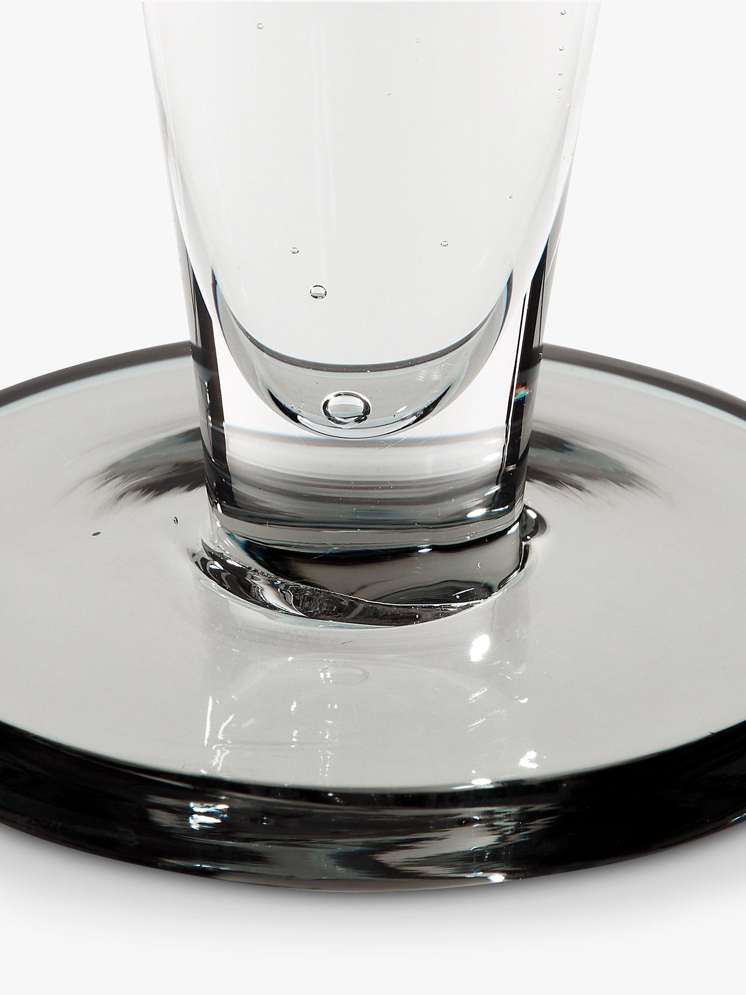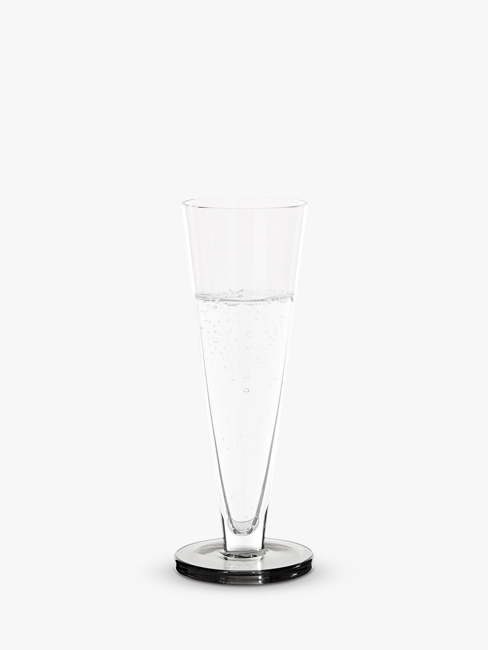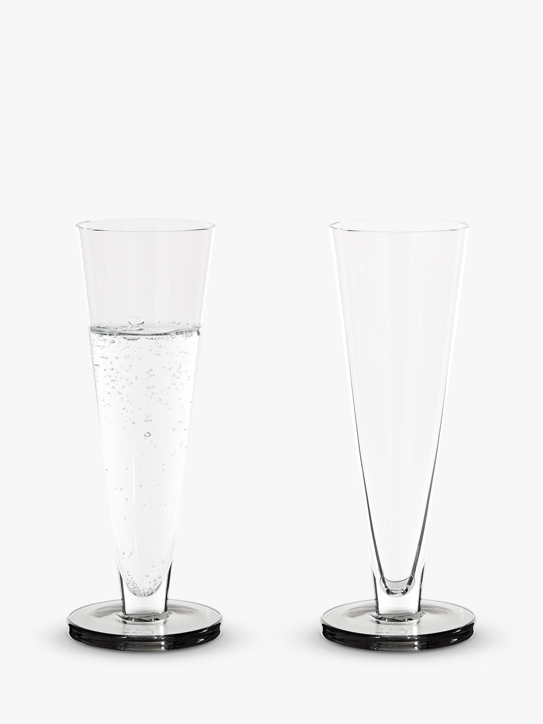 A pair of flute glasses from Tom Dixon made of mouth-blown glass and with the slightest hint of smokey colour.