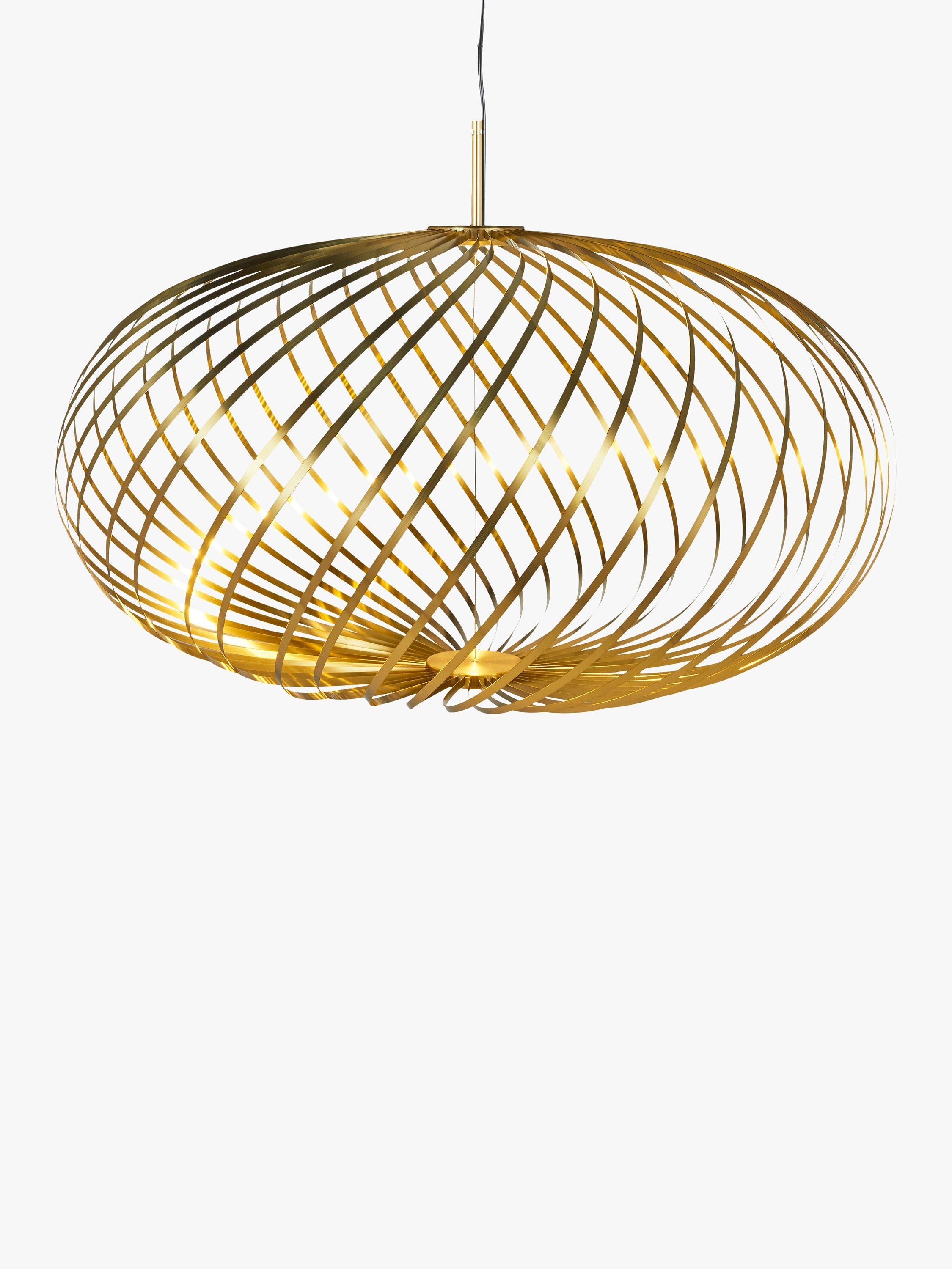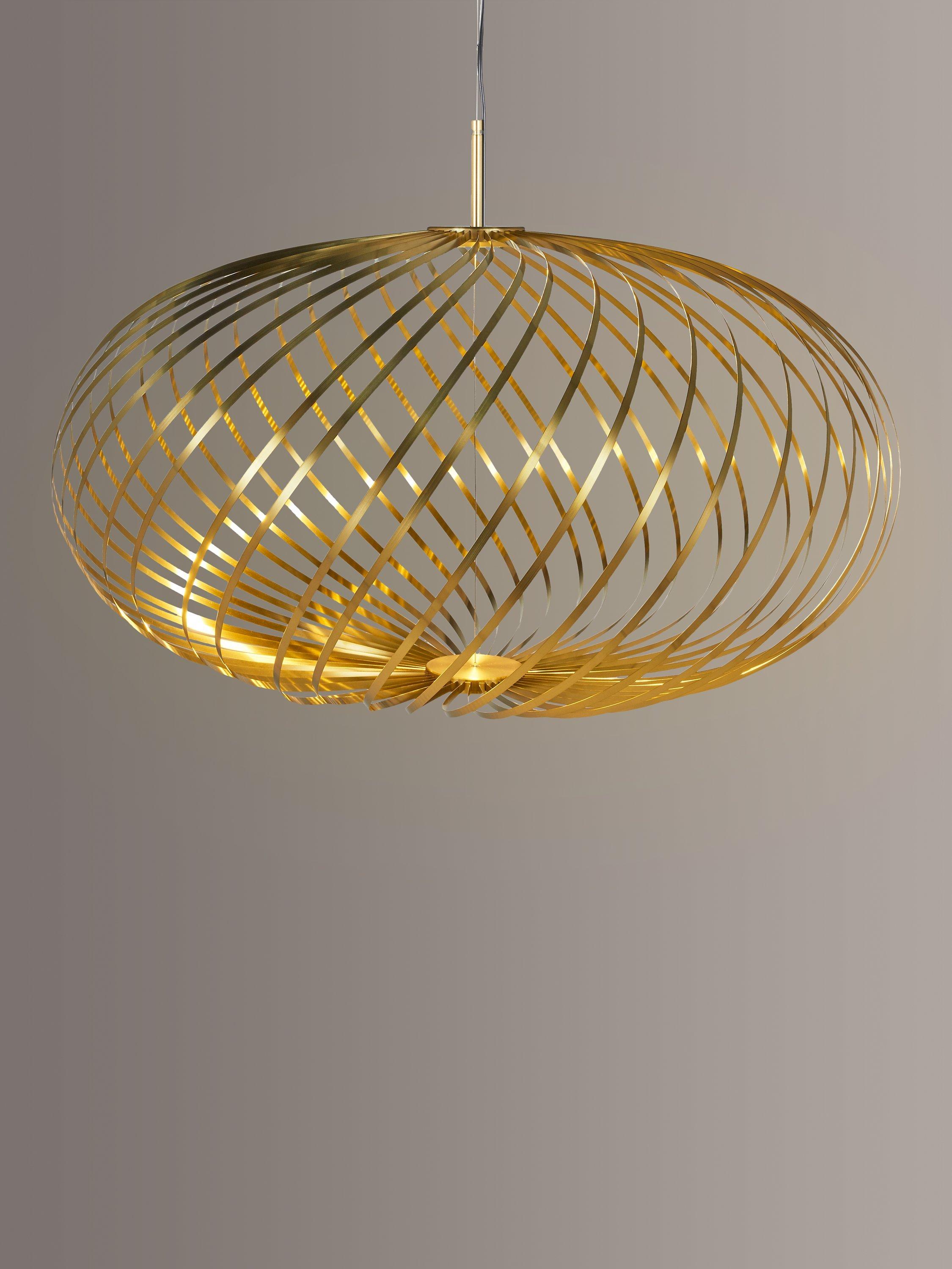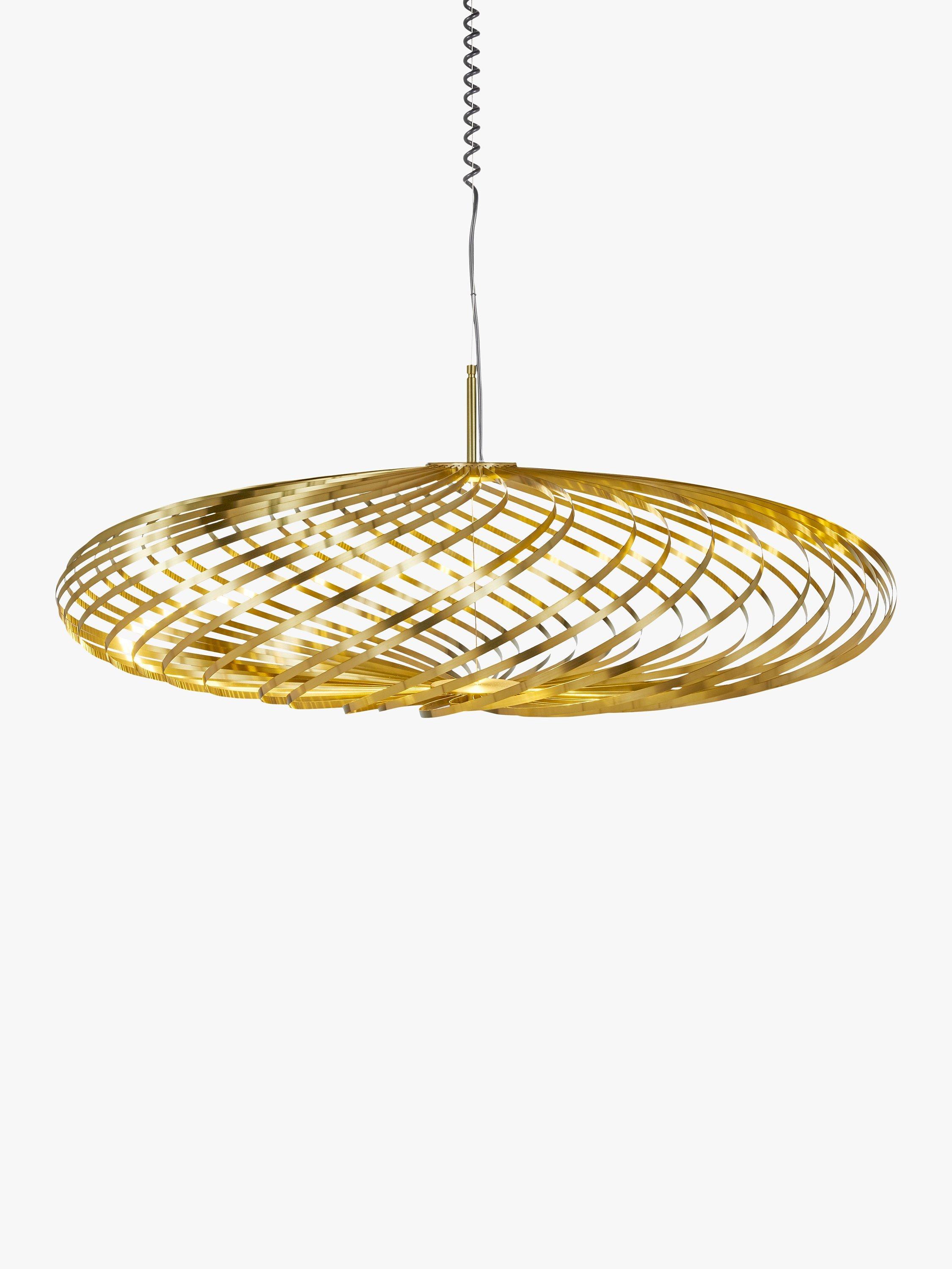 Designed from ribbons of high-performance plated steel and featuring an integrated LED module, the Spring range from Tom Dixon offers a striking lighting solution. The ribbons, finished in either a brass effect or painted white, are arranged like a whisk around the light source to create the pendant's disc silhouette, that allows light to spill through each strand.