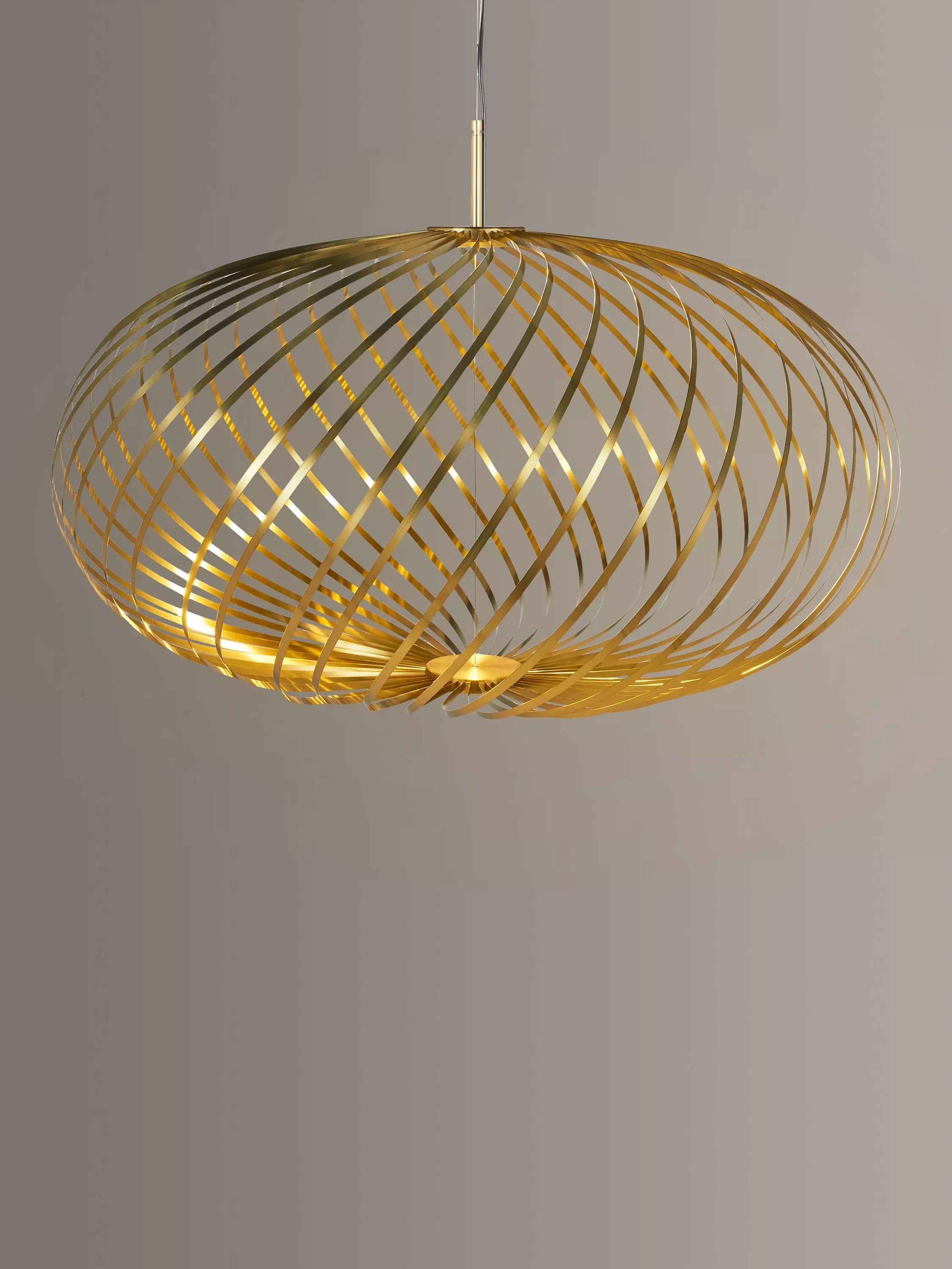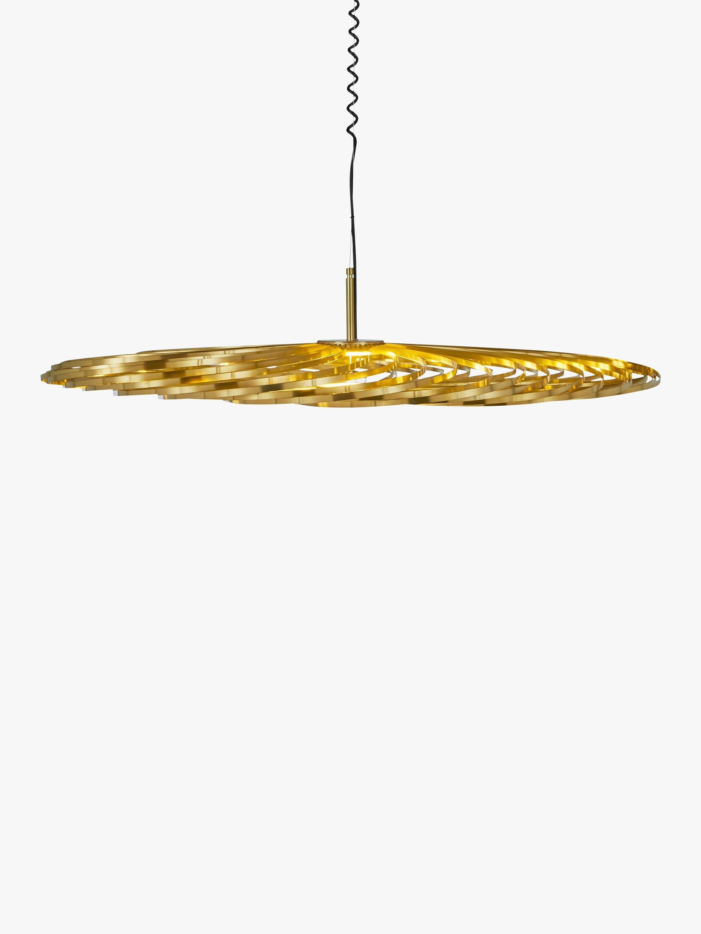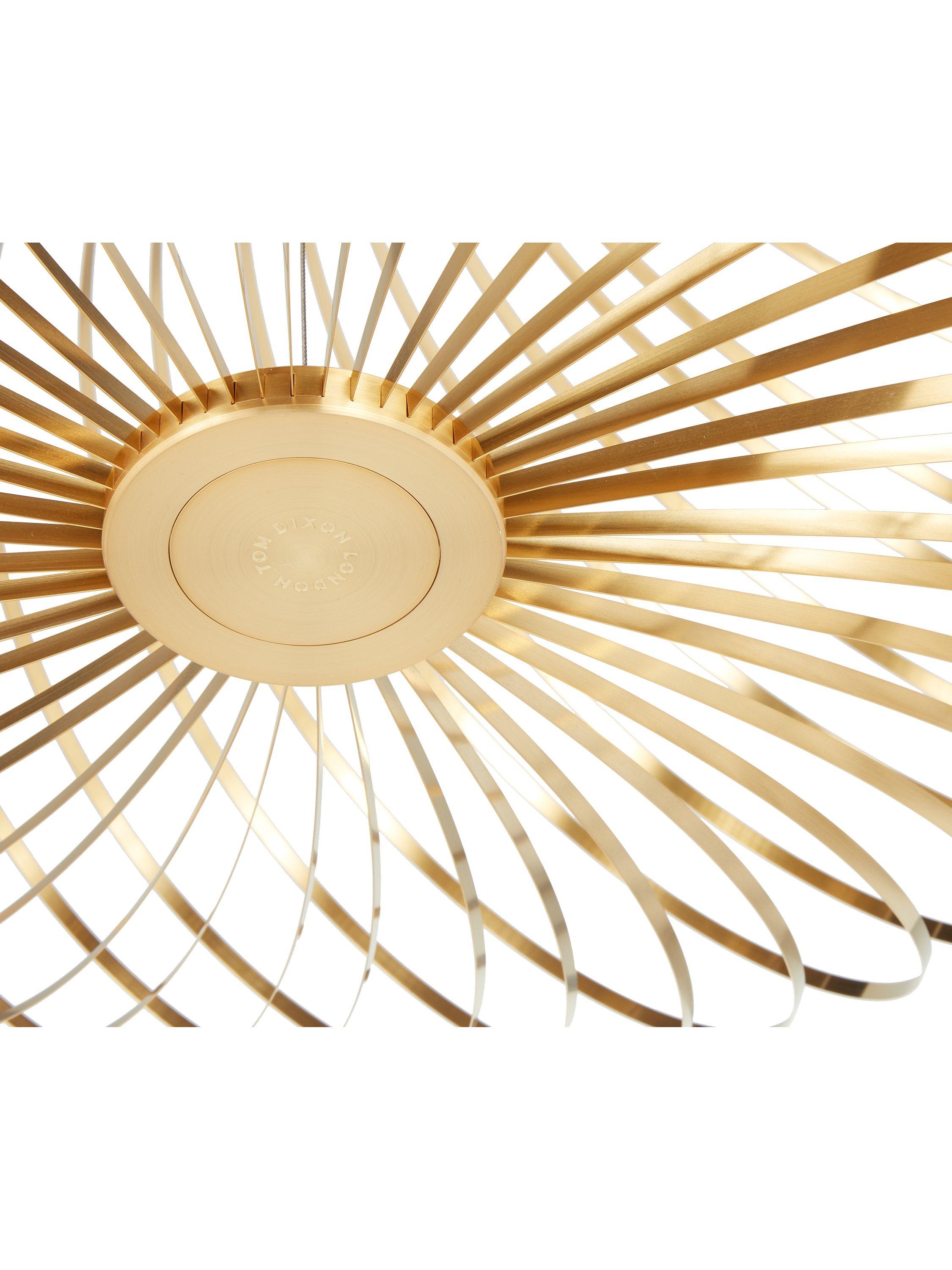 Designed from ribbons of high-performance plated steel and featuring an integrated LED module, the Spring range from Tom Dixon offers a striking lighting solution. The ribbons, finished in either a brass effect or painted white, are arranged like a whisk around the light source to create the pendant's disc silhouette, that allows light to spill through each strand.