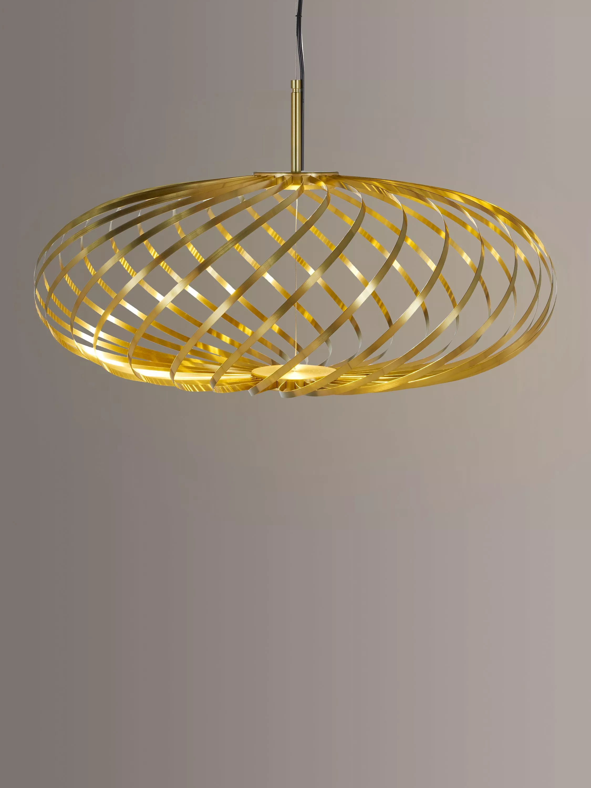 Designed from ribbons of high-performance plated steel and featuring an integrated LED module, the Spring range from Tom Dixon offers a striking lighting solution. The ribbons, finished in either a brass effect or painted white, are arranged like a whisk around the light source to create the pendant's disc silhouette, that allows light to spill through each strand.