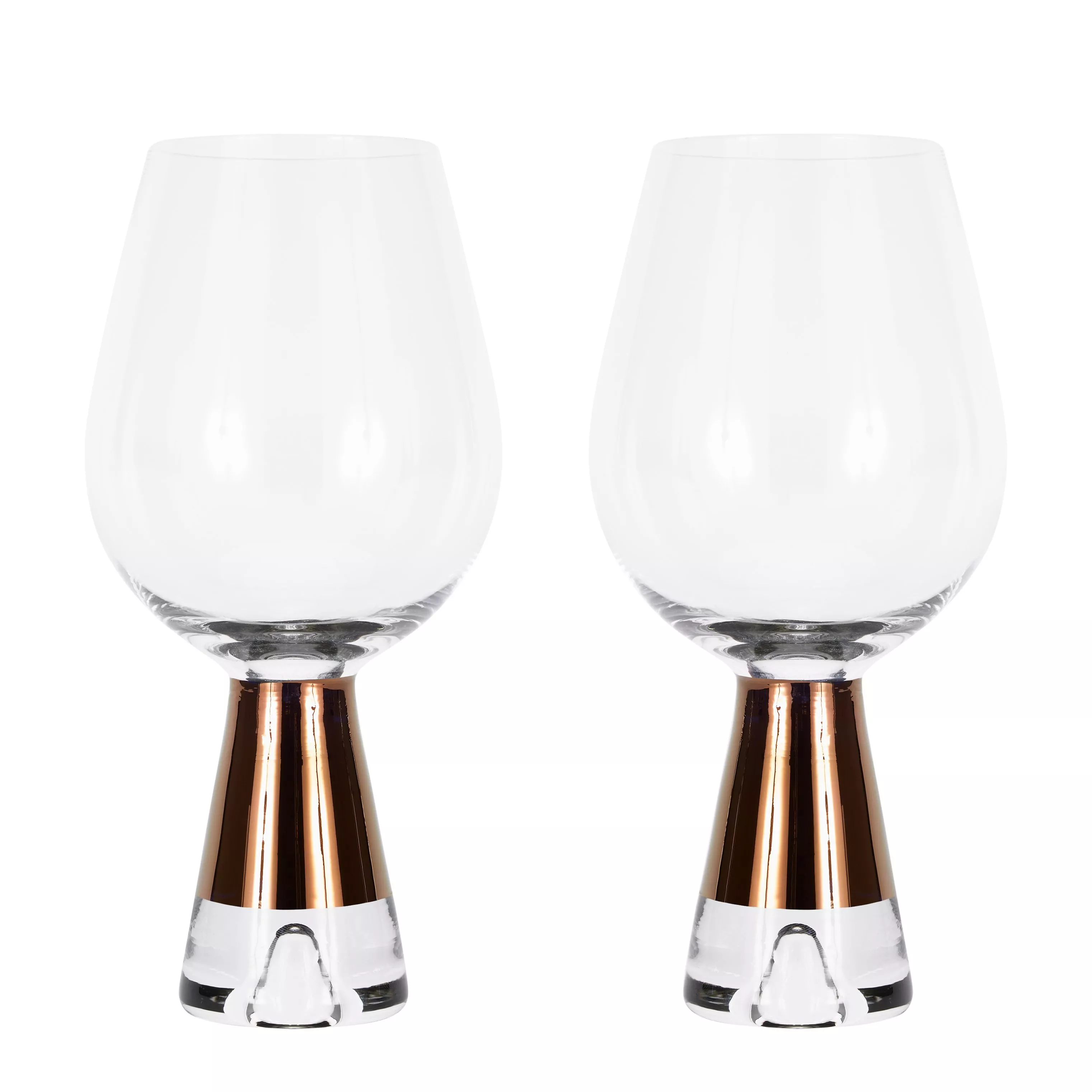 TANK is made from mouth-blown clear glass, defined by their simple shapes that were inspired by the rigour of science laboratory equipment. With crisply cut and polished edges and a sharply applied band of precious metallic copper detailing, these wine glasses provide the perfect functionality for modern drinking.
