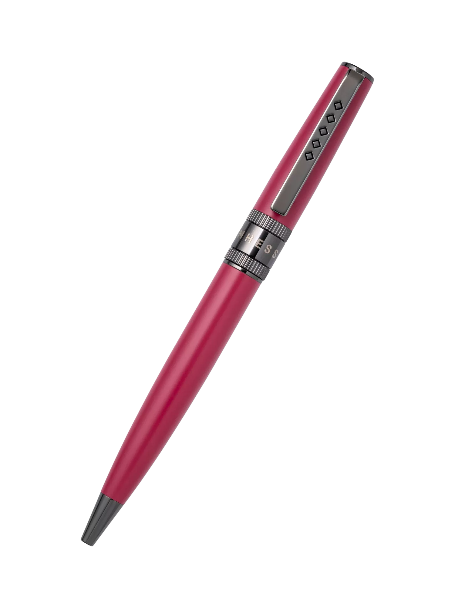It features a tapered lacquer barrel in Jewellers Rouge and a smooth quarter-twist cap mechanism. The central band is engraved with the Tom Hessin logo, adding a refined touch. Gunmetal detailing completes the look, including a decorative band and a matching clip adorned with five diamond-shaped marks — a tribute to the five generations of the Tom Hessin legacy.