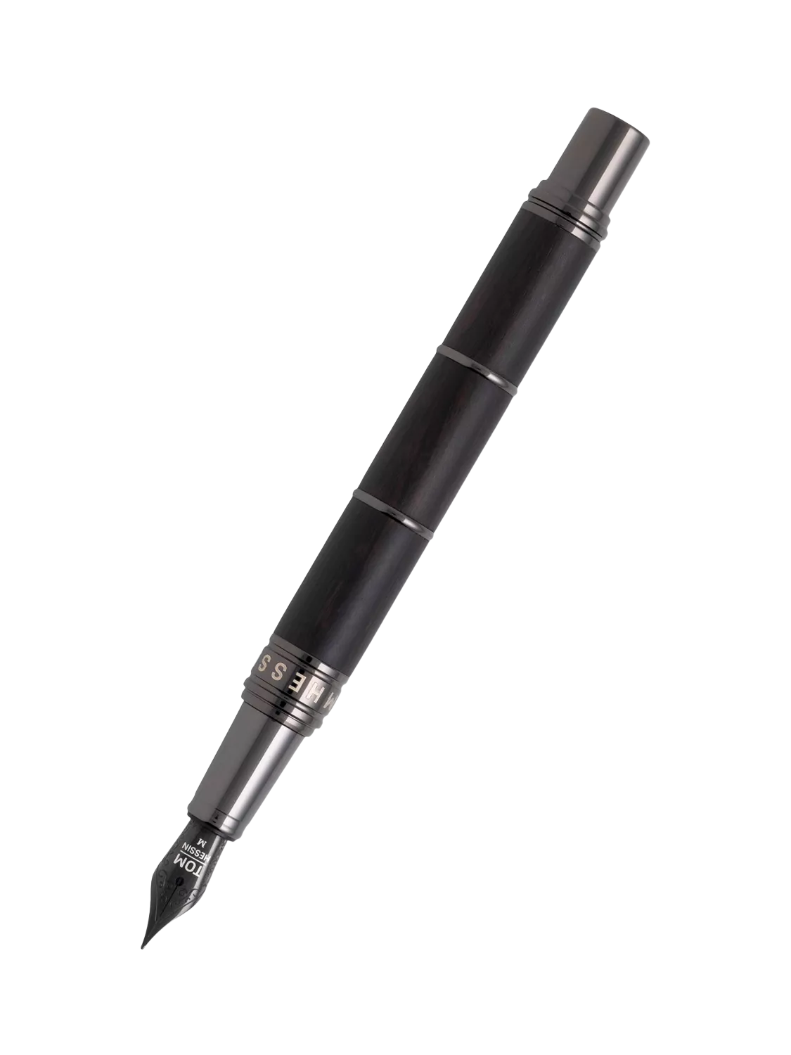 Revolution is style and function. With gunmetal trim, Tom Hessin’s Revolution in Charcoal has an understated sophistication. The ebony wood has a rich dark colour that is accentuated by the (intentionally interrupting) double metal ring detail of the barrel. Pen rests on a soft touch cushion with blue legacy ribbon colourway detail, and blue luxe box with Tom Hessin foil block lid detail.